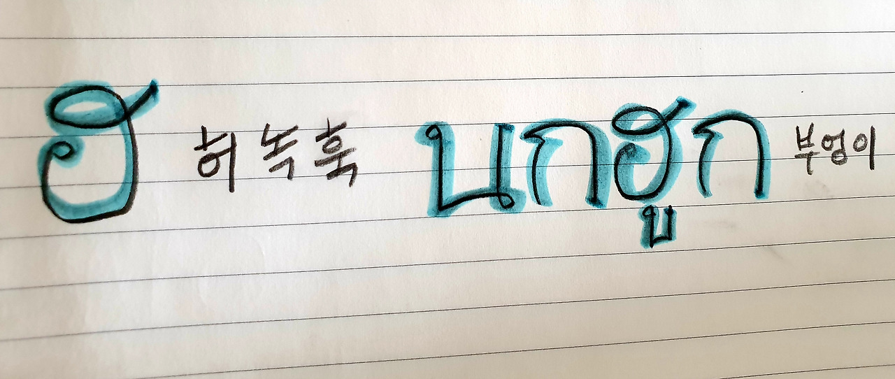 두번째 저자음은 허녹훅이다. 녹훅은 owl 이다. 부엉이. 허녹훅은 H 소리. 즉 히읗이다. 요 단어는 음절에서 항상 앞에서만 쓰인다. 즉 첫 자음으로만 쓰인다. 종자음으로 쓰이는 경우는 없다. 허녹훅을 잘 보라. 마치 부엉이의 눈과 같이 생기지 않았는가. 게다가 부엉이는 훗훗 하고 운다. 그래서 허녹훅은 H 발음이 난다. 하하