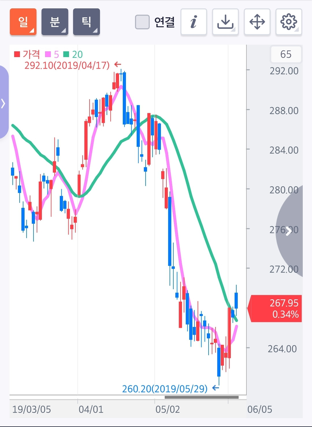 오늘이 6월 6일이니 거의 한 달 전이다. 나는 5일선과 20일선이 꽝 부딪는 그다음 날 매도를 했다. 282.20에. 그러고 나서 보란 듯이 상승을 하기에 조금이라도 수익 날 때 이익 실현할 걸 하는 마음이 강했었다. 그래도 5일선이 20일선 밑에 있으므로 그냥 눈 딱 감고 있었다. 그것이 끝까지 그랬어야 했다. 그러나 한번 이익이 손실로 변하는 과정을 겪은 나는 다시 밑으로 팍팍 떨어지며 매도가 수익을 주자 이제나 저제나 그 이익을 확실히 내 것으로 만들고 싶어 안달을 했다. 그러다가 전 저점 근처에 오자 거의 확신이 들어 잘난척하고 아직 꽝!!! 충돌이 일어난 것도 아닌데 흥! 이익실현인데 모 어때? 반대로 하는 것도 아니요 다만 이익실현을 할 뿐인걸. 하면서 매도한 것을 일찌감치 이익 실현했다. 275.50에. 그리고 얼마나 내려갔는가. 무려 260.20까지 갔으니 캬~ 그대로 두었다면... 15.30 포인트의 수익을 더 올릴 수 있었으니 계산해보면 3,825,000원의 추가 수익이다.