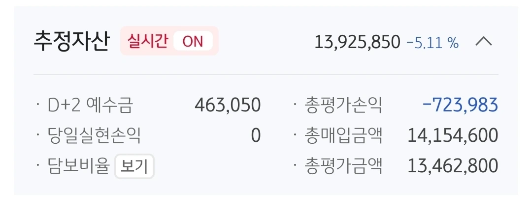 추정자산. 1392만 원. 608만 원 손실 중.
