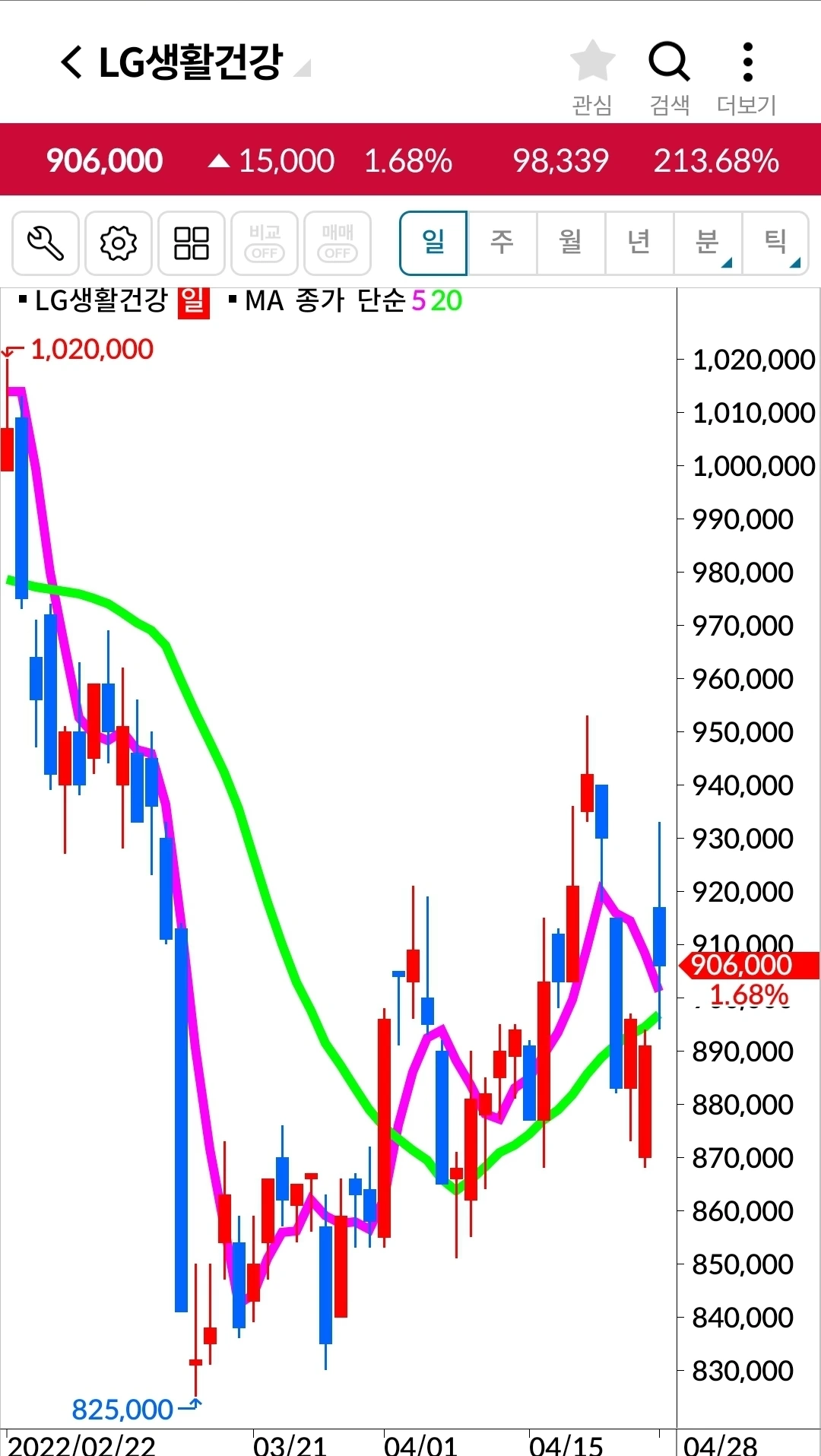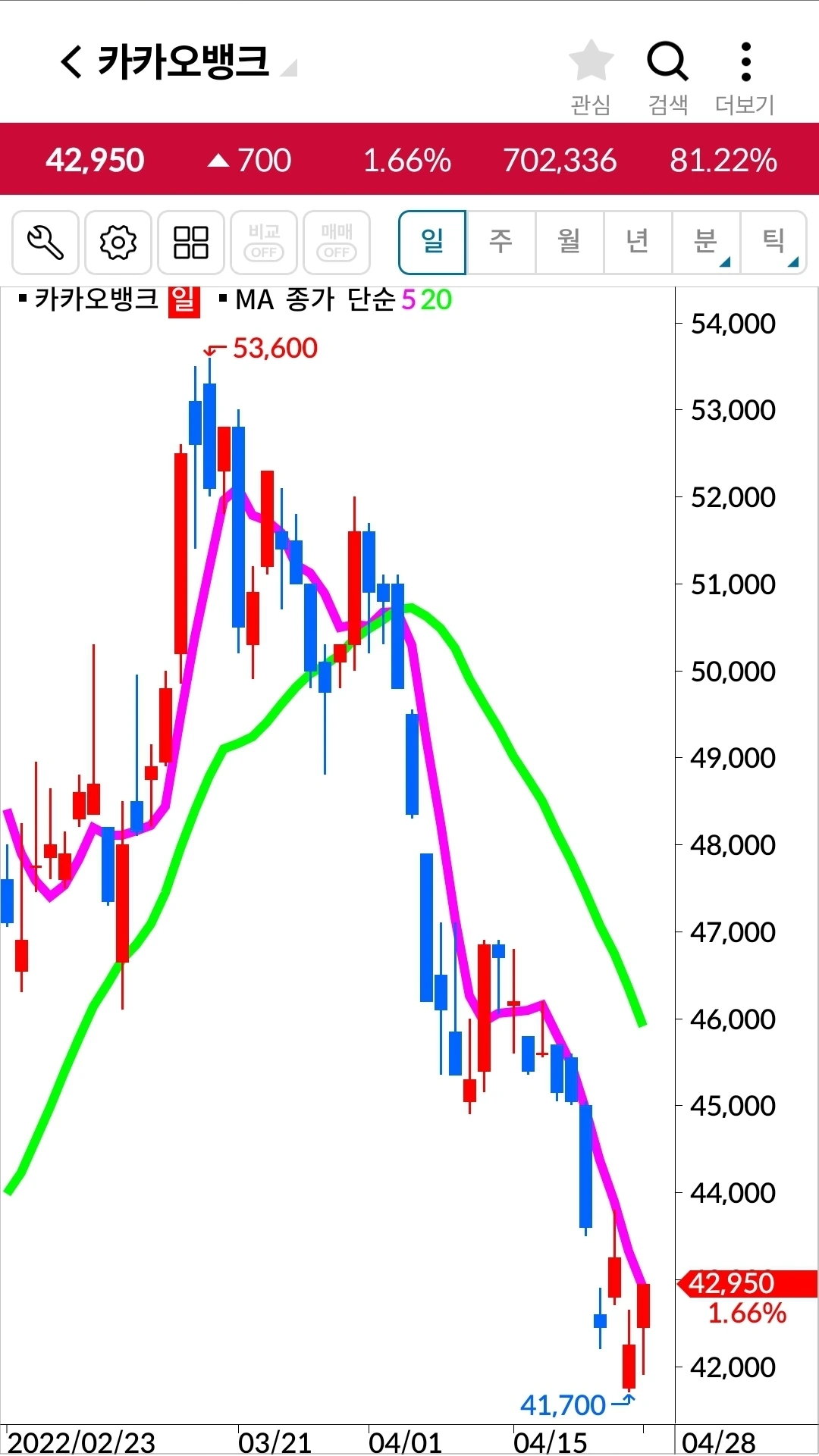 올랐지만 쭉쭉 뻗어나가지 못하고 음봉이다. 잘 지켜보고 낙폭과대주 공략이라는 것으로 시작한 투자가 어떤 결론이 나는지 실제 느껴보자꾸나. 파이팅!