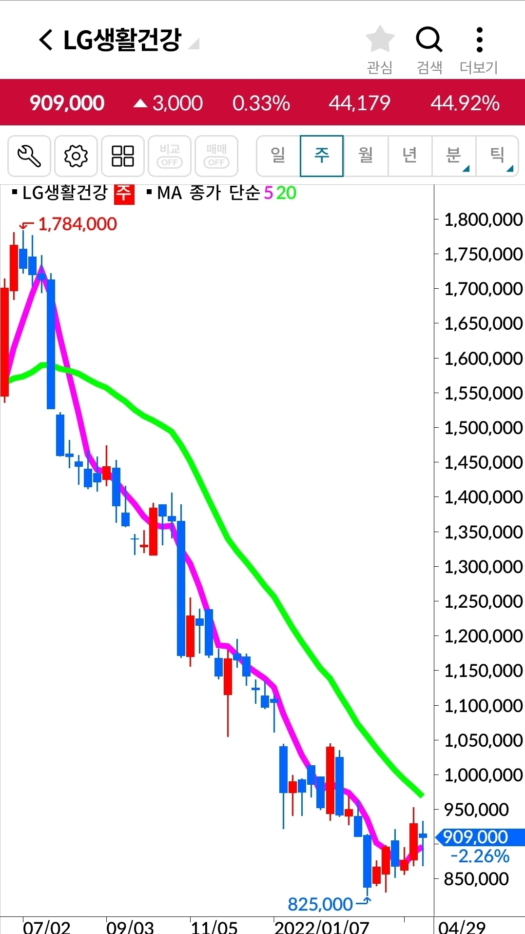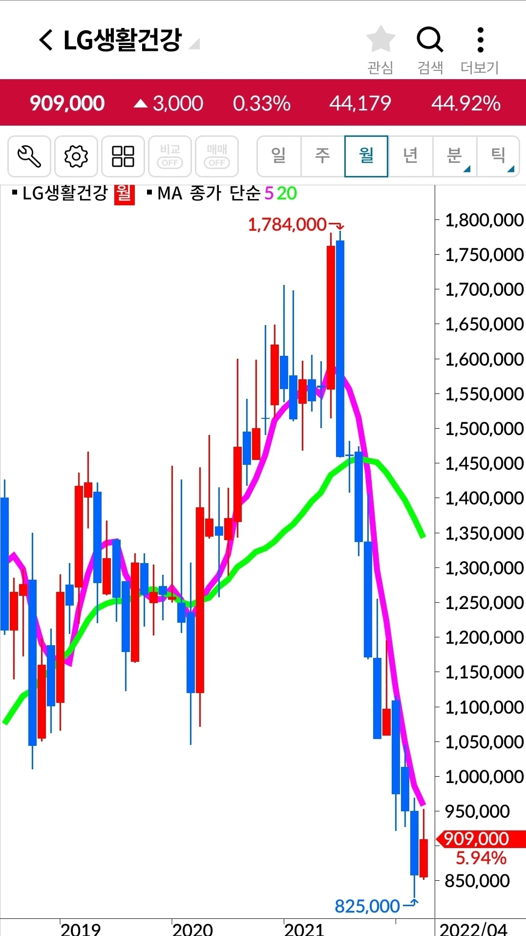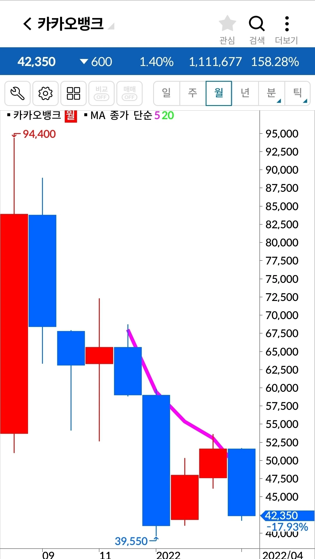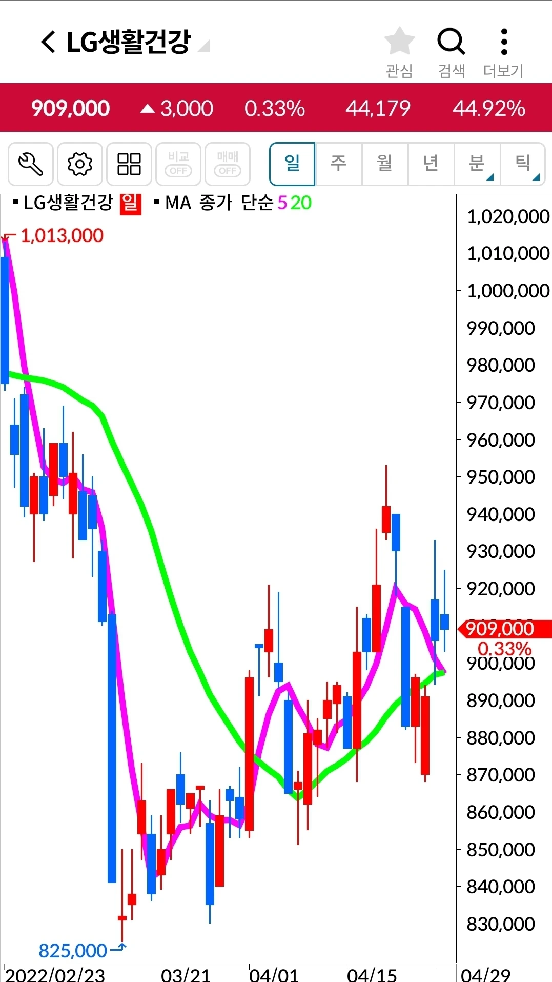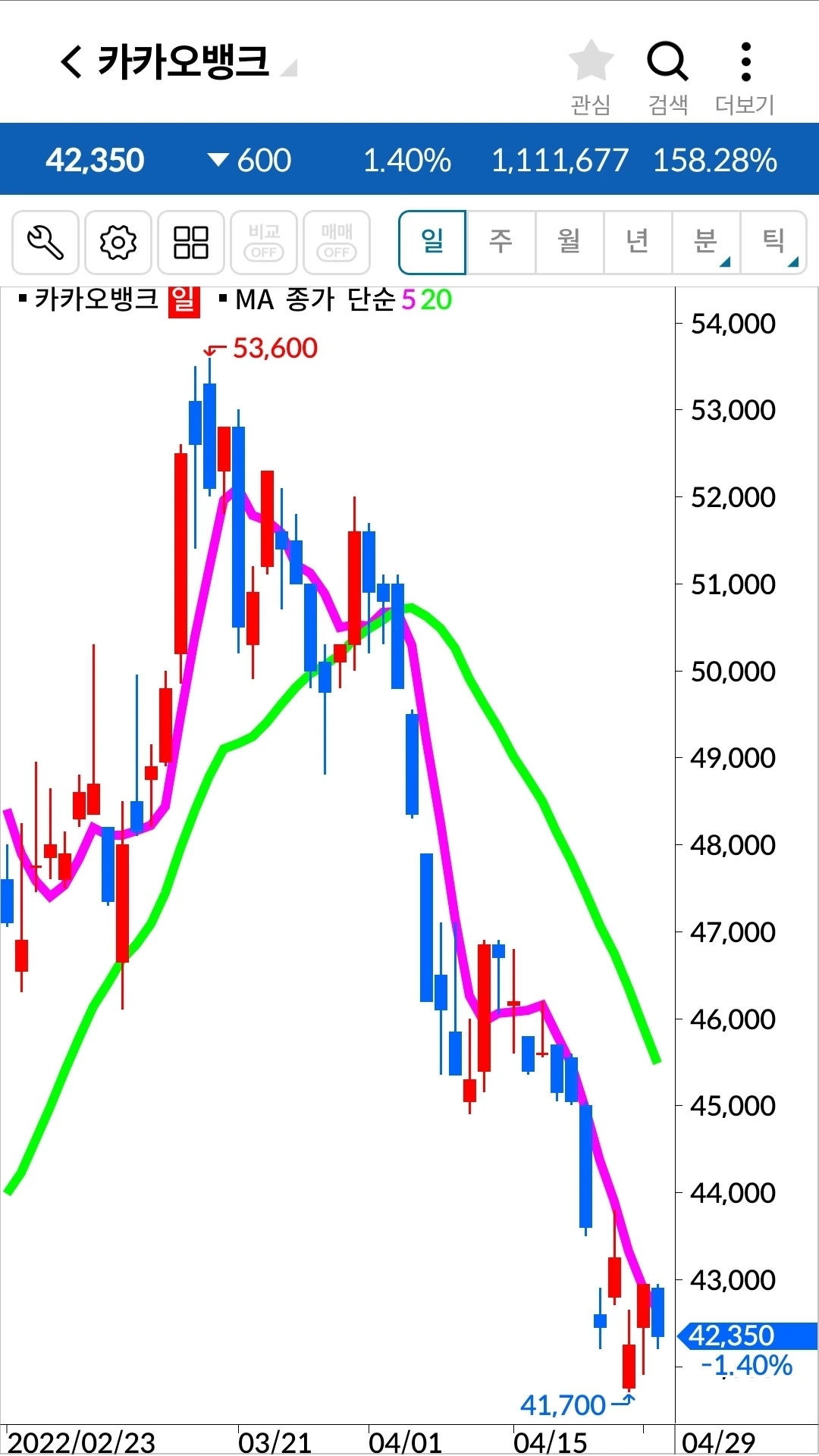 아이고 5일선이 20일선에 딱 붙었다. 내일 올라가지 않으면 5일선은 아래로 뚫고 내려오지 않을까. 그래도 난 이걸 낙폭과대라고 들어간 것이므로 아마 5일선이 20일선 아래로 내려간다 해도 그 어떤 행동도 아니할 수 있다.