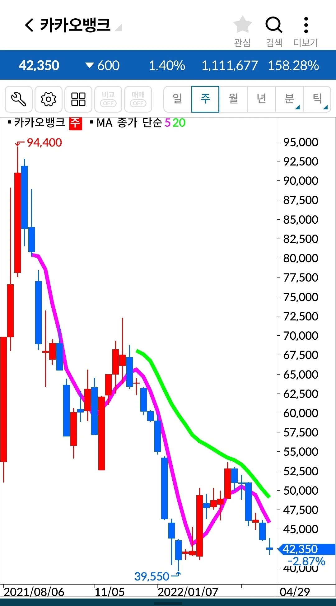 끝없이 내려가는구나. 5일선 법칙을 지켰으면 어땠을까 싶다. 이것도 할 수 없다. 낙폭과대라고 나름 골라서 들어간 것이니 기다려주리라. 파이팅.
