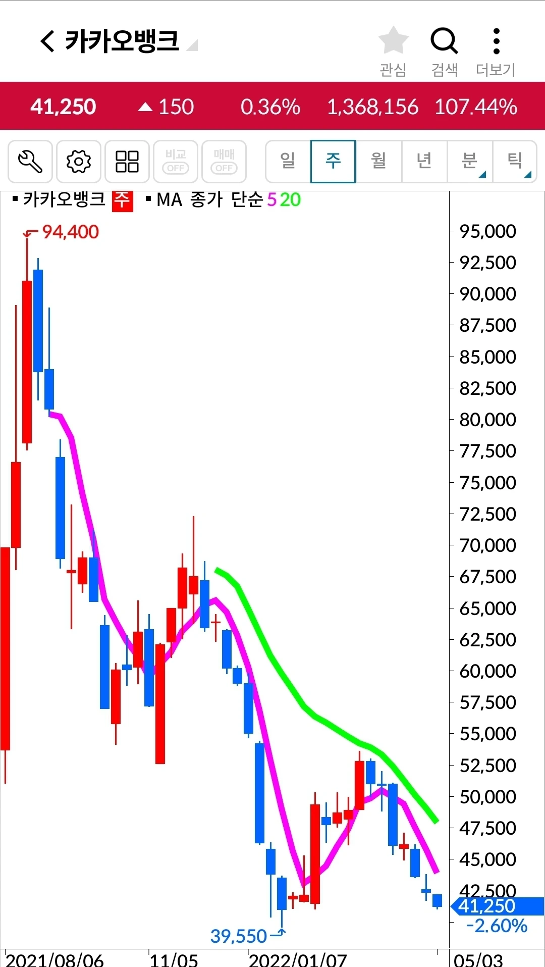 카카오 뱅크. 2만 원 수익중.