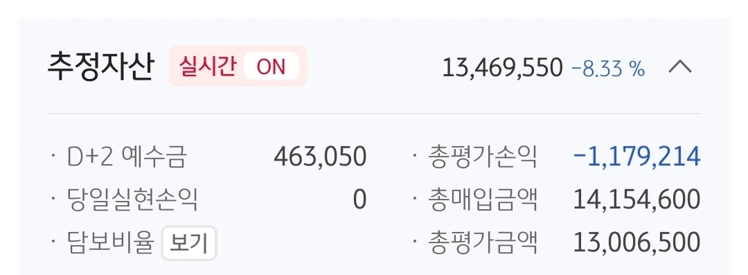 추정자산. 1346만 원. 654만 원 손실 중.