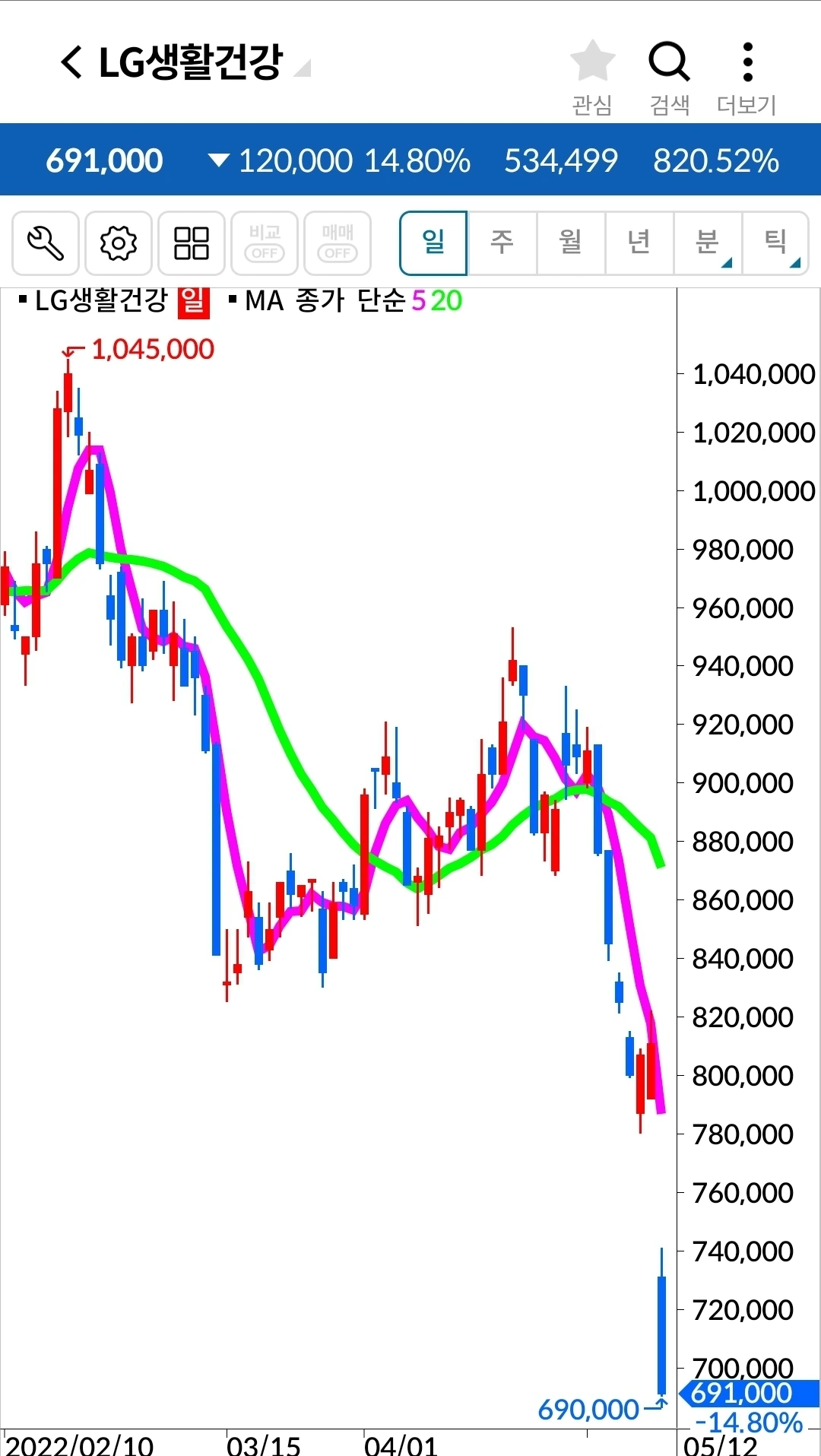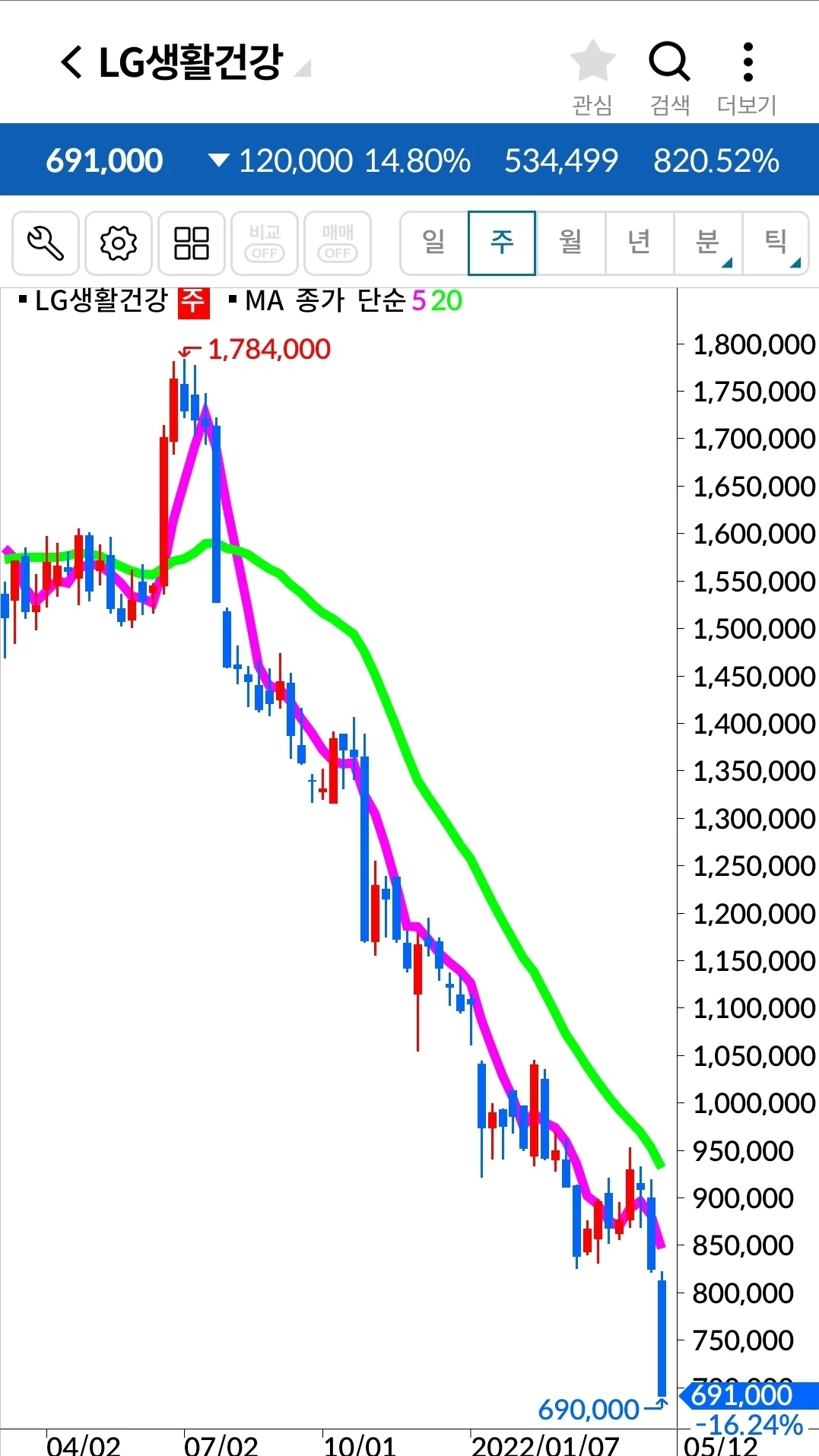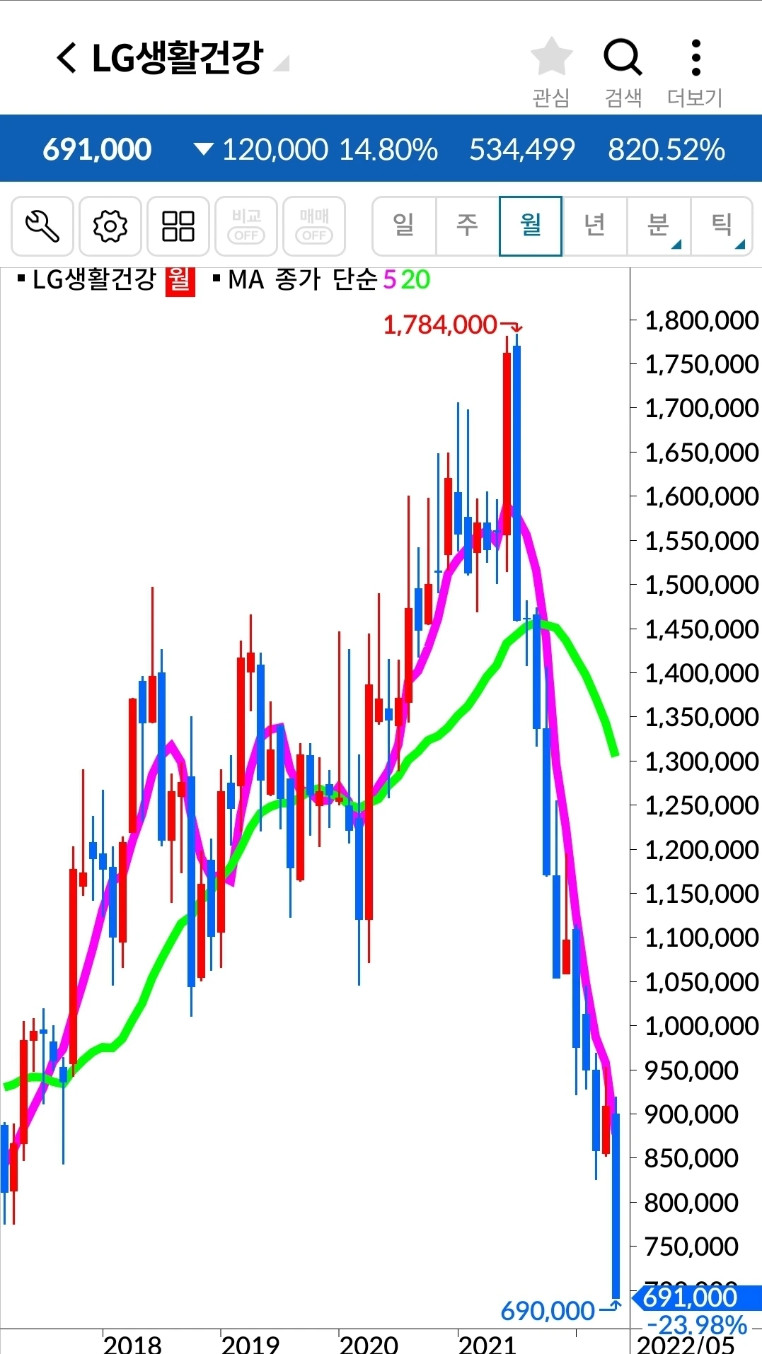 꼭 LG생활건강뿐 아니라 대세하락엔 견뎌낼 재간이 있는 종목이 거의 없다. 대부분 이렇게 무시무시한 하락을 한다. 아. 내가 옛날 원칙만 지켰어도 그땐 손실 같아도 아주 작은 손실에서 막을 수 있었을 것을. 5만 원대에서 데드크로스가 났는데 과대 하락 운운하며 버틴 결과 3만 원대까지 내려왔으니 말이다. 과대 하락인지 아닌지를 내가 도대체 어떻게 판단한다고. 하이고다 정말.