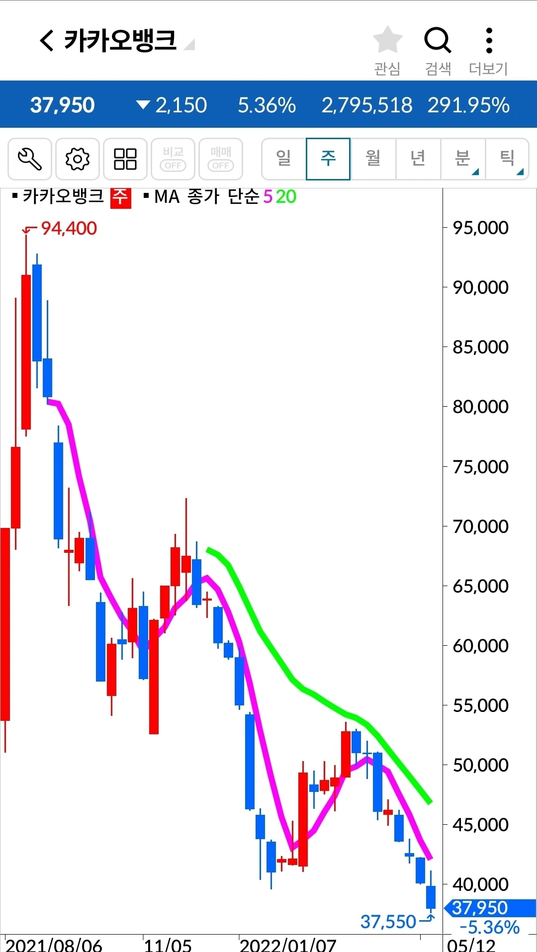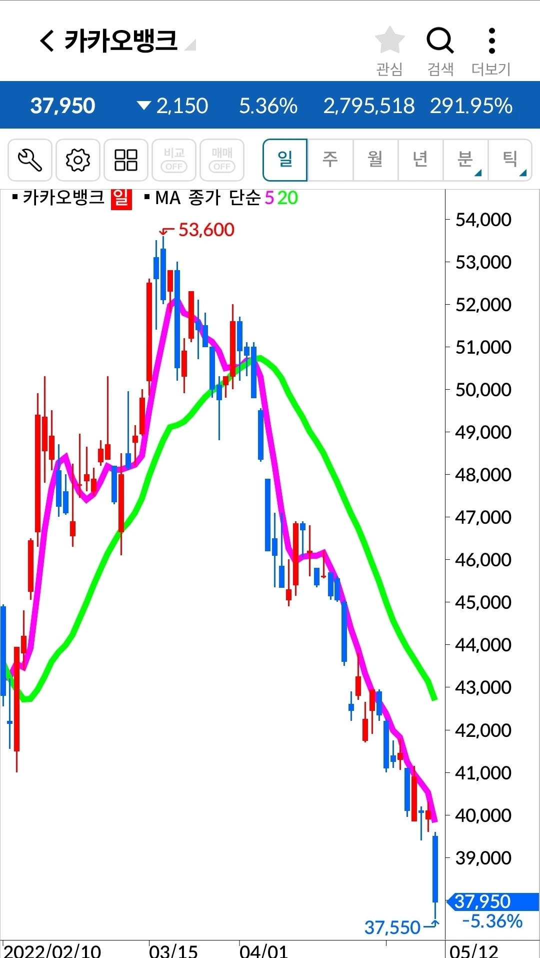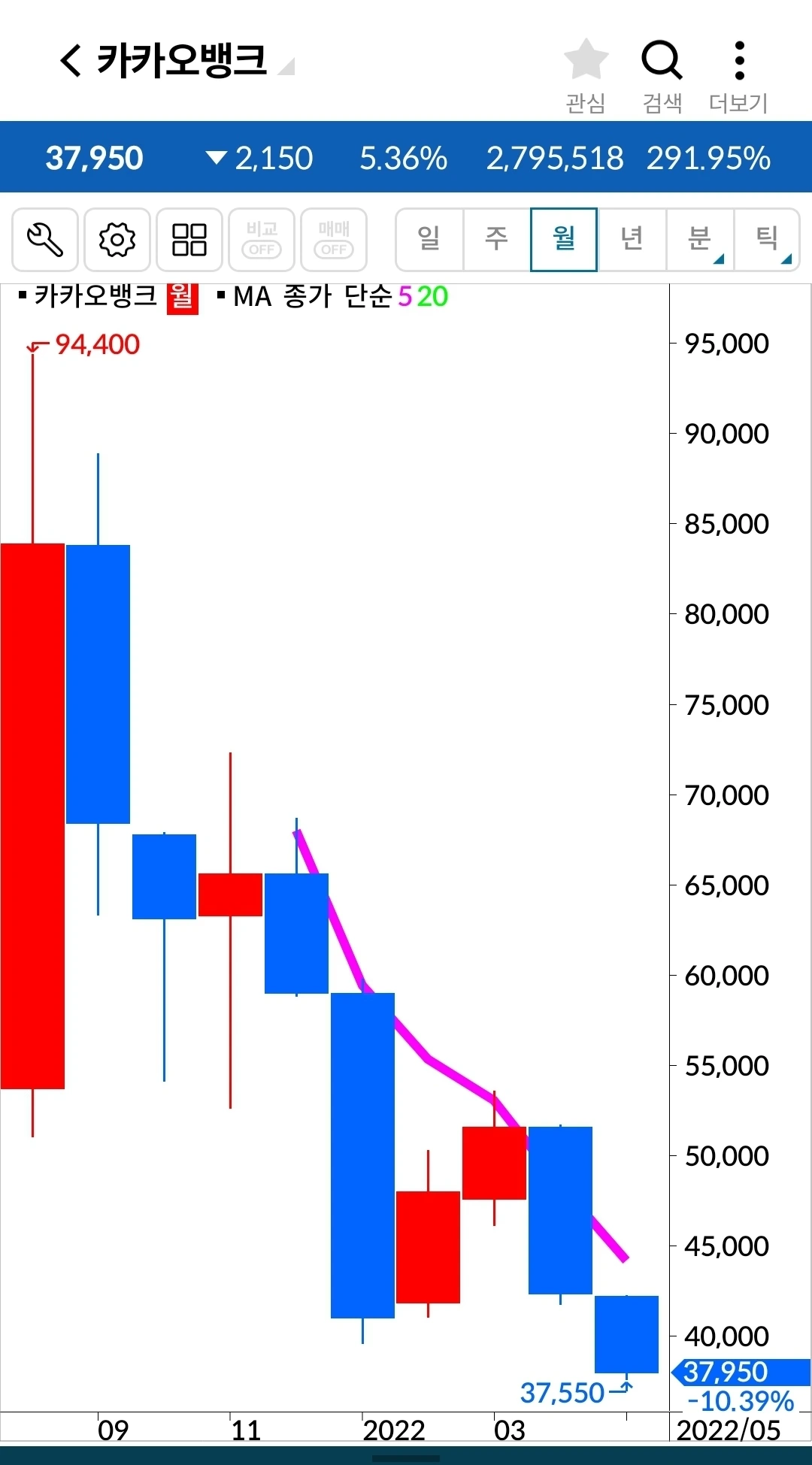 꼭 LG생활건강뿐 아니라 대세하락엔 견뎌낼 재간이 있는 종목이 거의 없다. 대부분 이렇게 무시무시한 하락을 한다. 아. 내가 옛날 원칙만 지켰어도 그땐 손실 같아도 아주 작은 손실에서 막을 수 있었을 것을. 5만 원대에서 데드크로스가 났는데 과대 하락 운운하며 버틴 결과 3만 원대까지 내려왔으니 말이다. 과대 하락인지 아닌지를 내가 도대체 어떻게 판단한다고. 하이고다 정말.
