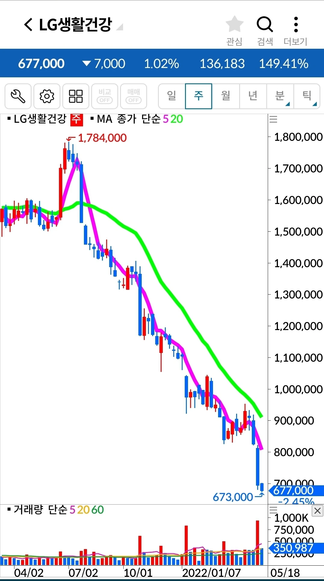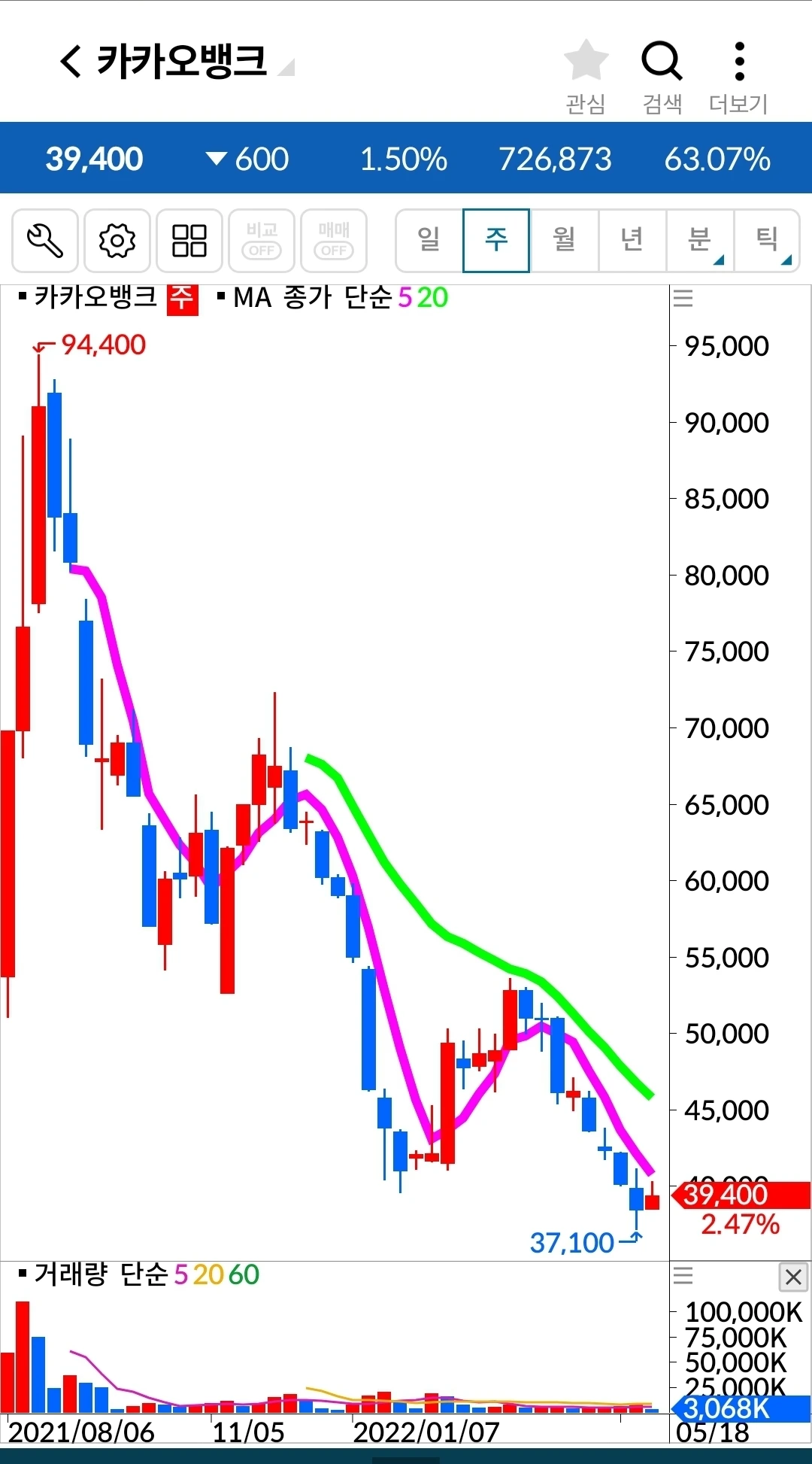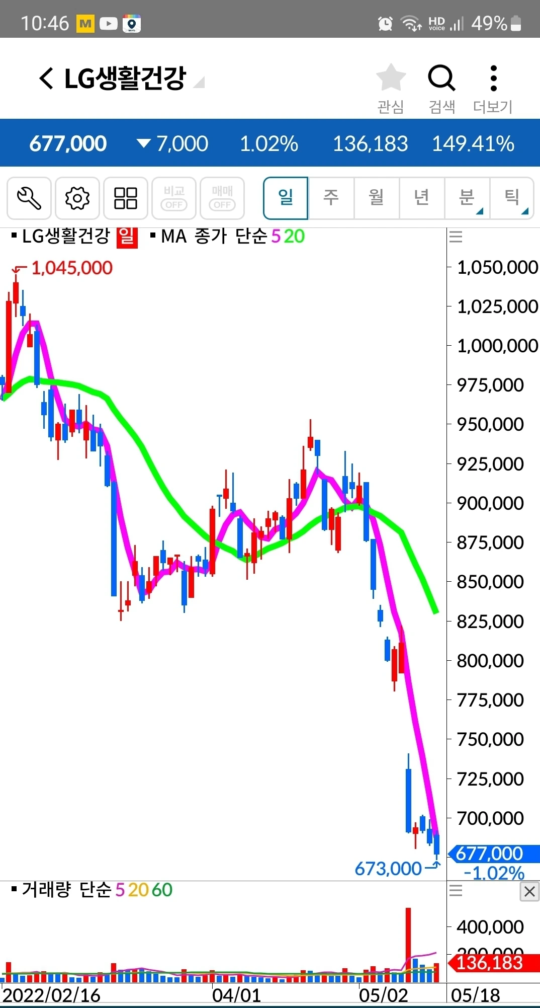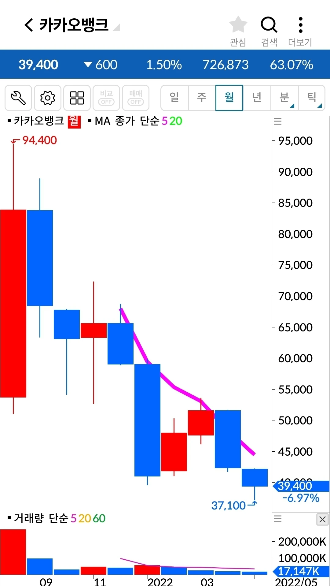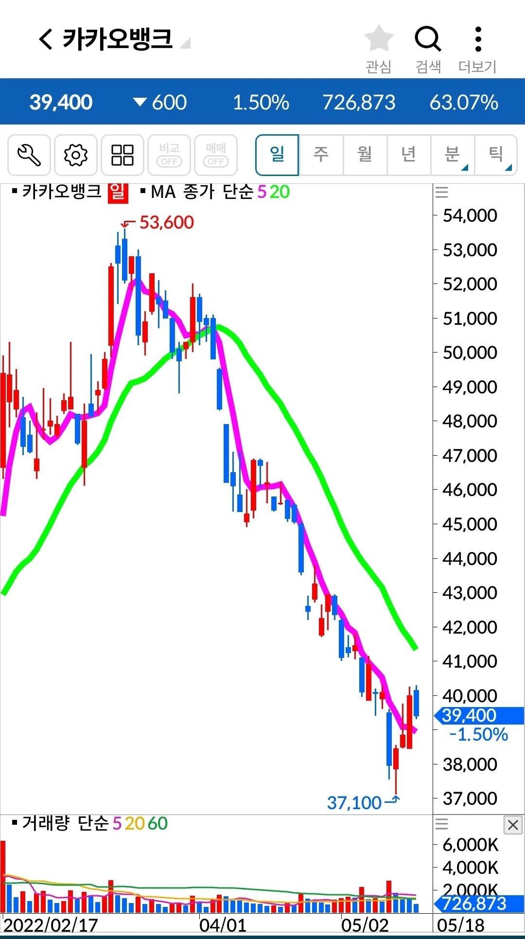 이것 역시 내려가는 그림. 올라가는 거에 매달려야지 와이 과대 하락 운운하며 이렇게 확실하게 우하향 내려가고 있는 종목을 골랐을 고. 이젠 방법이 없다. 기다리는 수밖에. 에고고다 정말.