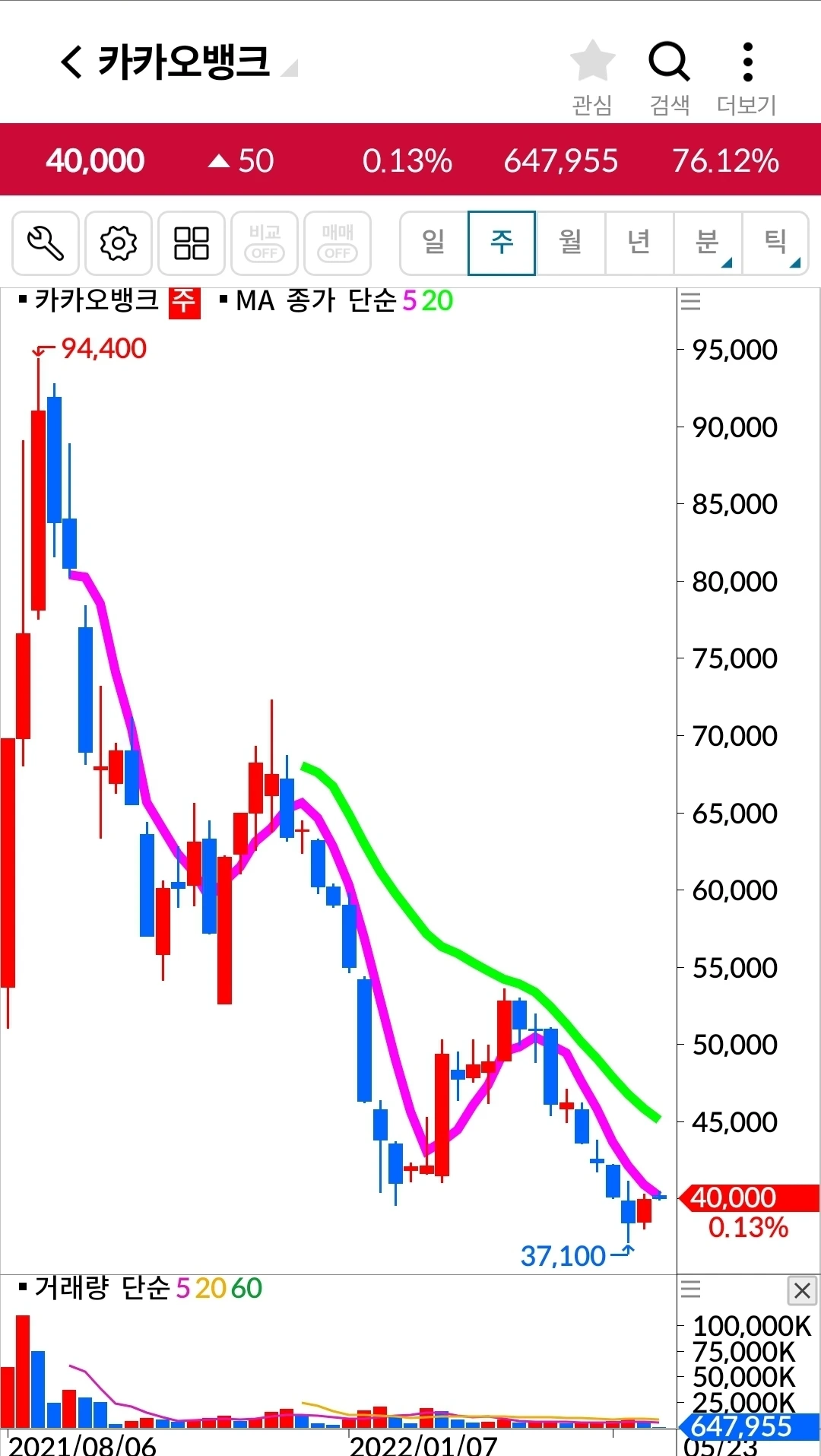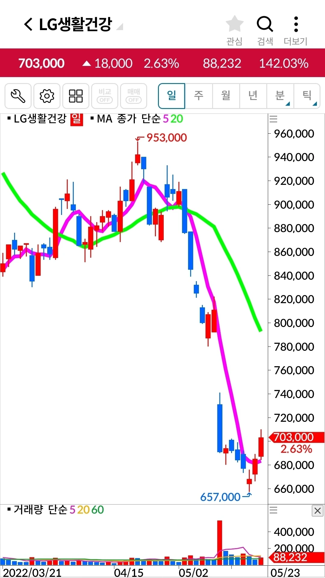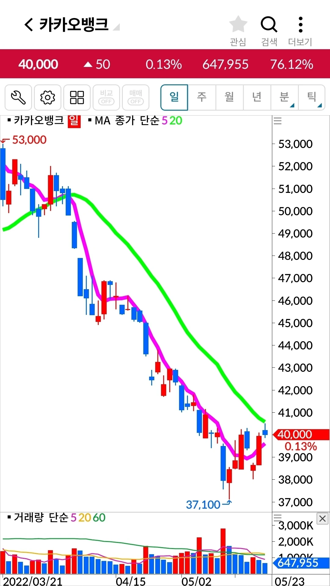 전일 고점을 뚫는 양봉이 세 개. 기대해볼 만하다. 파이팅!