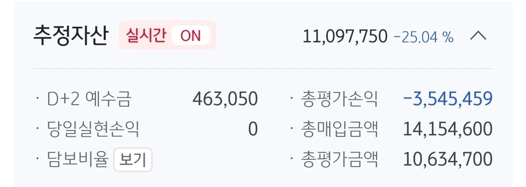 추정자산. 1109만 원. 891만 원 손실 중.