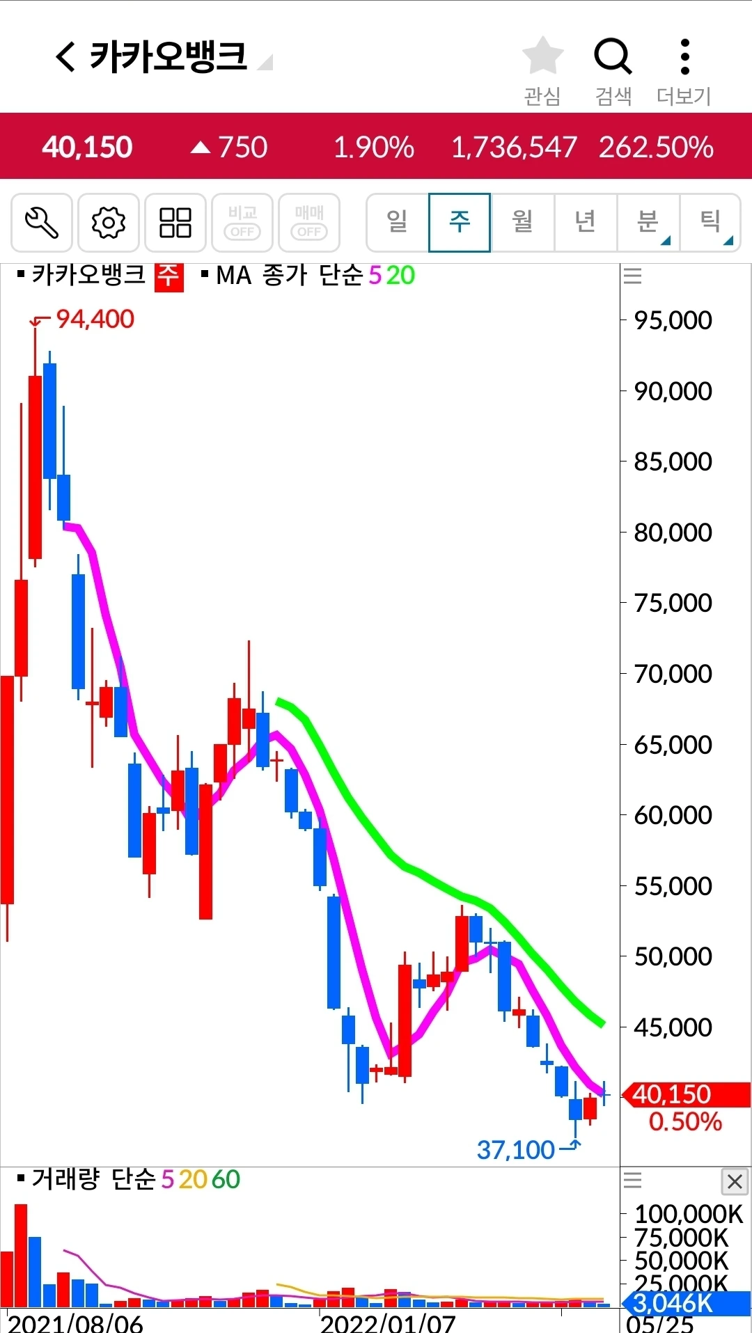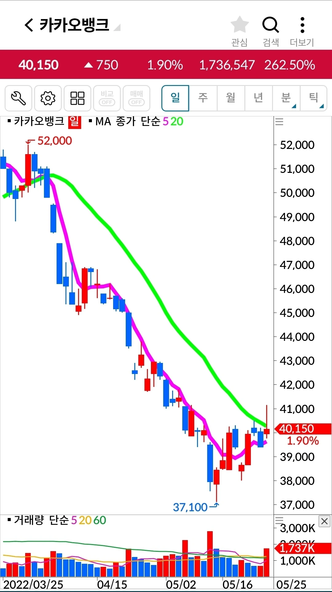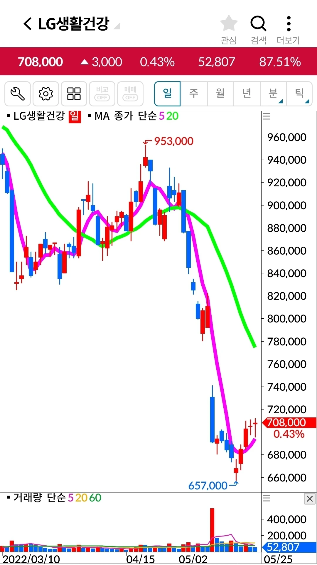 5일선이 우상향으로 방향을 바꾸었다는데 희망을 갖는다. 오래오래 기다리리라. 파이팅! 하하