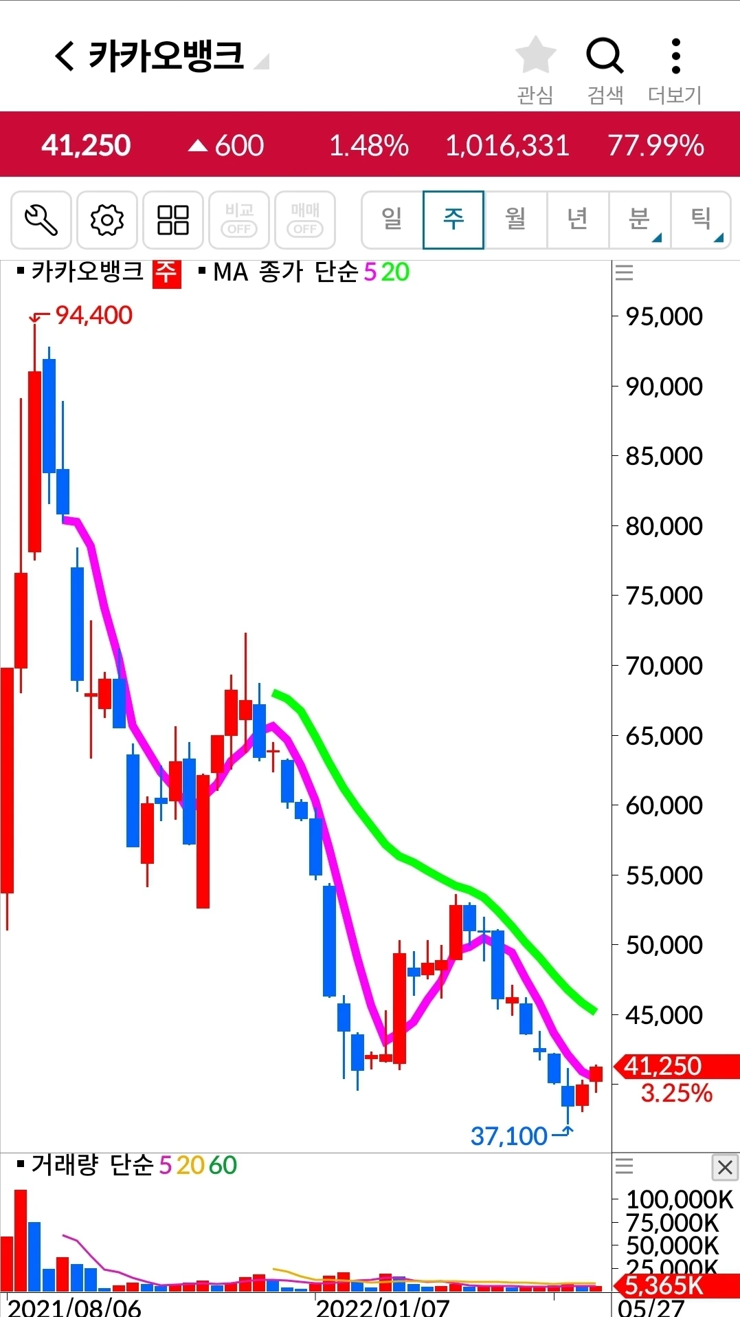 카카오 뱅크. 5일선이 20일선 위로 빠꼼히 고개를 내밀었다. 푸하하하 바로 요때가 내가 매수하던 때이다. 이제 올라왔으니 이제부터라도 나의 그 옛날 매매를 되찾을꼬나. 파이팅!