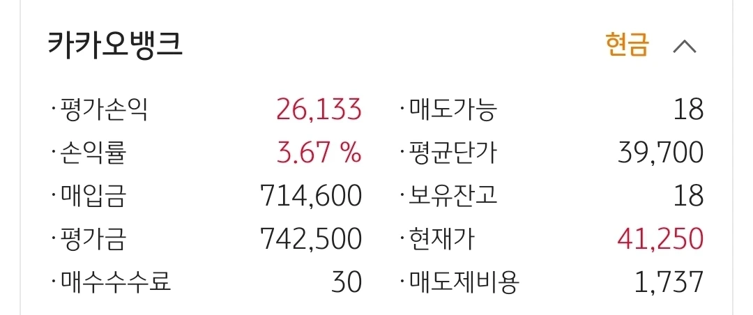 카카오 뱅크. 2만 원 수익 중.