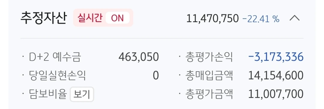추정자산. 1147만 원. 853만 원 손실 중.