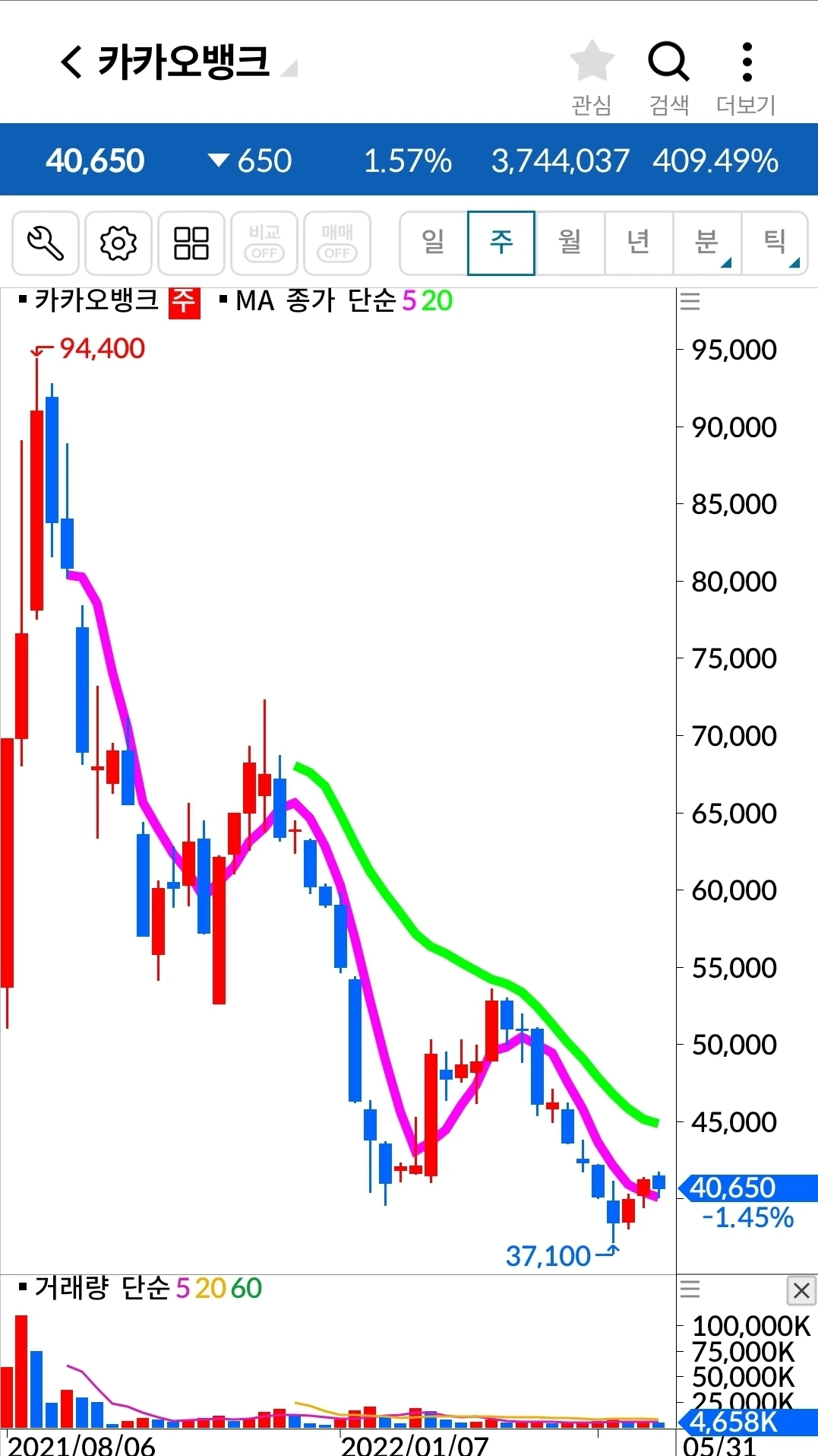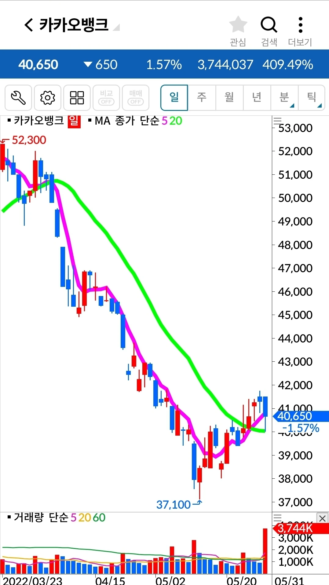 전일 저점을 건드리며 아래로 쑥 내려온 음봉. 조금 쉬어가려나? 그래도 난 기다려준다. 기다리기 작전이다. 하하.