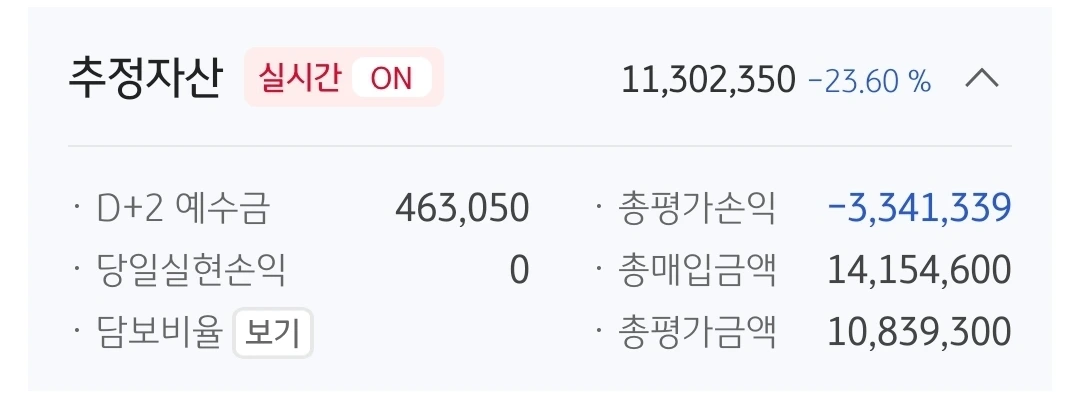 추정자산. 1130만 원. 870만 원 손실 중.