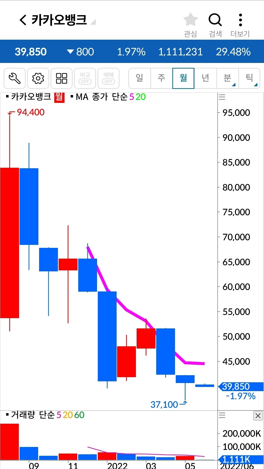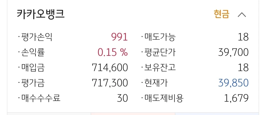 카카오 뱅크. 900원 수익 중.