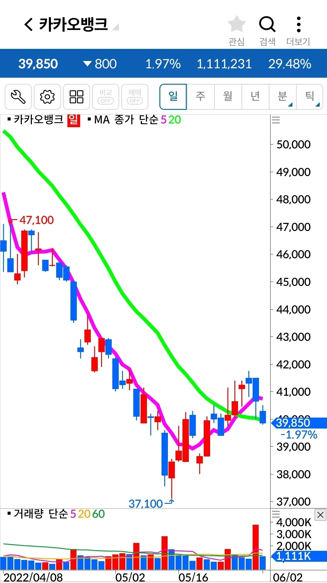 5일선과 20일선이 딱 닿으려 하고 있다. 조금만 더 힘내거라. 파이팅! 하하