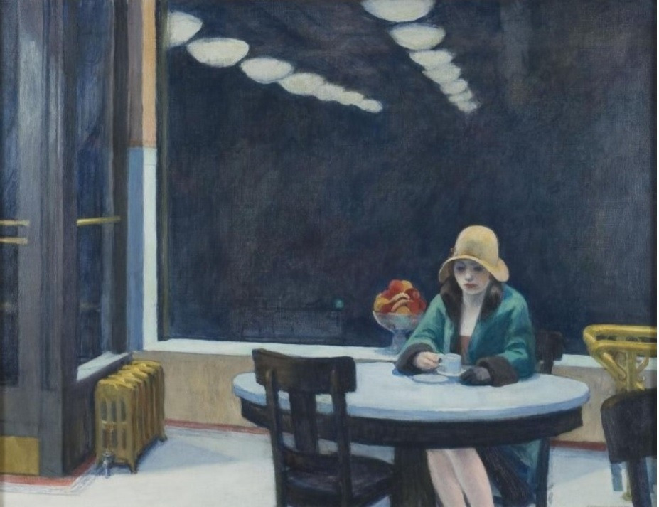 사진은 에드워드 호퍼의 1927년 작품 "자동 판매식 식당"이다. 알랭 드 보통의 "슬픔이 주는 기쁨"이라는 책은 이 그림으로 시작한다. "화가 에드워드 호퍼의 그림은 슬프지만 우리를 슬프게 하지 않는다. 여자가 혼자 앉아 커피를 마시고 있다. 늦은 시간이다. 여자의 모자와 외투로 보건대 밖은 춥다. 실내는 넓고, 불이 환하고, 텅 비어 있는 것 같다. 장식은 기능적이다. 돌을 얹은 탁자, 튼튼하게 만든 검은 나무 의자, 하얀 벽, 여자는 사람을 꺼리는 듯하고 약간 겁을 먹을 듯한 느낌도 든다. 그녀는 공공장소에 혼자 앉아 있는 것에 익숙하지 않은 것 같다. 뭔가 일이 잘못된 느낌이다. 그녀는 자기도 모르는 사이에 보는 사람에게 그녀와 관련된 이야기, 배신이나 상실의 이야기를 상상하게 만든다. 그녀는 커피를 입으로 가져가면서 손을 떨지 않으려고 애를 쓴다. 북아메리카의 어느 큰 도시의 2월의 밤 11시쯤일 것 같다."