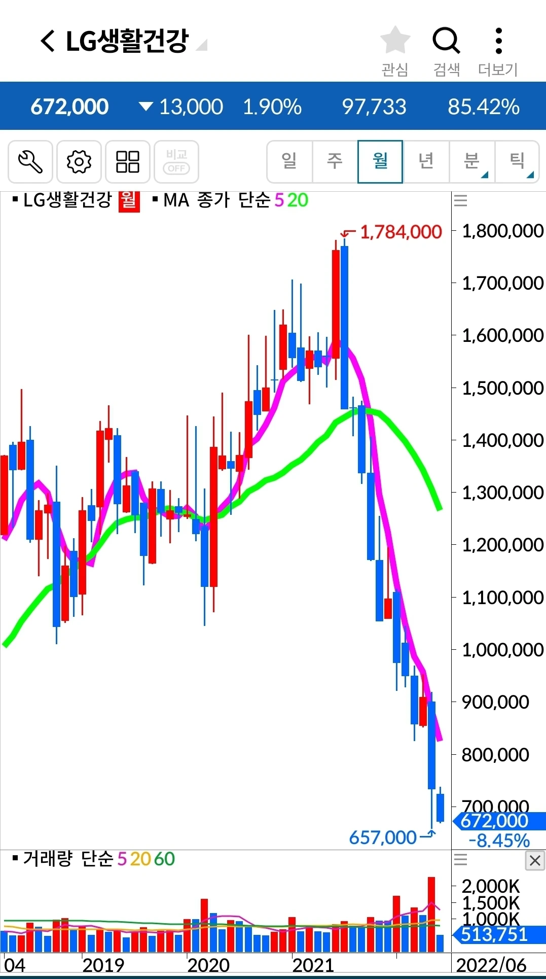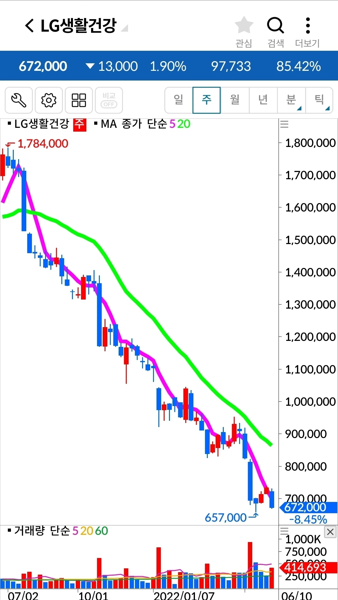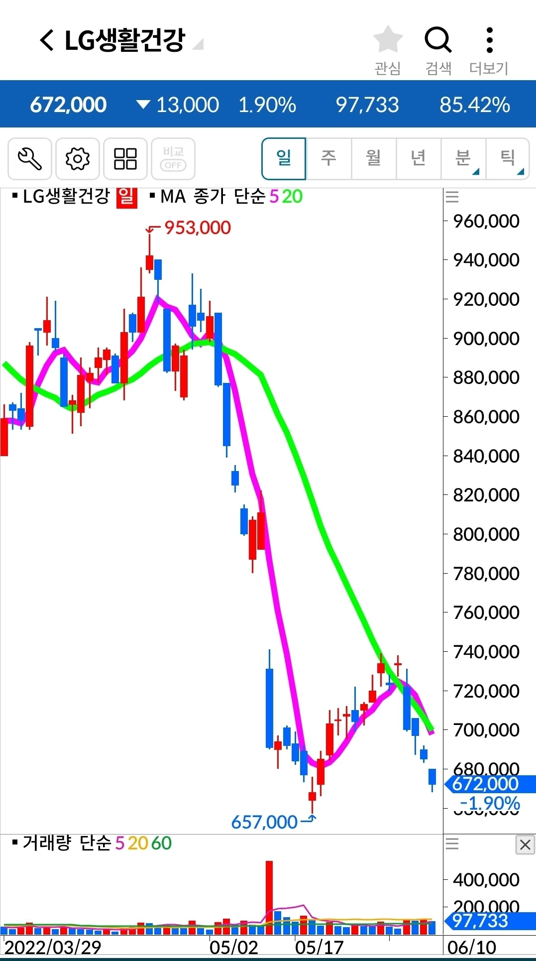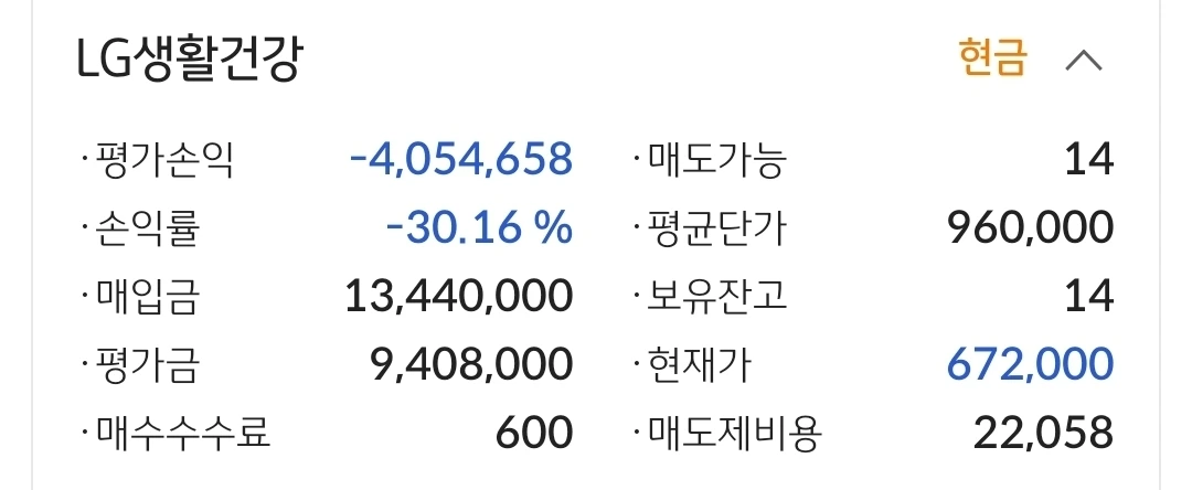 LG생활건강. 405만 원 손실 중.