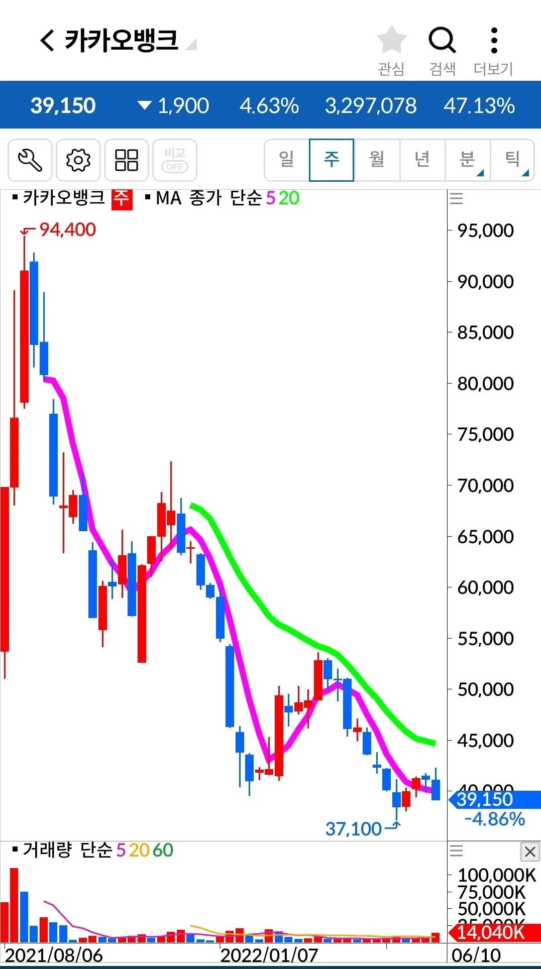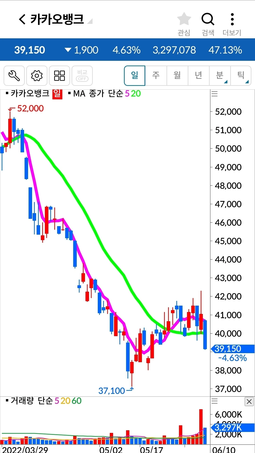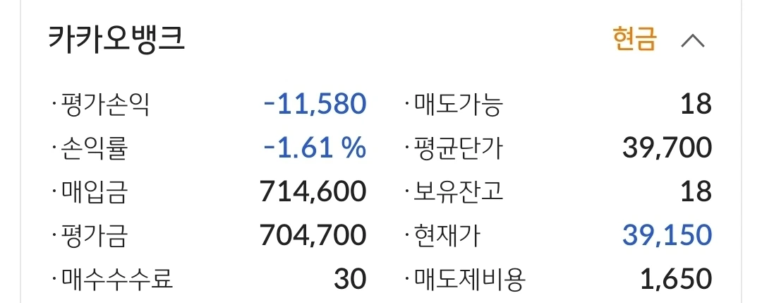 카카오 뱅크. 1만 원 손실 중.