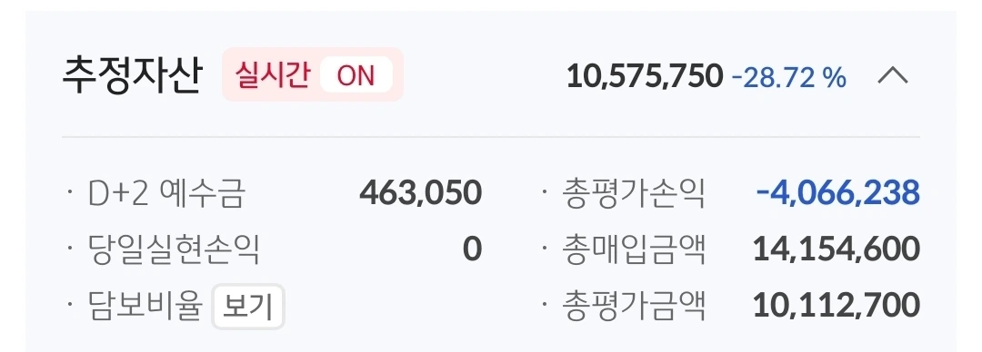 추정자산. 1057만 원. 943만 원 손실 중.