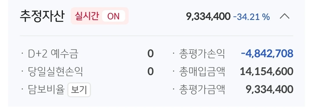 추정자산. 933만 원. 2000만 원에서 선물계좌로 옮긴 43만 원을 빼면 1957만 원이 나의 원금이다. 그러니까 1957만 원에서 933만 원을 빼면 현재 1,024만 원의 손실 중이다.