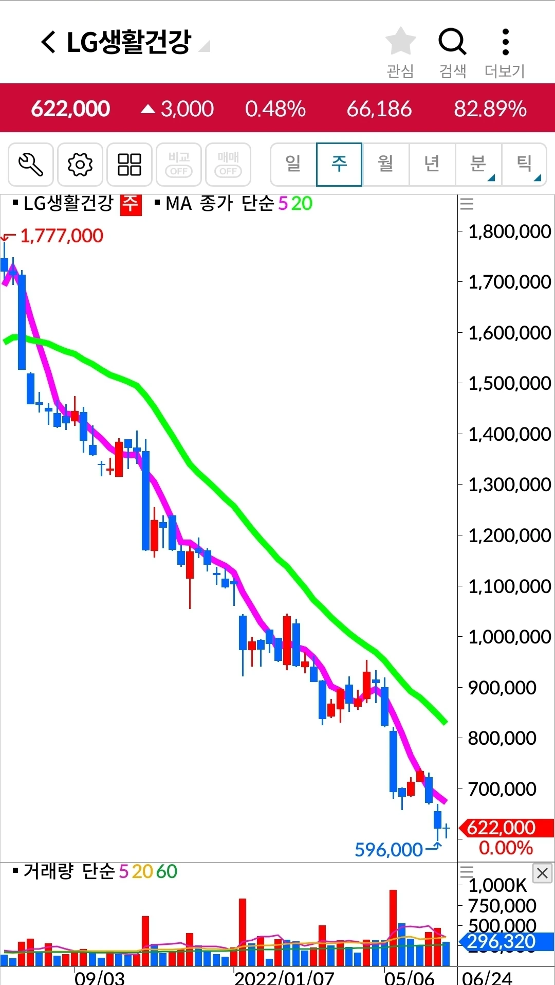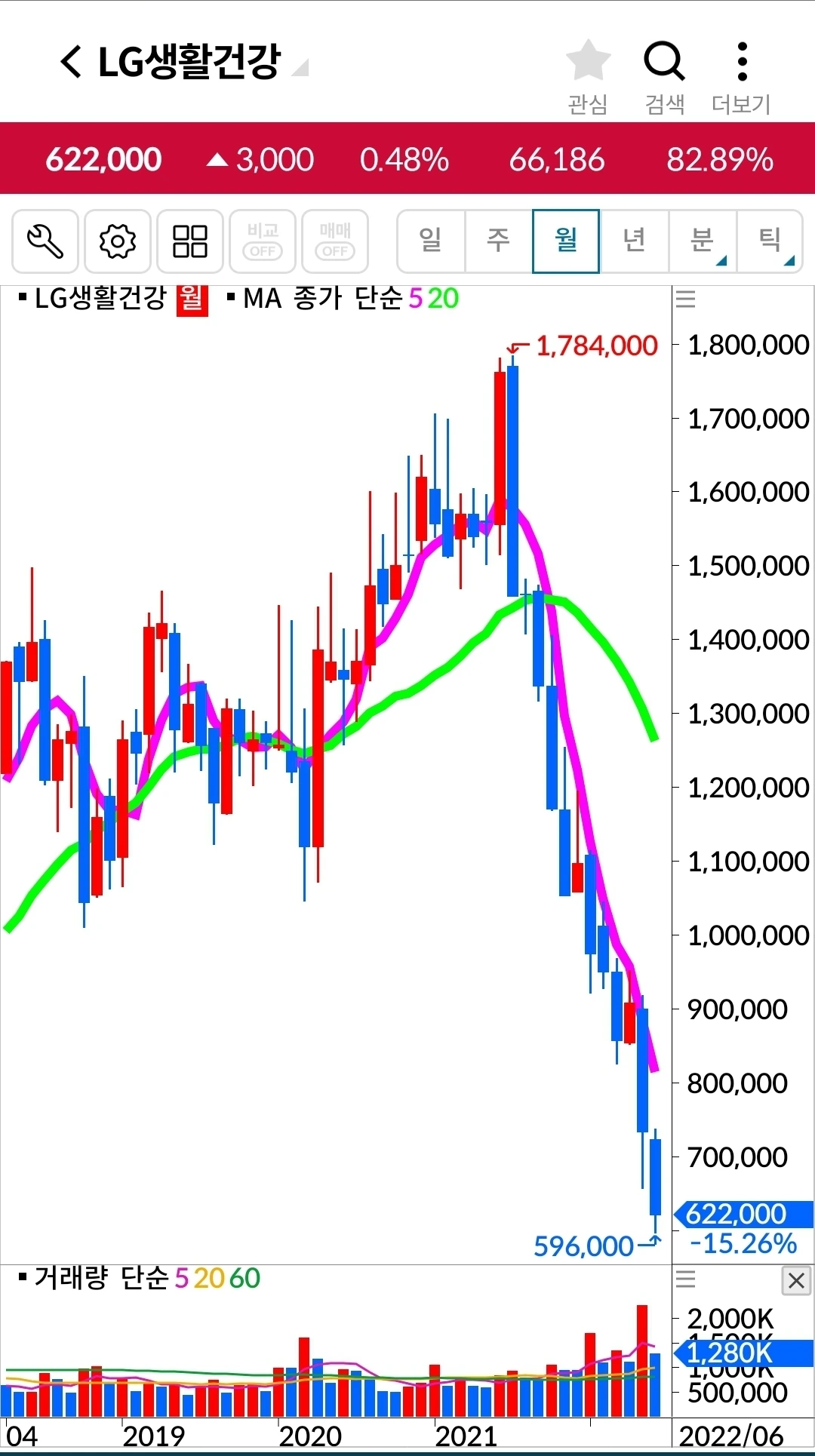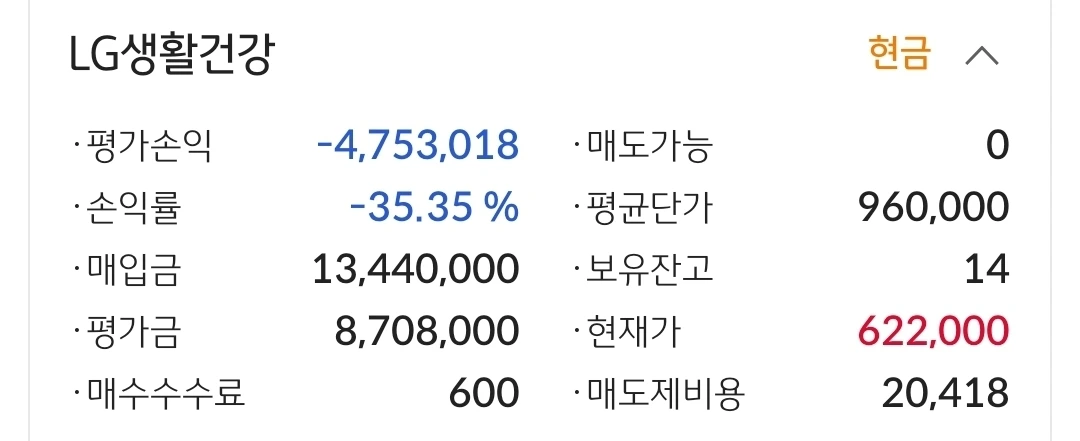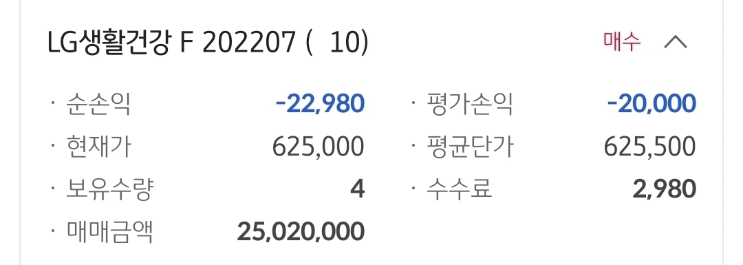 LG생활건강 주식선물 7월 물. 2만 원 손실 중.