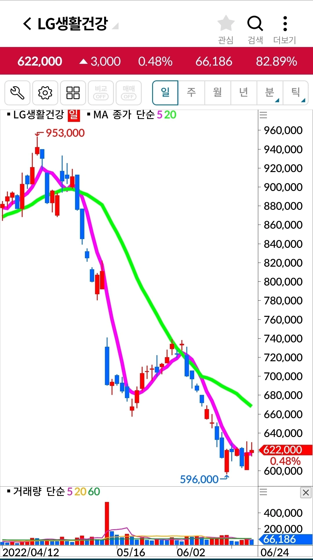 그러니까 내가 겁도 없이 주식선물을 왕창 샀다. 200만 원 비자금을 남편 몰래 넣고 현물 주식을 대용 잡아 무려 4개의 LG생활건강 주식선물 7월 물을 샀다. 이것은 현물 40개의 효과다. 사실 삼성전자 선물을 사려고 했지만, 그래도 내가 LG생활건강으로 물려있으니 이걸 물 타기 해야 지하는 생각에 했는데 잘못된 생각이었다. 삼성전자는 빵! 올랐는데 이건 거래량도 적고 별로 오르지도 않았으니까. 왜 삼성전자 때문에 감히 주식선물을 생각했으면서 실행할 때는 LG생활건강으로 했을까? 주식과 결혼하면 안 된다는데 난 그 어떤 의리감에 같은 종목을 샀다. 별로 잘한 결정 같지는 않다. 그러나 이제 서서히 반등이 노려지는 시점 같고 주식선물로 빨리 원금을 회복하고픈 마음이 강하다. 도전!이라고 해봤으니 잘 지켜보자. 파이팅!