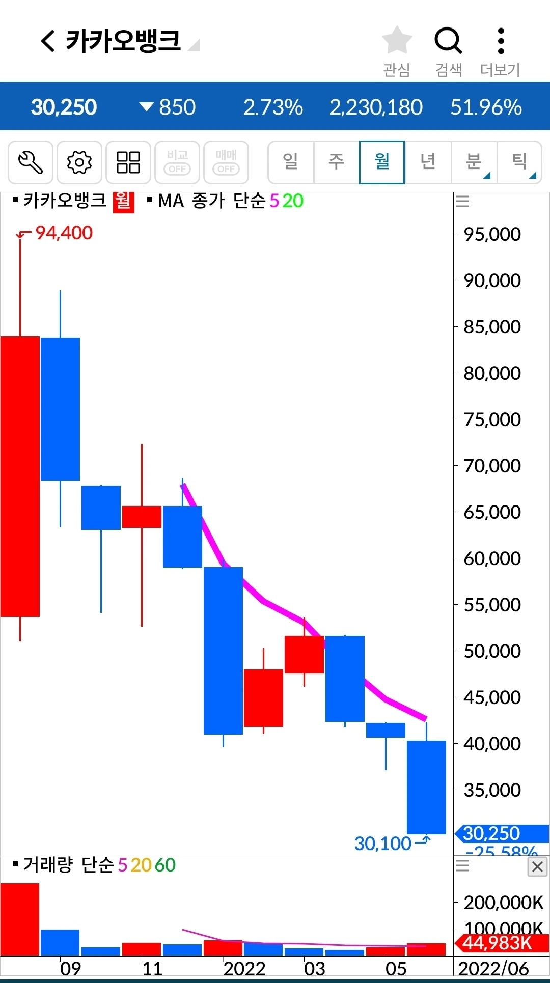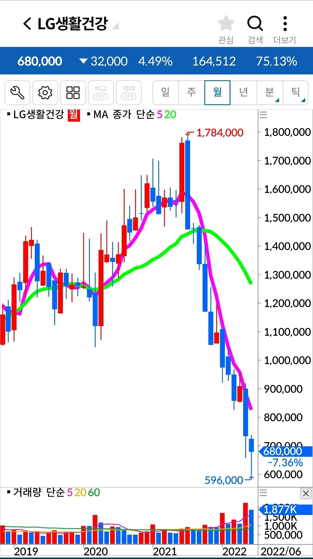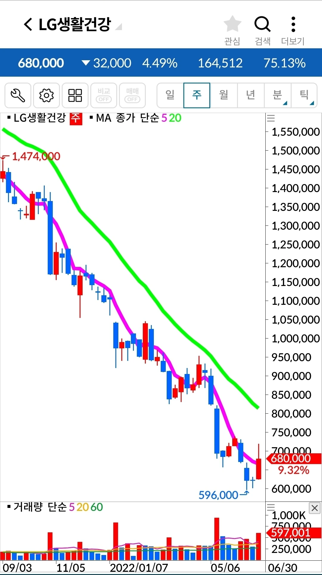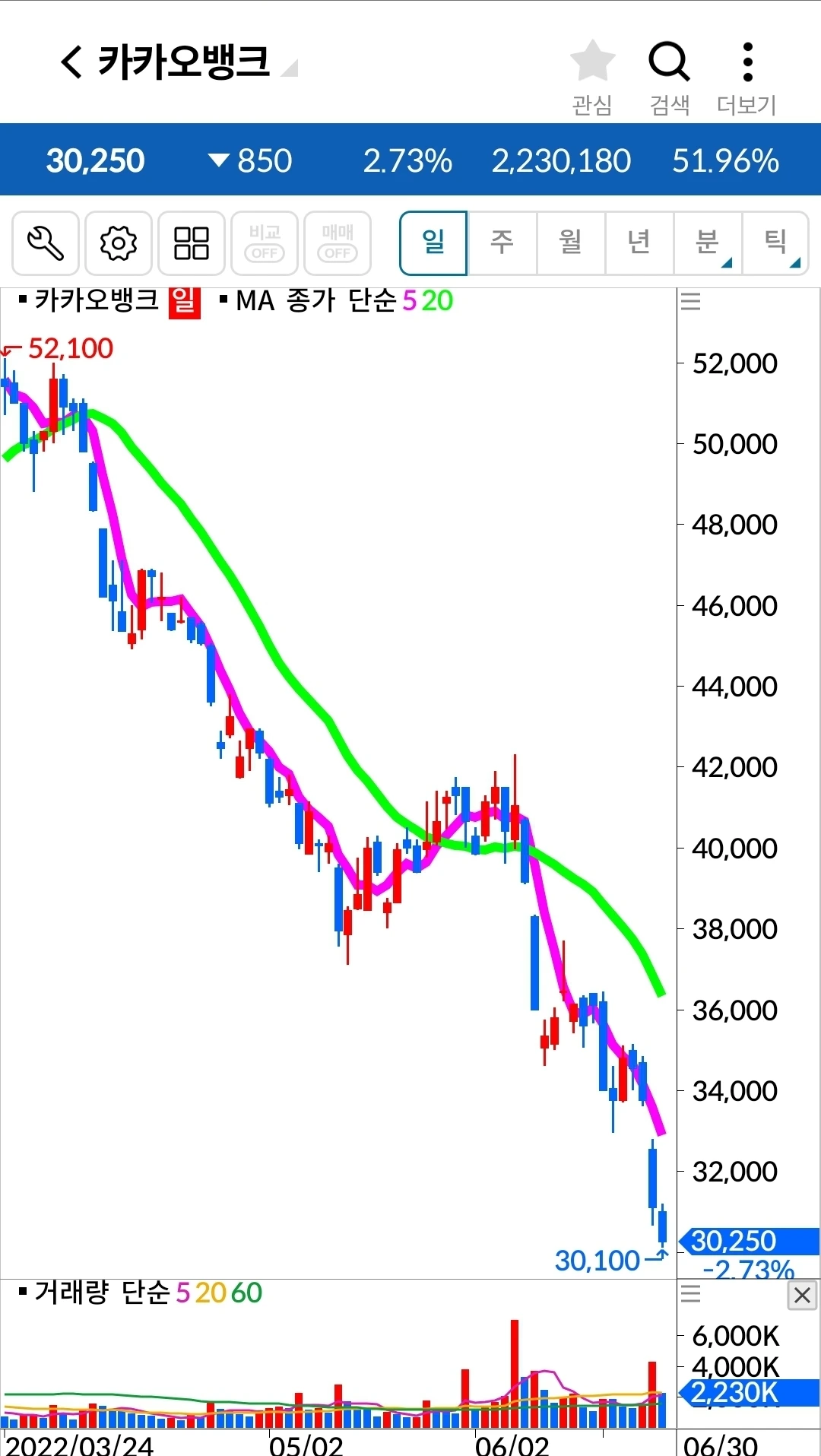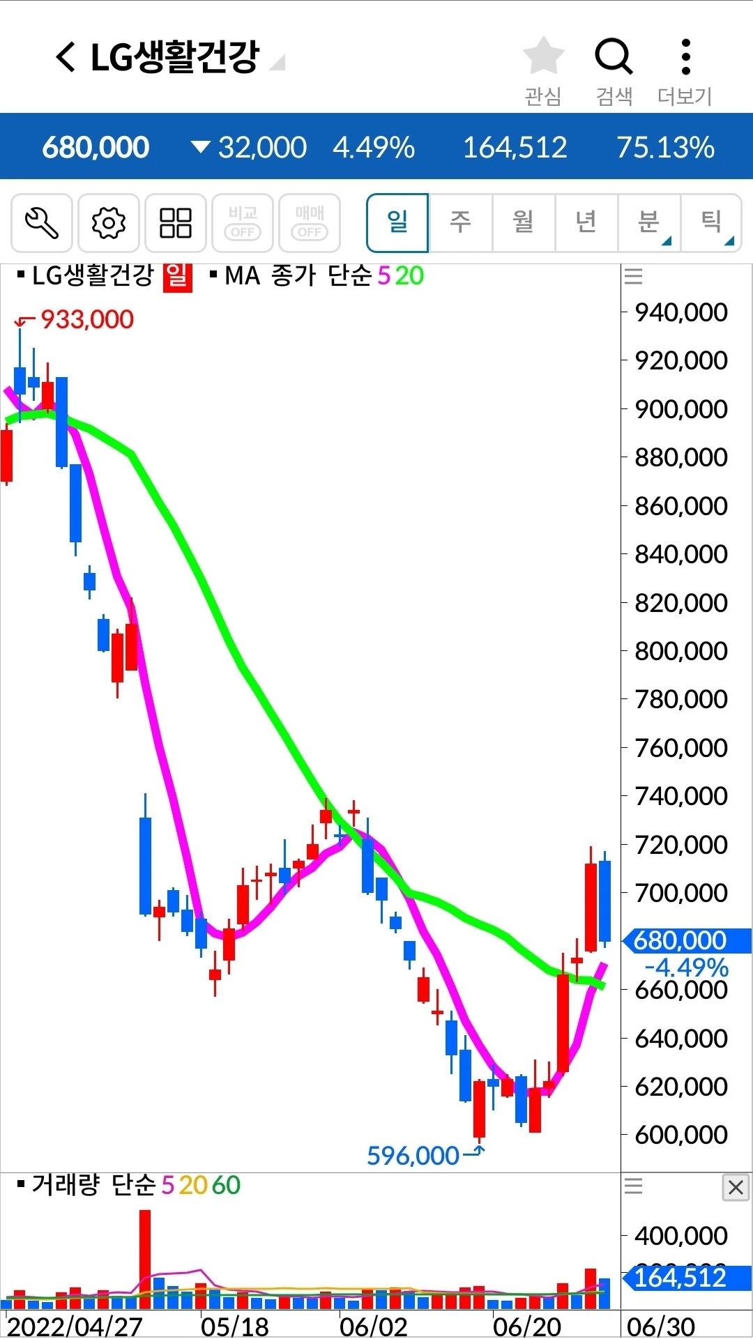 아이고. 이건 그냥 막 내려가는 그림이다. 그런데 쌀 때 들어가서 그냥 오래오래 가지고 있어야지 하는 전략 아닌 전략으로 들어가다 보니 도대체 어디서 나와야 할지를 모르겠다. 전에처럼 '난 아무것도 몰라요 5일선이 20일선을 내려오면 매도할 뿐야요~'에서 매도했다면 손실을 한참 줄일 수 있었을 텐데. 늦어도 괜찮다. 한눈을 팔았다 이제야 어떤 게 좋은 원칙인지 확실히 알았으니까. 이건 다시 5일선이 20일선을 뚫고 올라오기까지 기다릴 밖에 방법이 없다. 그렇게 올라오면 그때부터 나의 옛 원칙으로 하자. 도대체 어떻게 쌀 때라며 감히 들어간 걸까. 쌀 때를 내가 과연 알 수 있단 말인가? 말도 안 되는 전략을 전략이랍시고 했으니 나도 참참참이다.