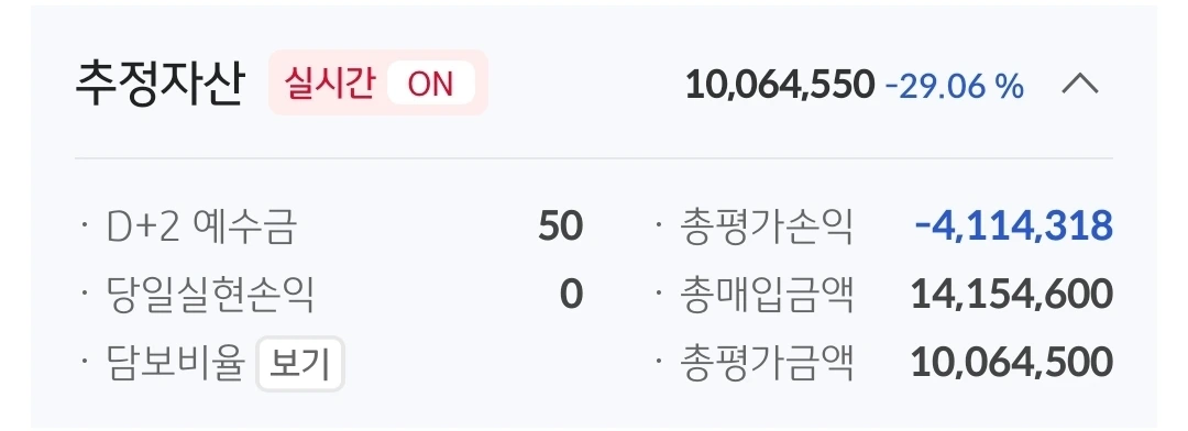 추정자산. 1006만 원. 951만 원 손실 중.(2000 원금에서 지금 잔액 1006을 빼고 거기 선물로 옮긴 43만 원을 더해서 나온 값이다.)