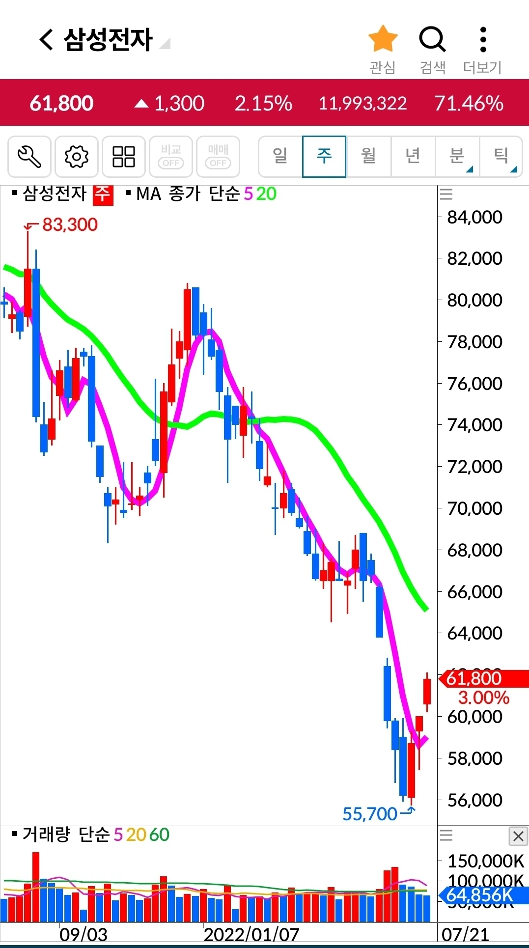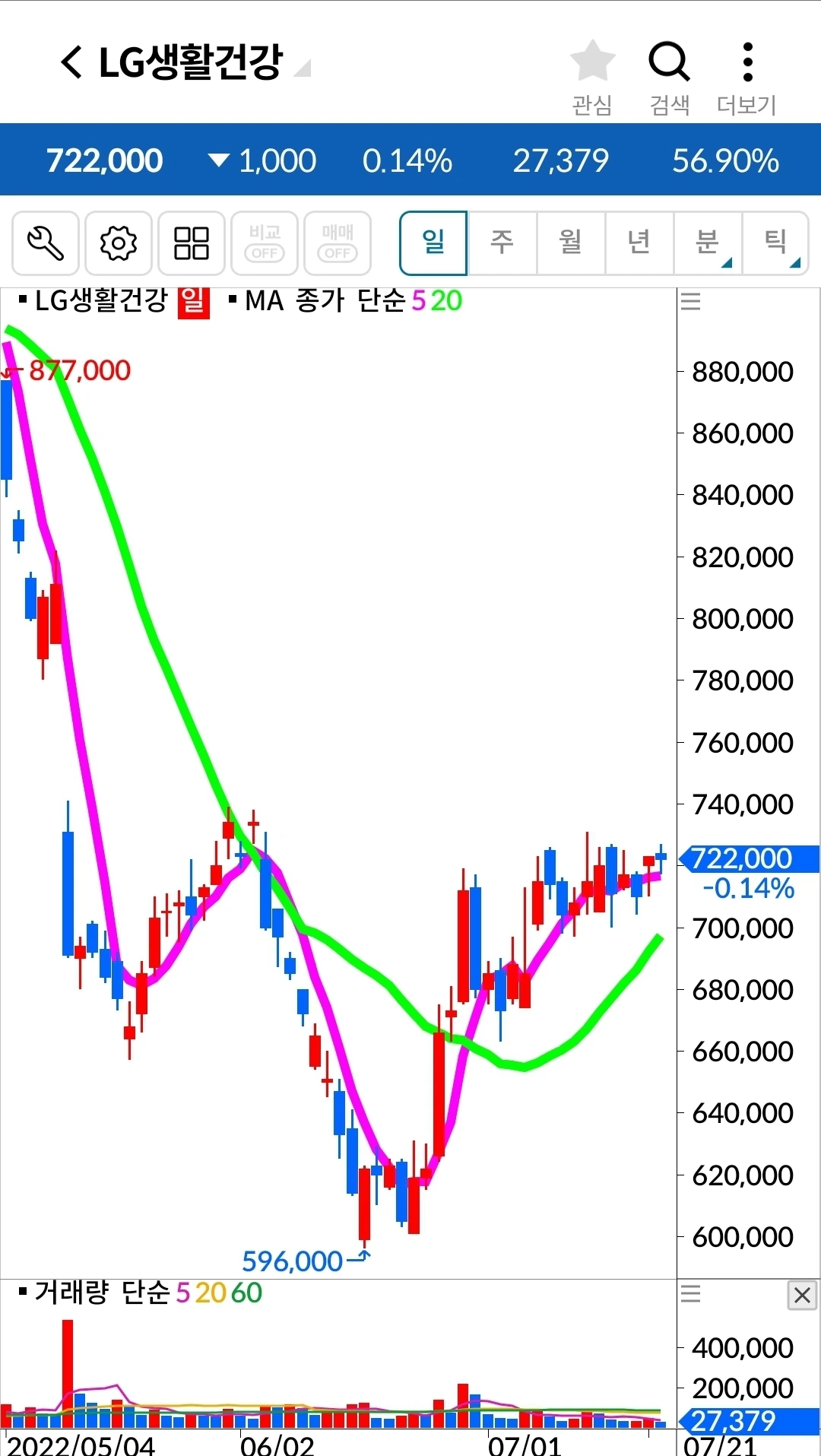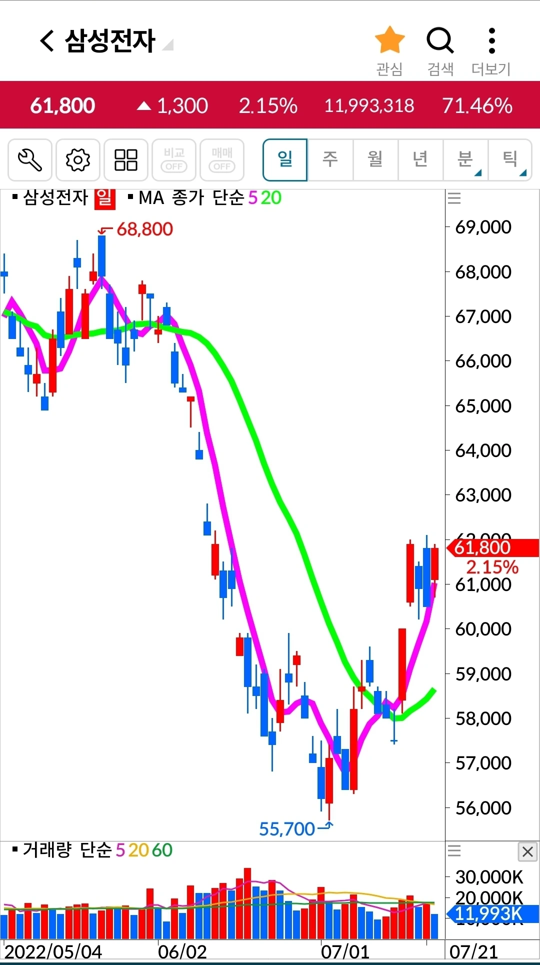 오홋. 기분 좋게 삼성전자가 빵! 올랐다. 5일 선이 20일 선 위에 있으므로 나의 할 일은 아무것도 없다. 그냥 차트가 어떻게 만들어지는지 구경만 할 뿐이다. 난 요것만 지키면 되니까. 꼭 꼭 머릿속에 잘 박아두어야지. '난 아무것도 몰라요~ 5일 선이 20일 선 아래로 내려가면 매도할 뿐야요~' 오늘도 씩씩하게 파이팅!