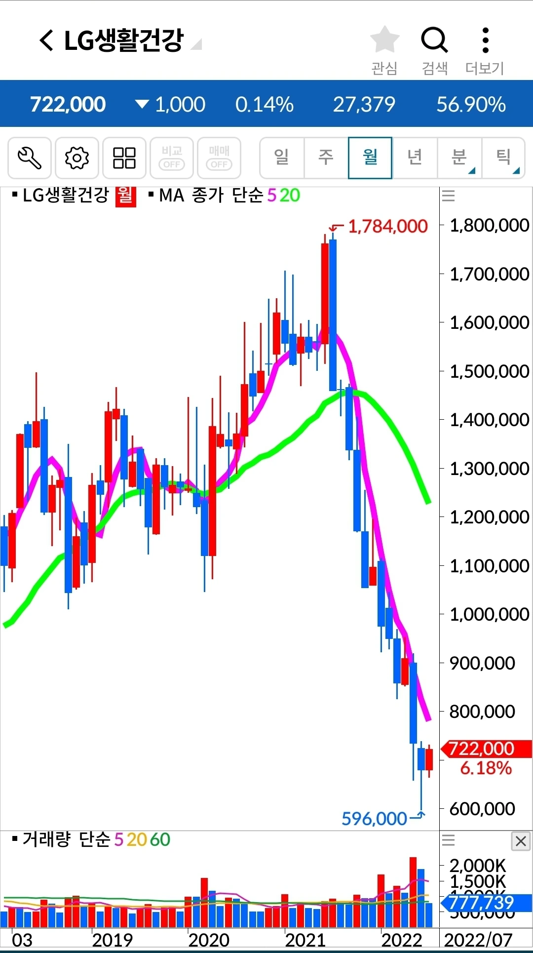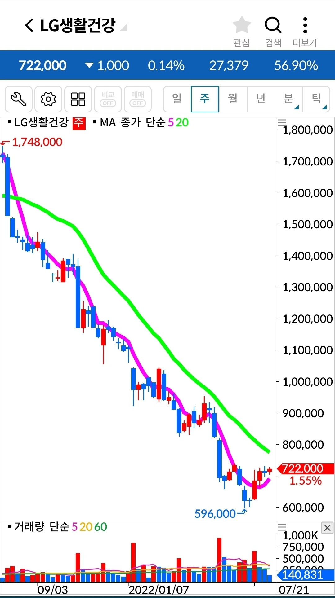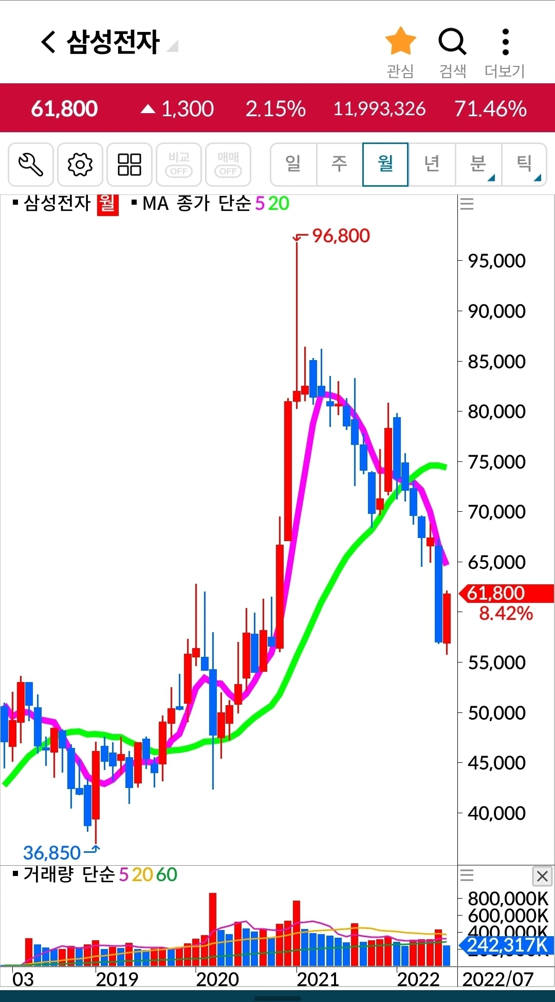 오홋. 기분 좋게 삼성전자가 빵! 올랐다. 5일 선이 20일 선 위에 있으므로 나의 할 일은 아무것도 없다. 그냥 차트가 어떻게 만들어지는지 구경만 할 뿐이다. 난 요것만 지키면 되니까. 꼭 꼭 머릿속에 잘 박아두어야지. '난 아무것도 몰라요~ 5일 선이 20일 선 아래로 내려가면 매도할 뿐야요~' 오늘도 씩씩하게 파이팅!