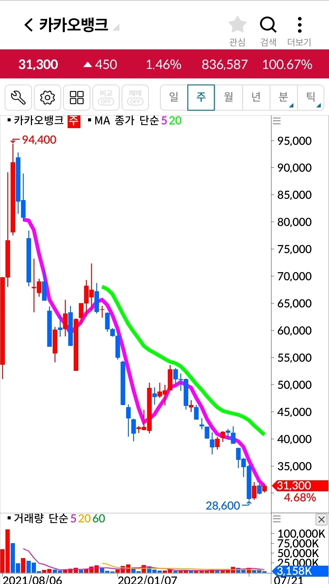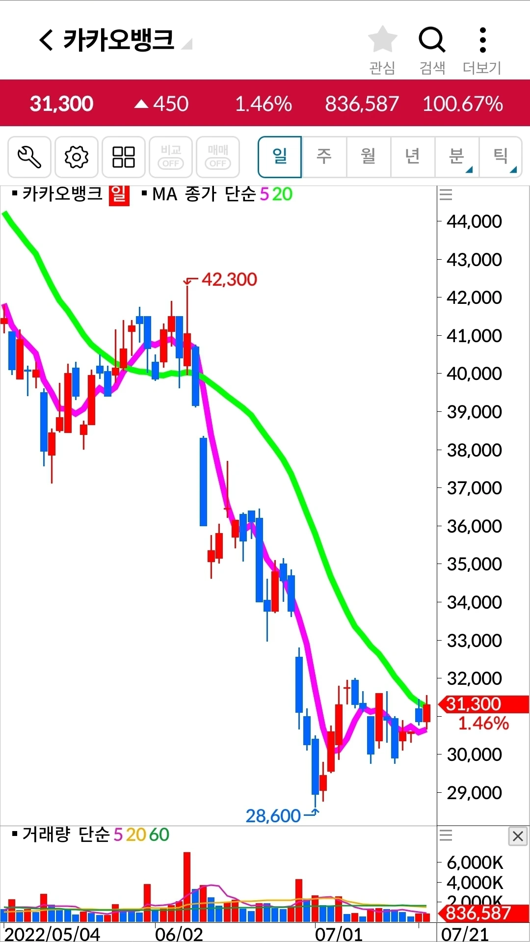 이제 곧 5일 선이 20일 선을 뚫고 올라가겠다. 그렇게만 되면 다시 나의 기본 원칙으로 돌아가리라. 바로 요거. 5일선 20일선 매매. 그것만 지킬 줄 알면 살아남을 수 있다. 주식시장에서 살아만 있으면 기회는 언제든지 온다. 파이팅!!!