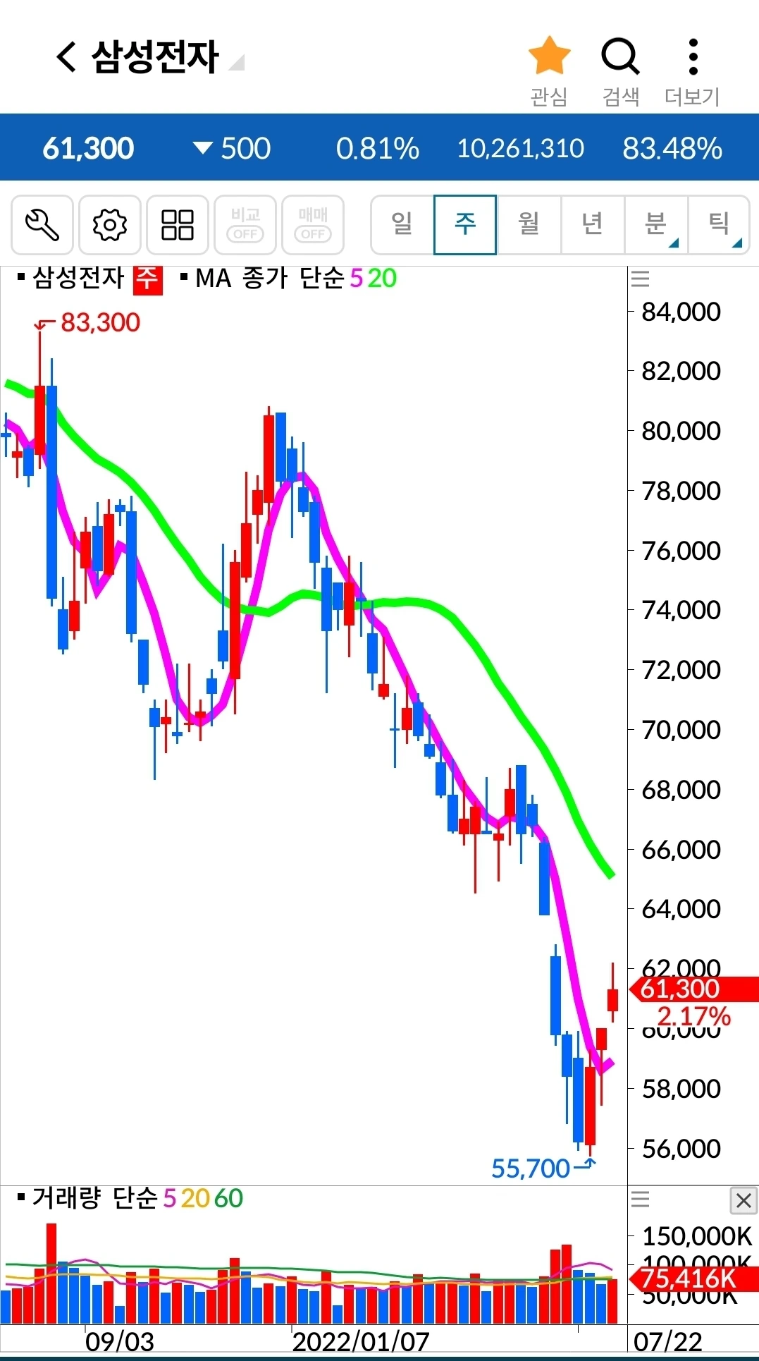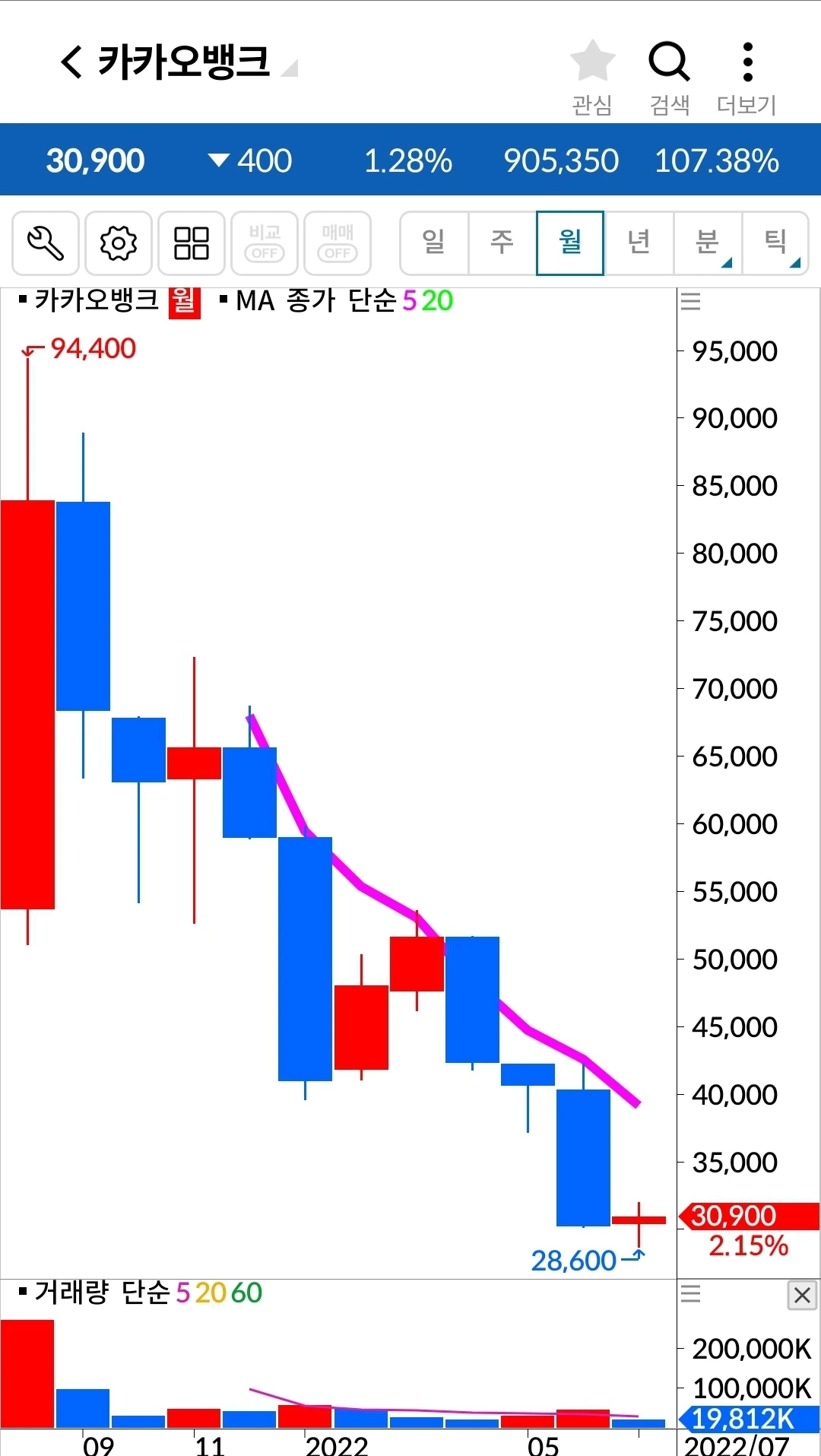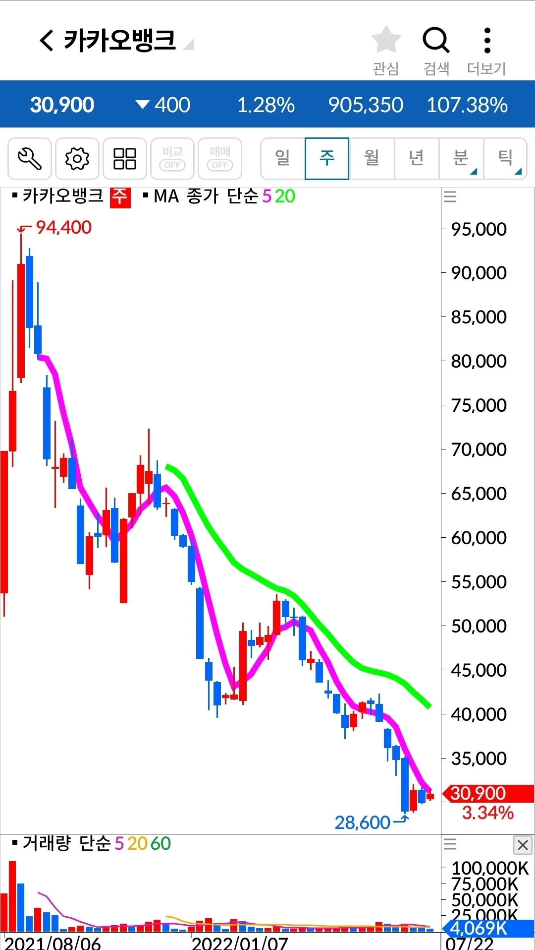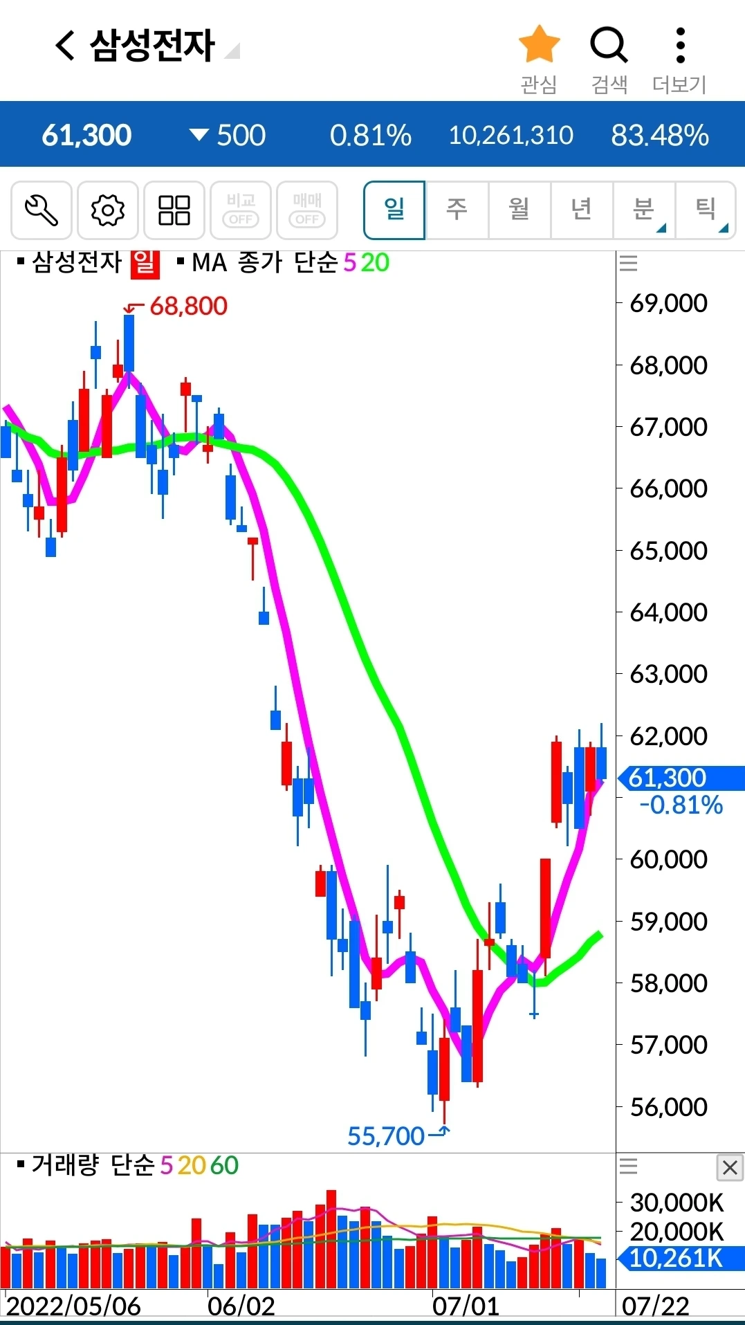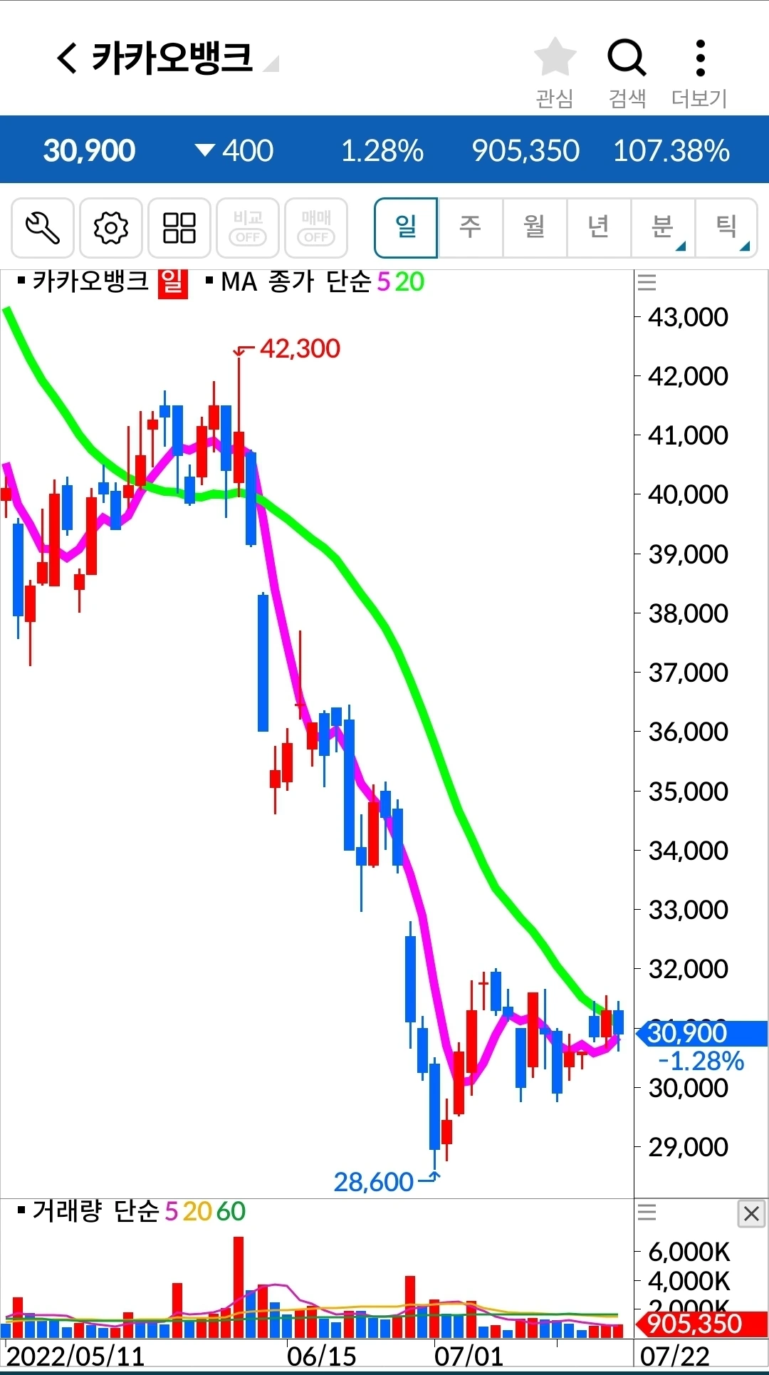 전일 고점을 뚫었고 저점은 건드리지 않았으니 희망적. 게다가 나의 기본원칙 '난 아무것도 몰라요 5일선이 20일 선 내려가면 매도할 뿐야요~'대로 하기로 했으니 5일선이 20일 선 위에 있는 지금, 나의 할 일은 없다. 그림만 지켜본다.