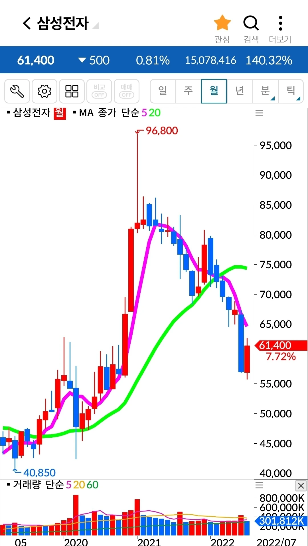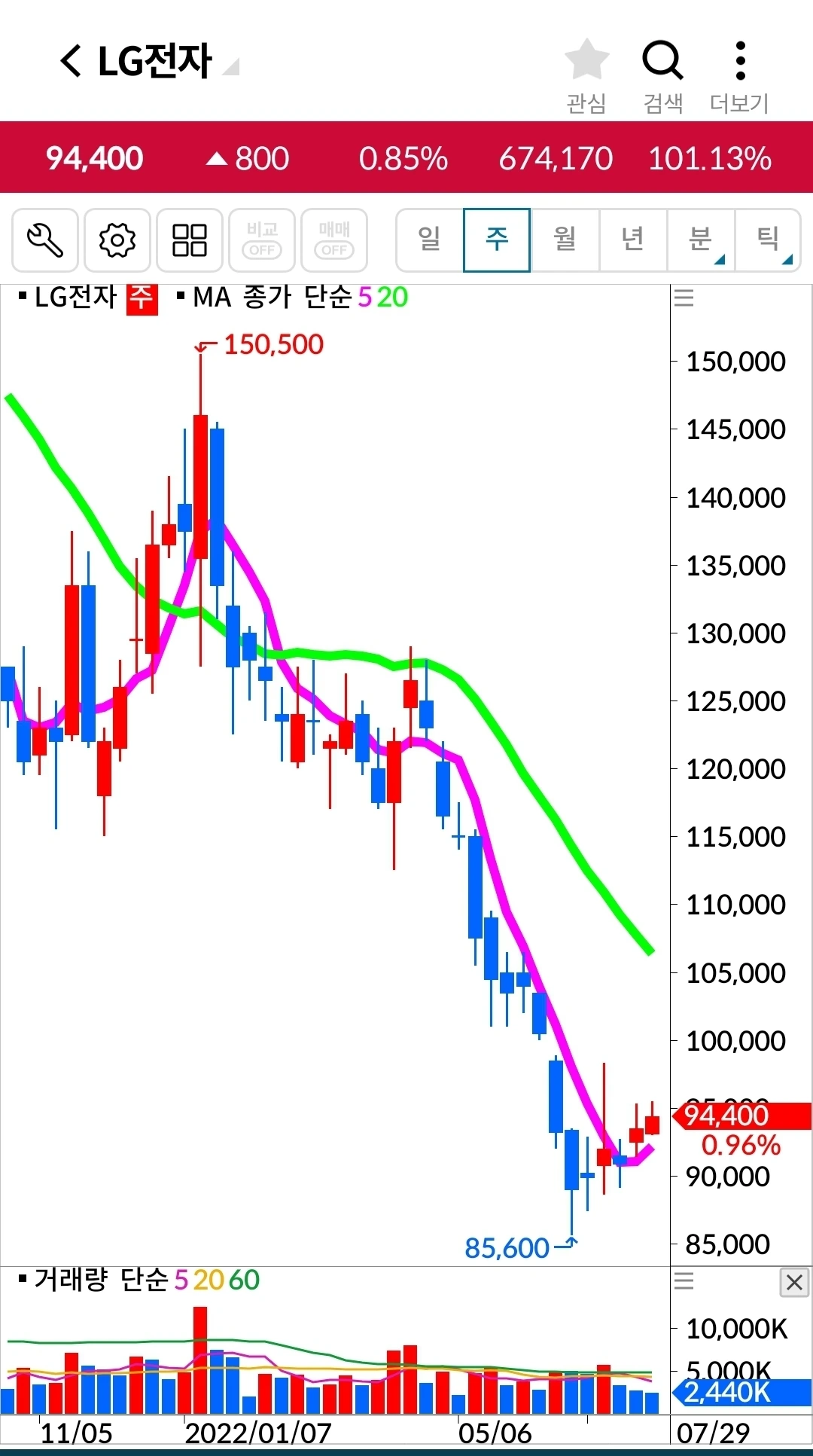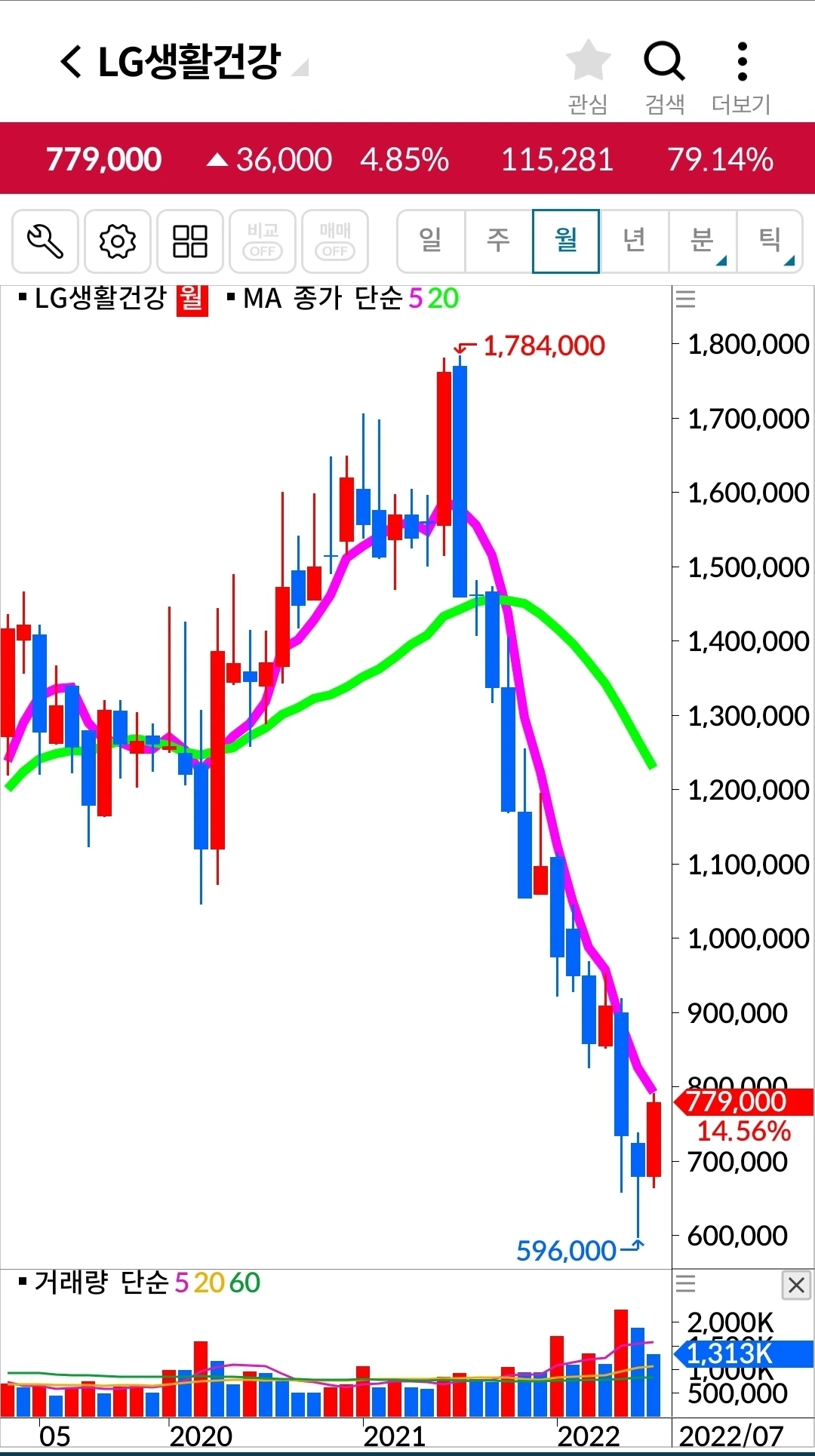 5일 선이 20일 선 위로 올라와 횡보 중인 걸 골랐다. 잘 지켜보다 5일선이 20일선 아래로 내려가는 순간 탈락시킬 거다. 힘내라 힘!