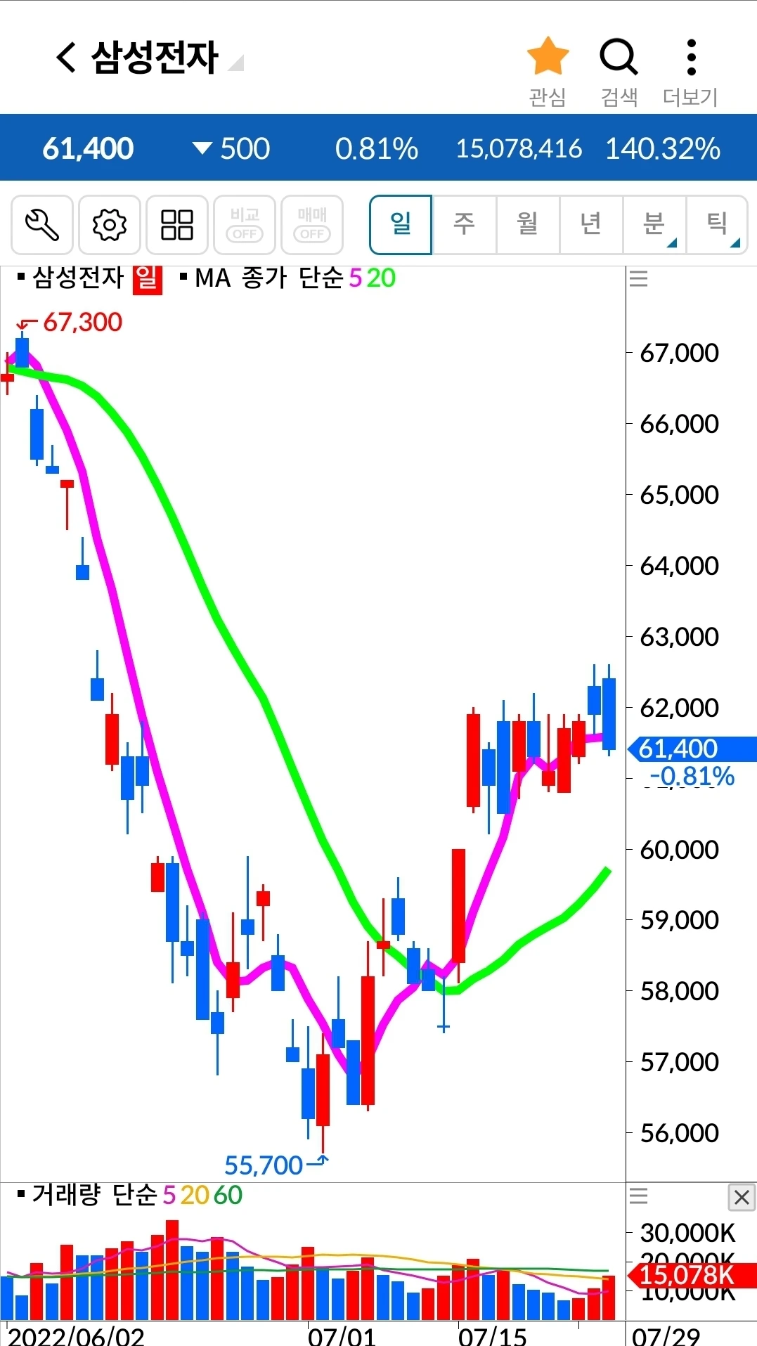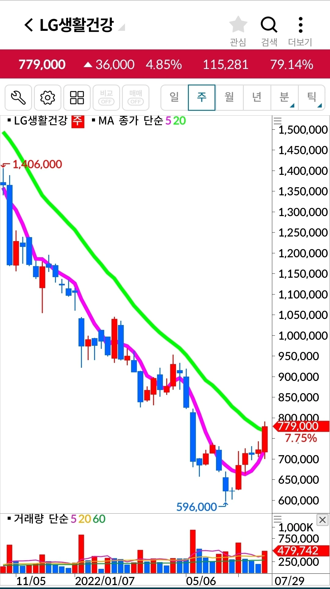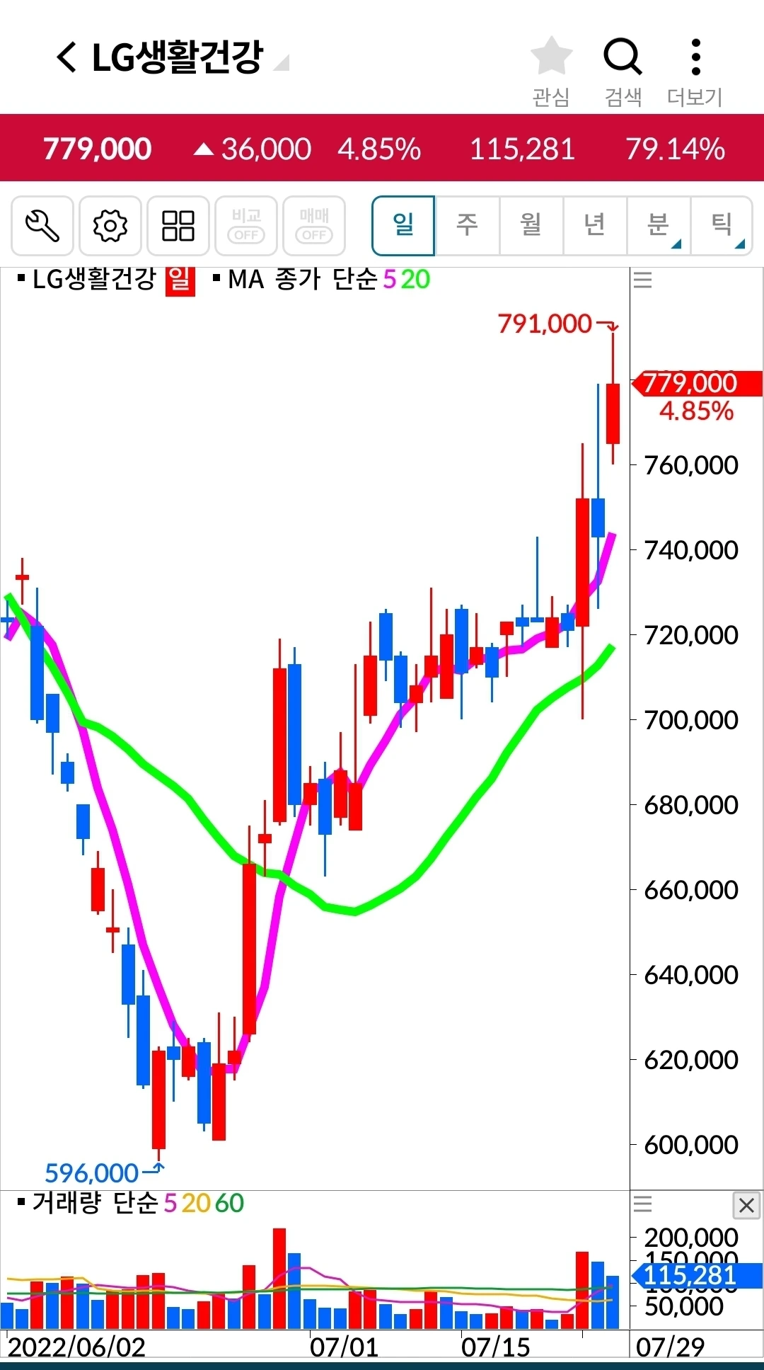 오홋. 힘이 있는 건 이렇게 빵! 빵! 올라간다. 5일선이 20일선 위에 있으므로 내가 할 일은 없다. 파이팅!
