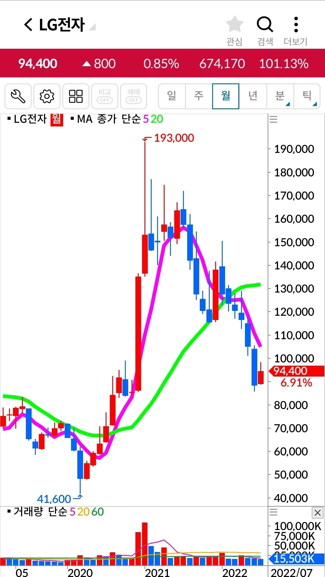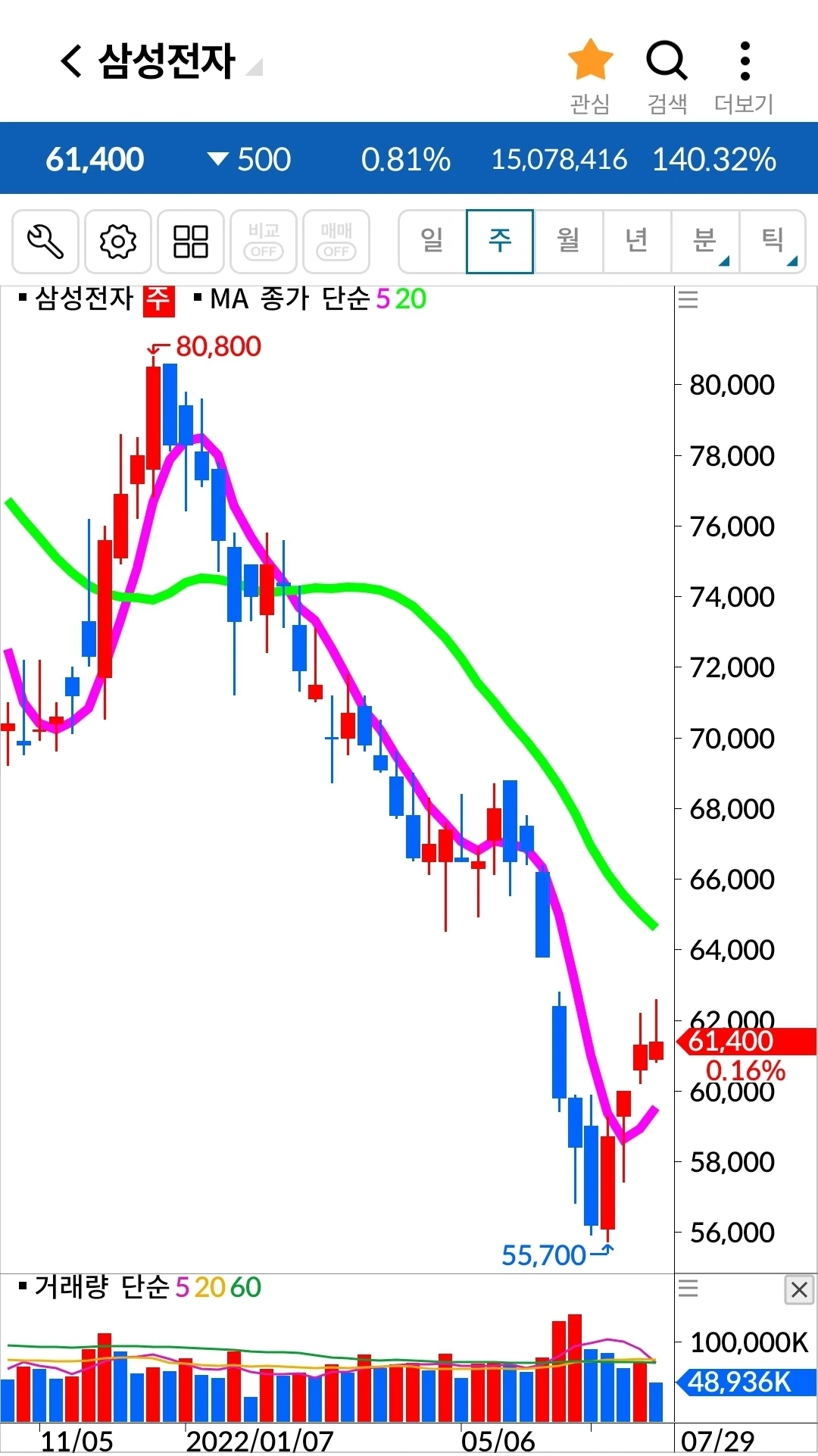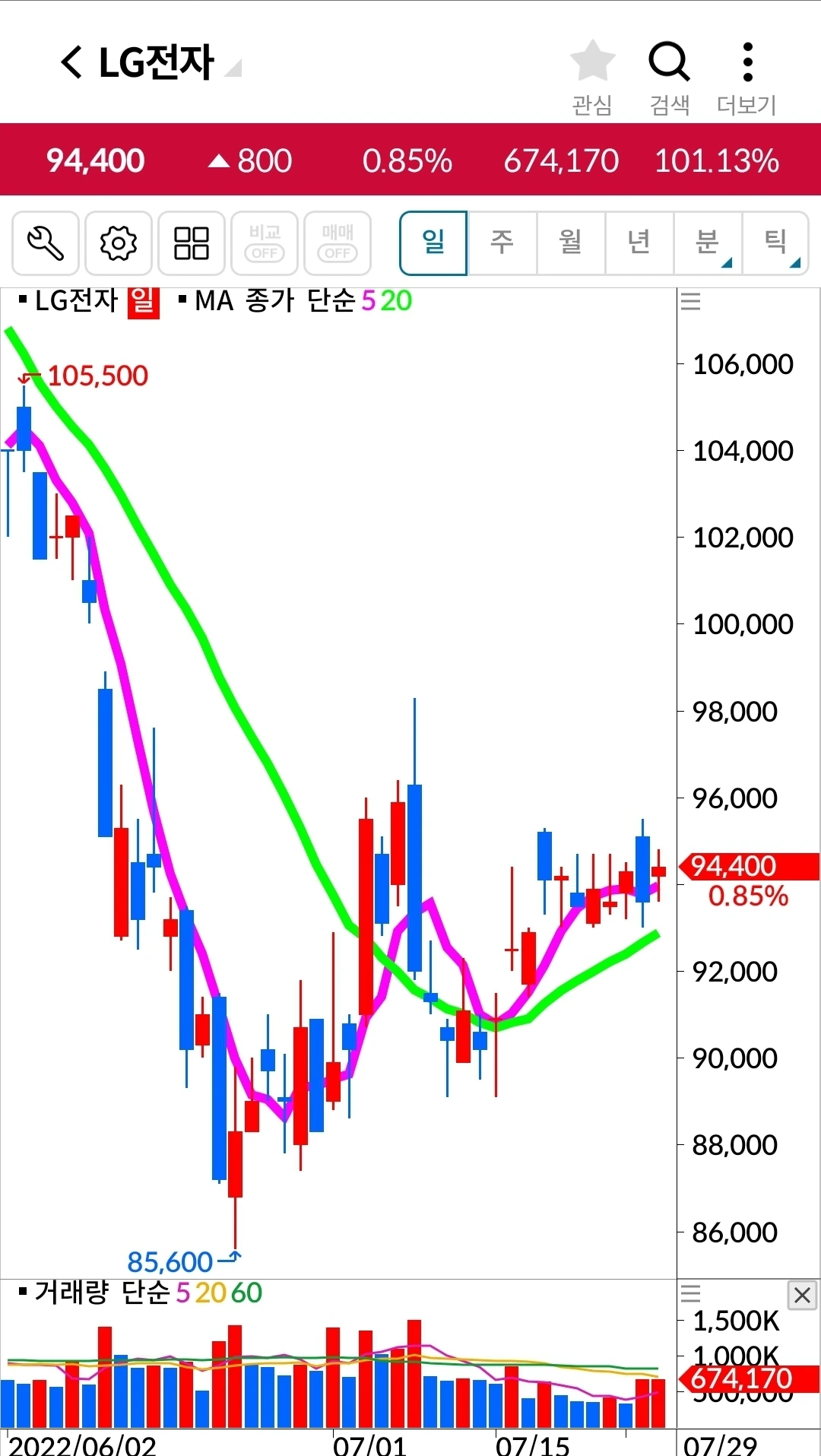 오홋. 힘이 있는 건 이렇게 빵! 빵! 올라간다. 5일선이 20일선 위에 있으므로 내가 할 일은 없다. 파이팅!