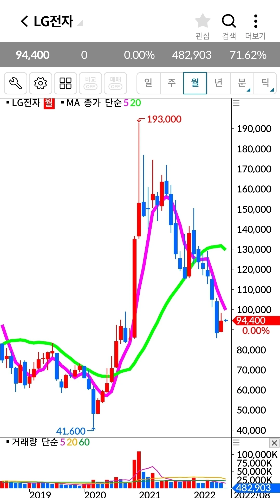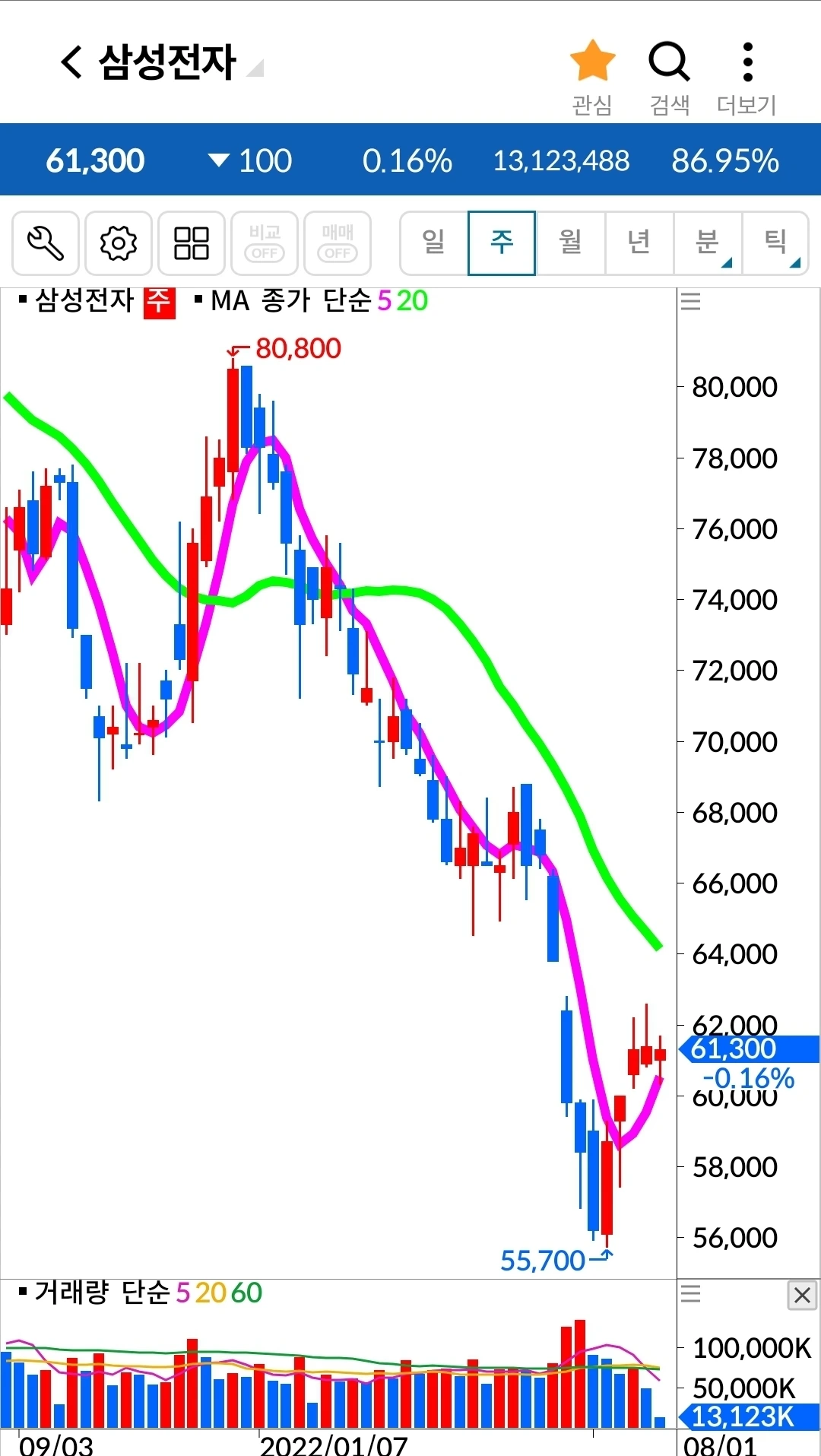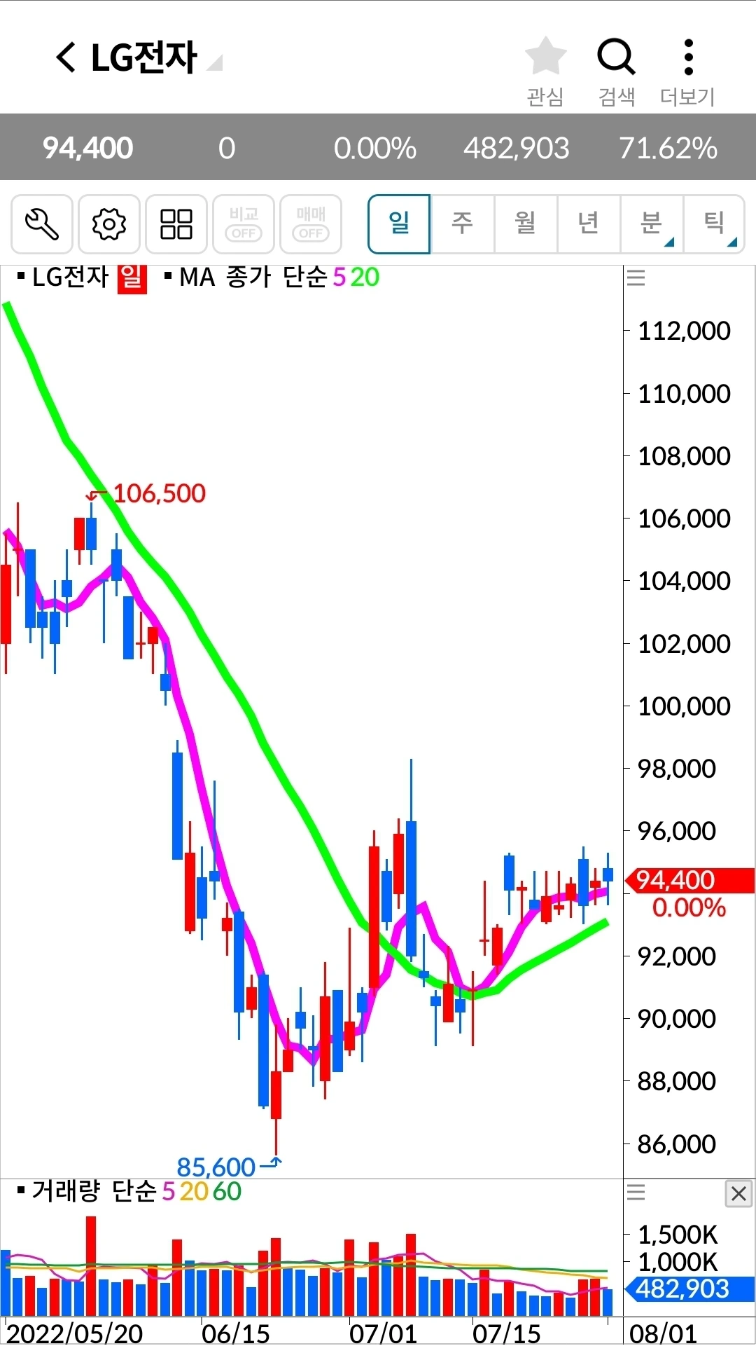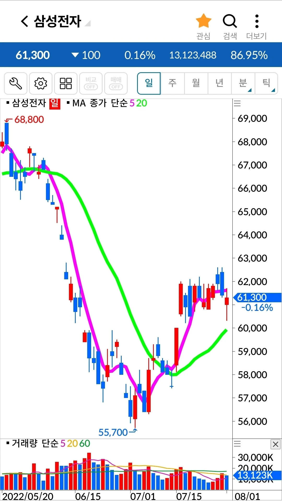 갈 길이 먼저 횡보 후 위로 가지 않고 아래로 툭 떨어졌다. 그래도 양봉인 거에 안심해보자. 어쨌든 5일 선이 20일 선 위에 있으니 내가 할 일은 없다. 난 요것만 지킬 거니가. '난 아무것도 몰라요~ 5일선이 20일 선 아래로 내려가면 매도할 뿐야요~'