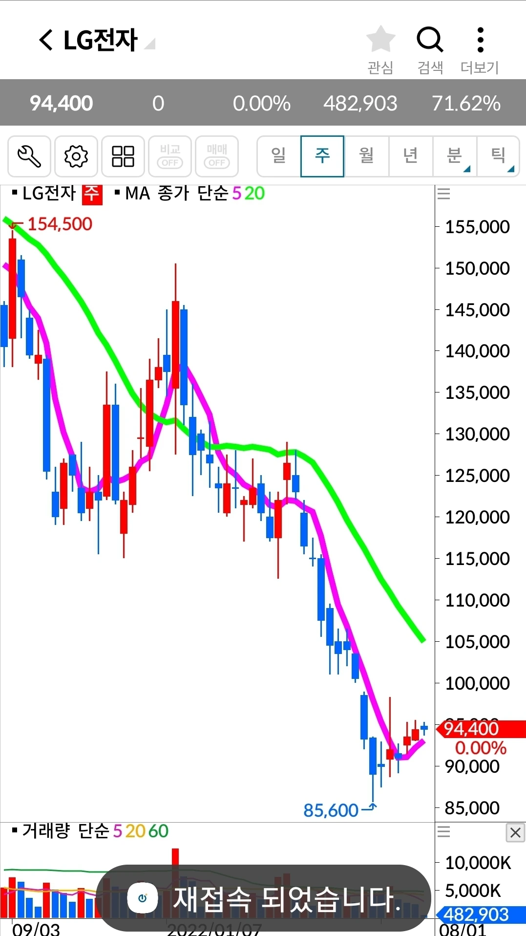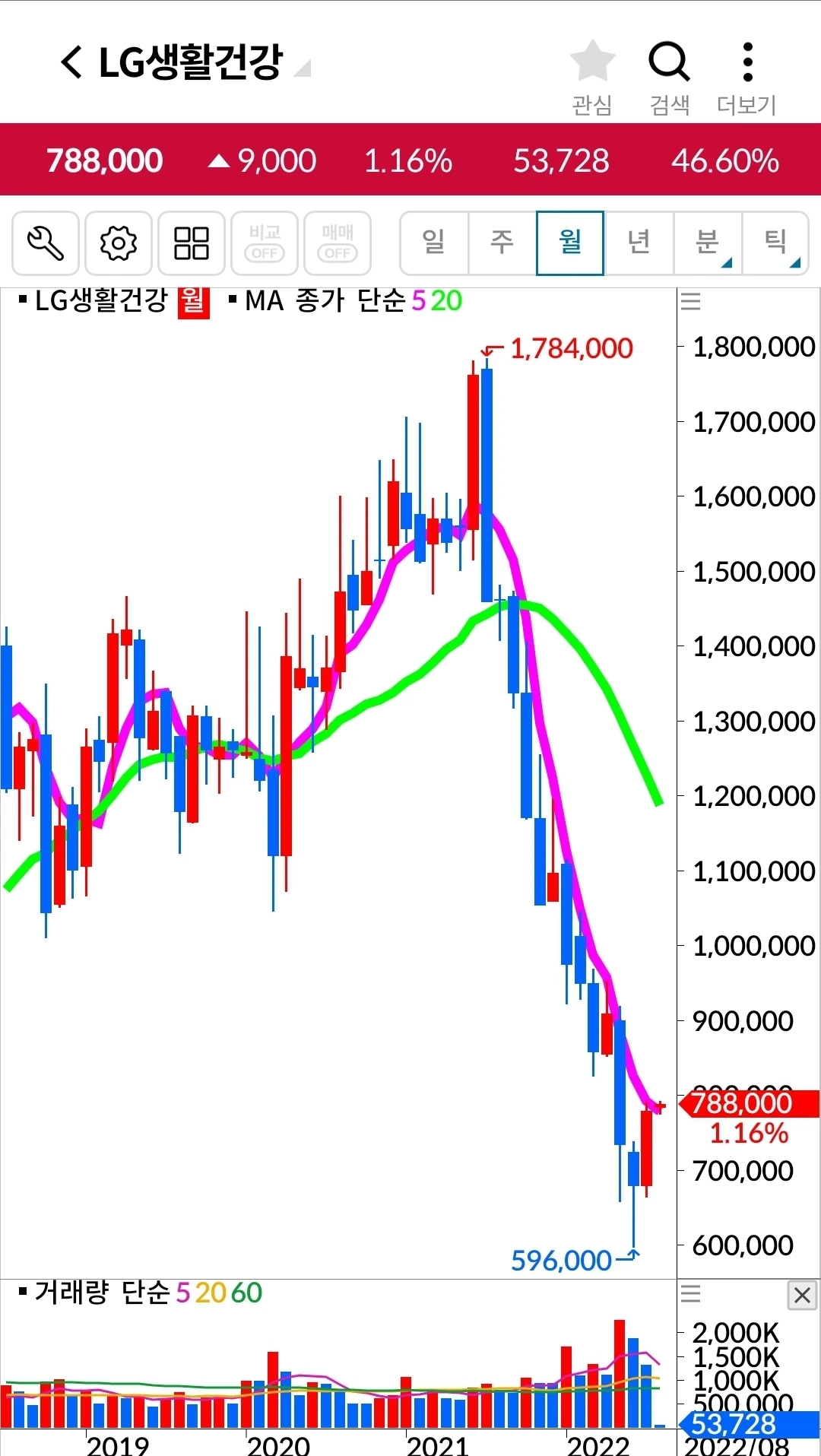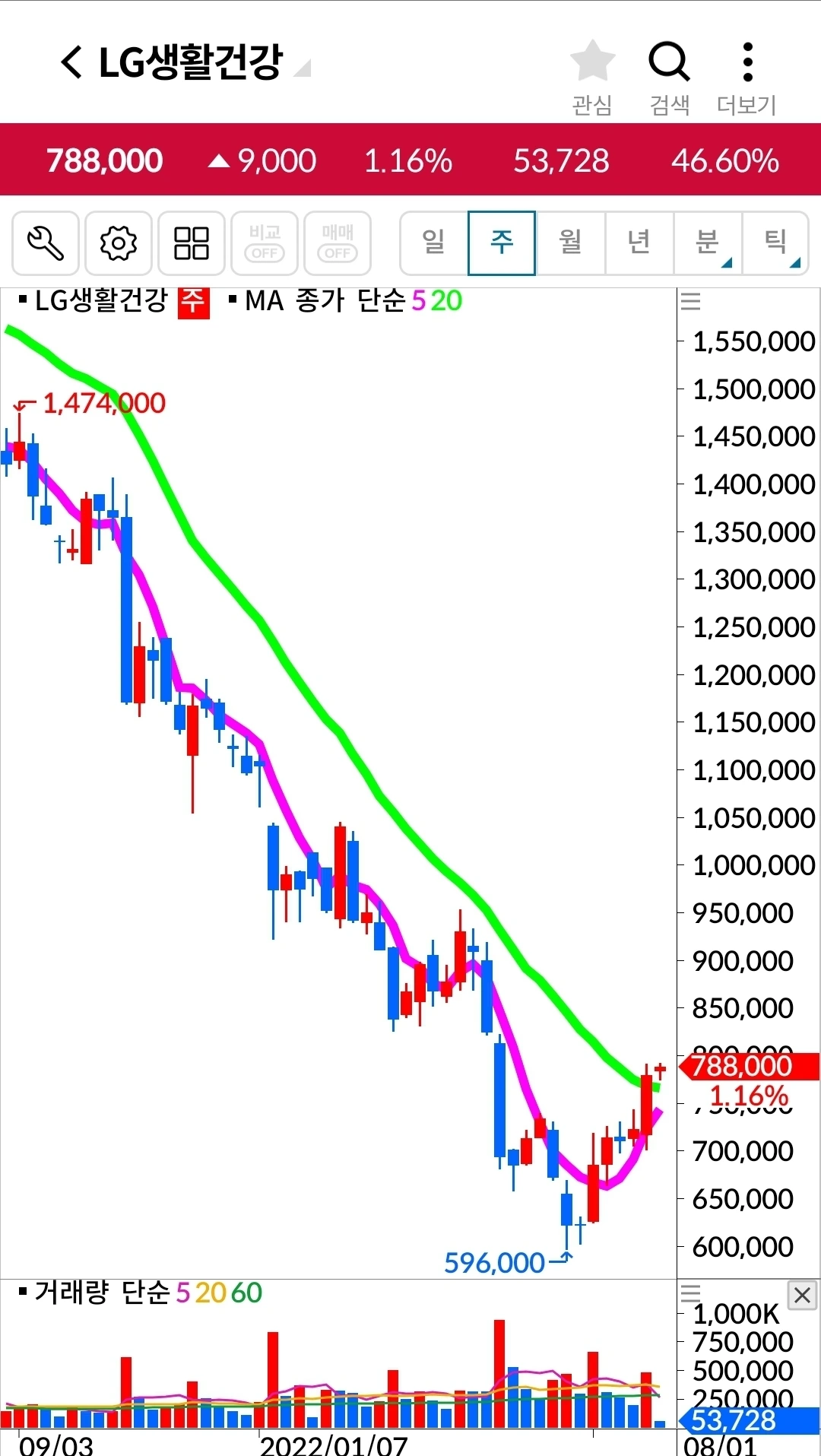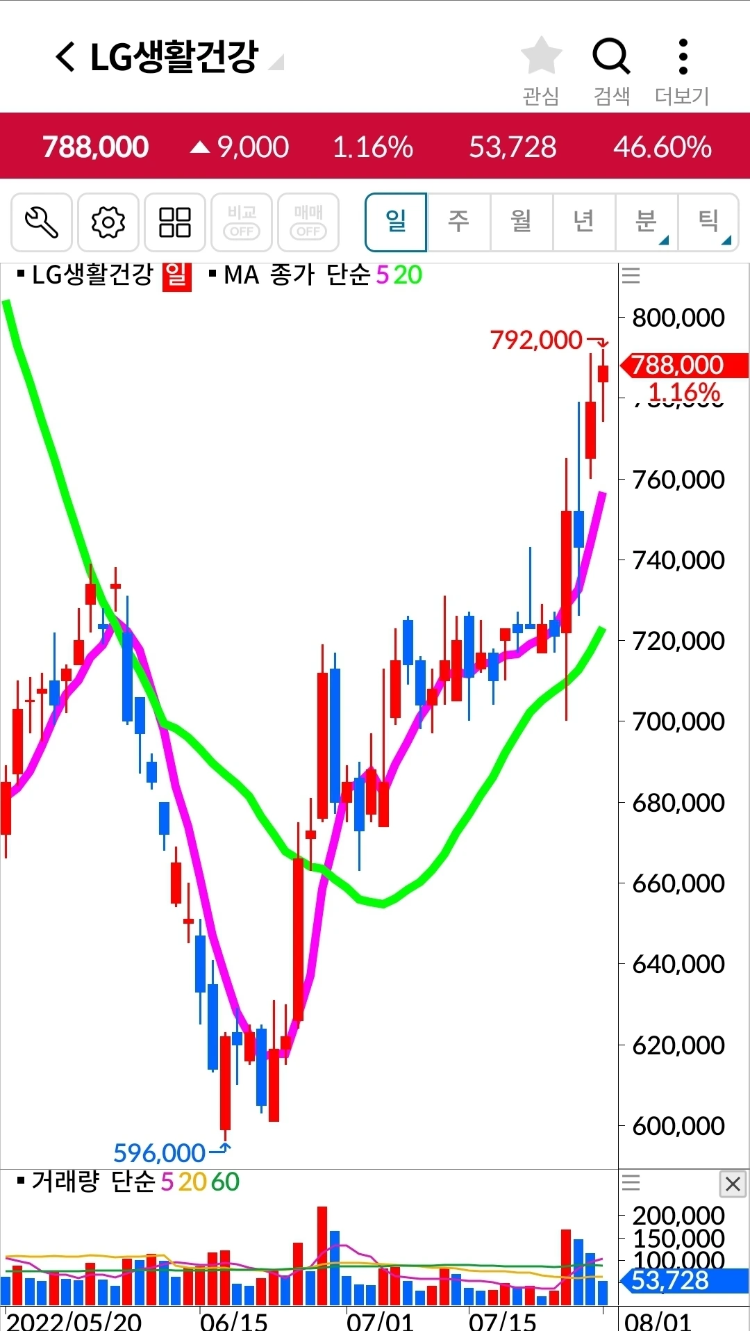 오홋. 일단 방향이 바뀌니 쭉쭉 잘도 올라간다. 5일선 20일선 모두 위를 향하고 있다. 고우 고우.