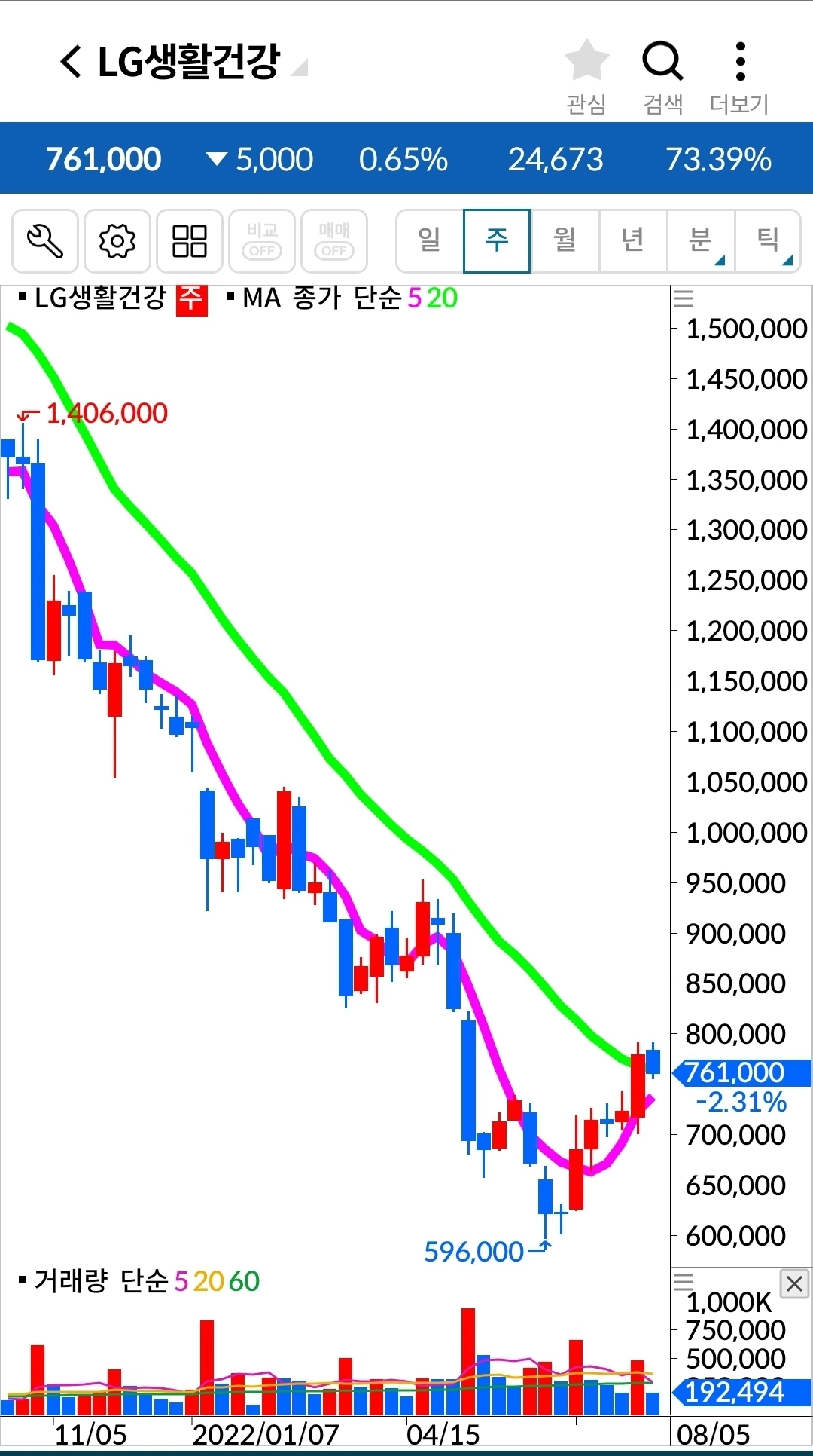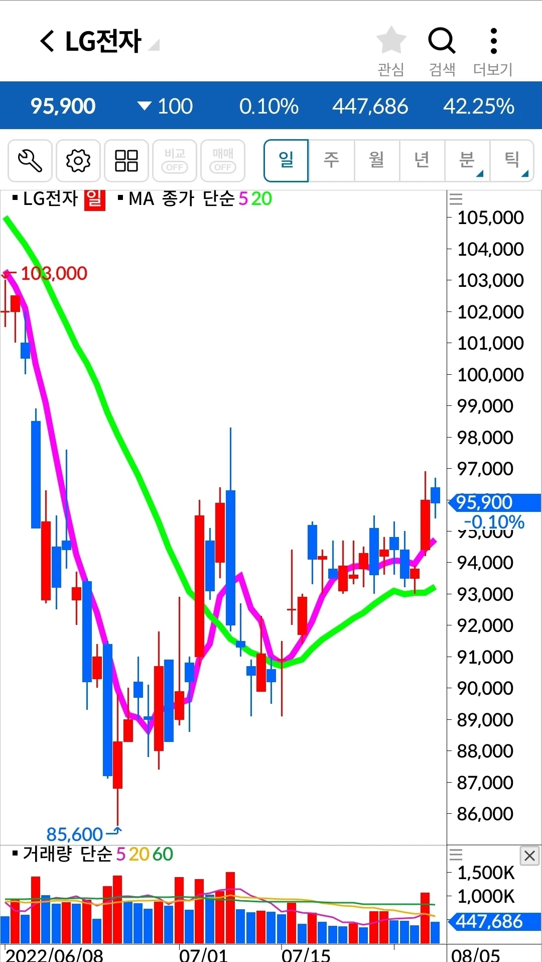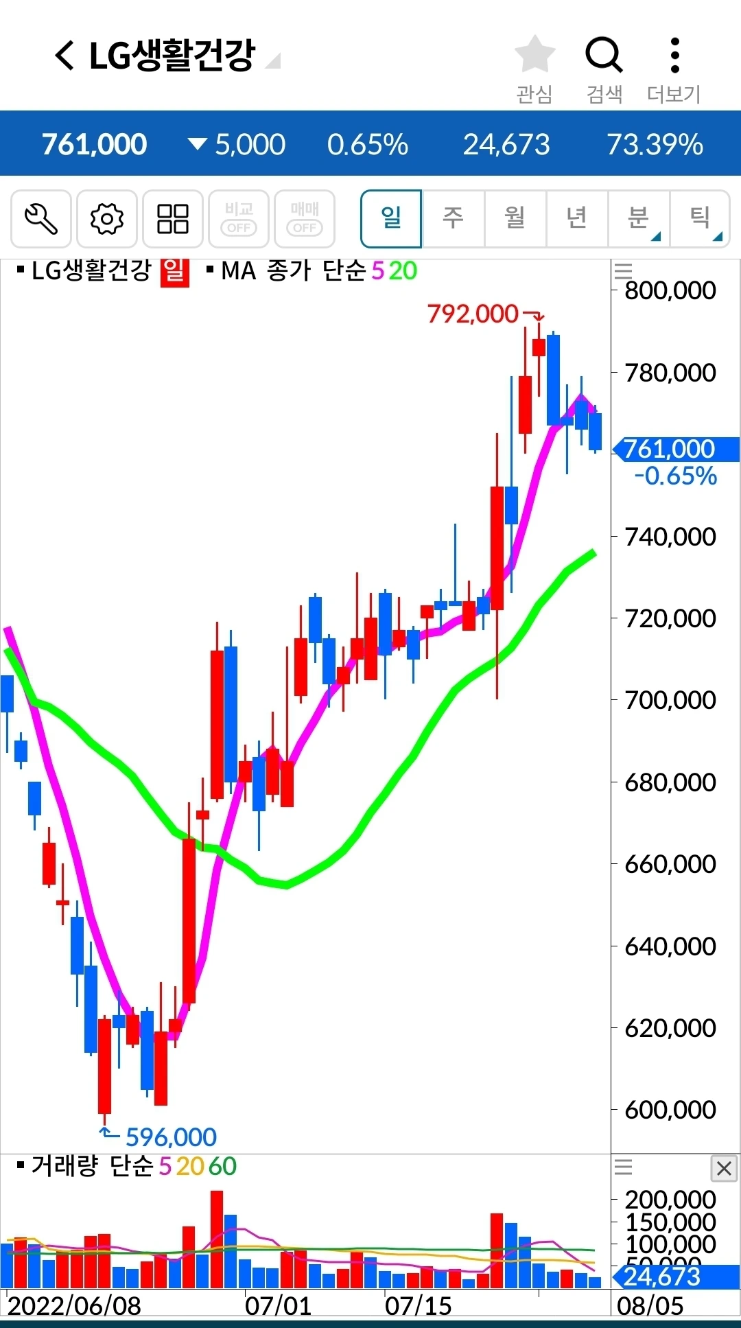 5일선이 살짝 아래로 꺾였다. 그래도 여전히 20일 선 위에 있으므로 그대로 매수 유지다. 파이팅!