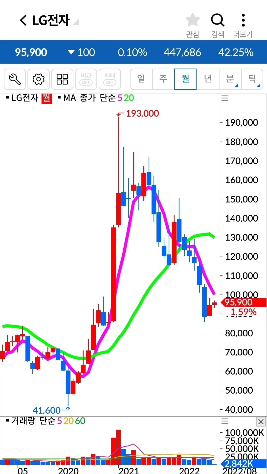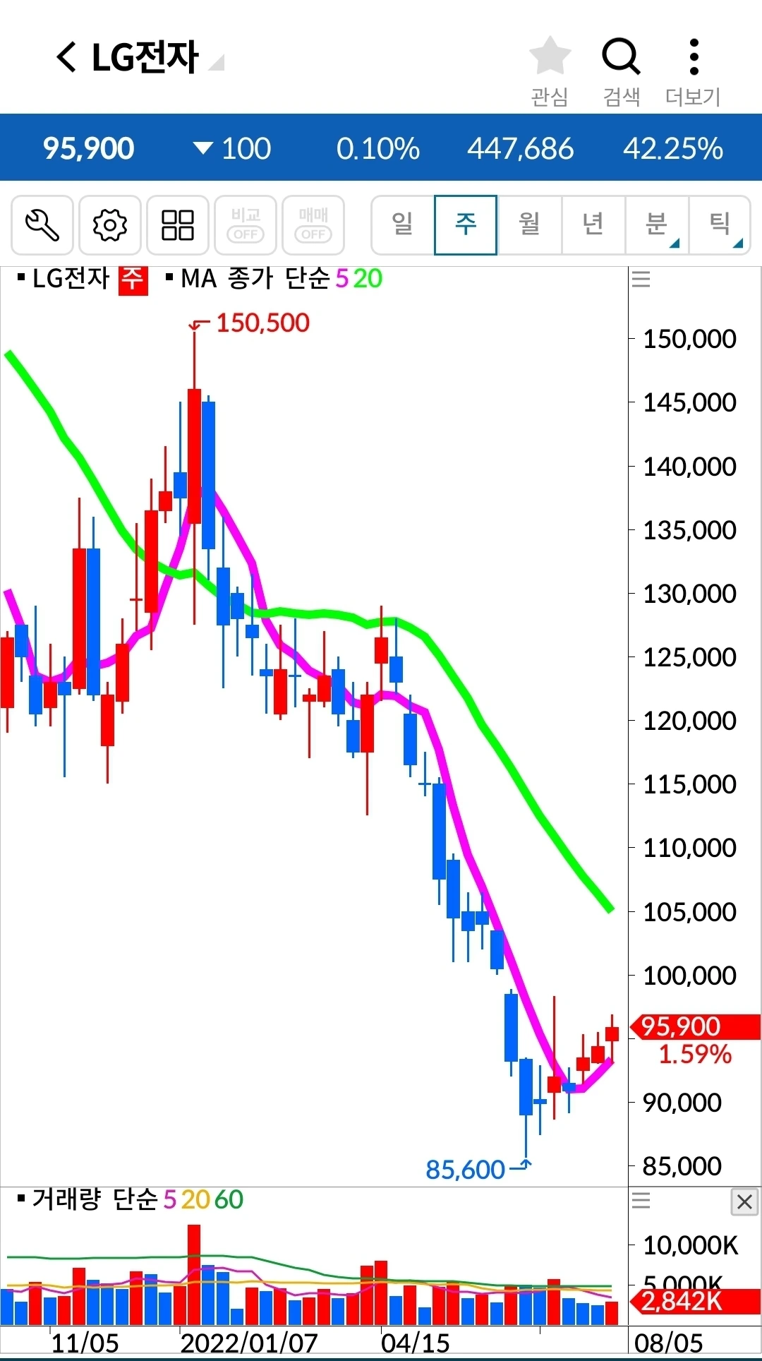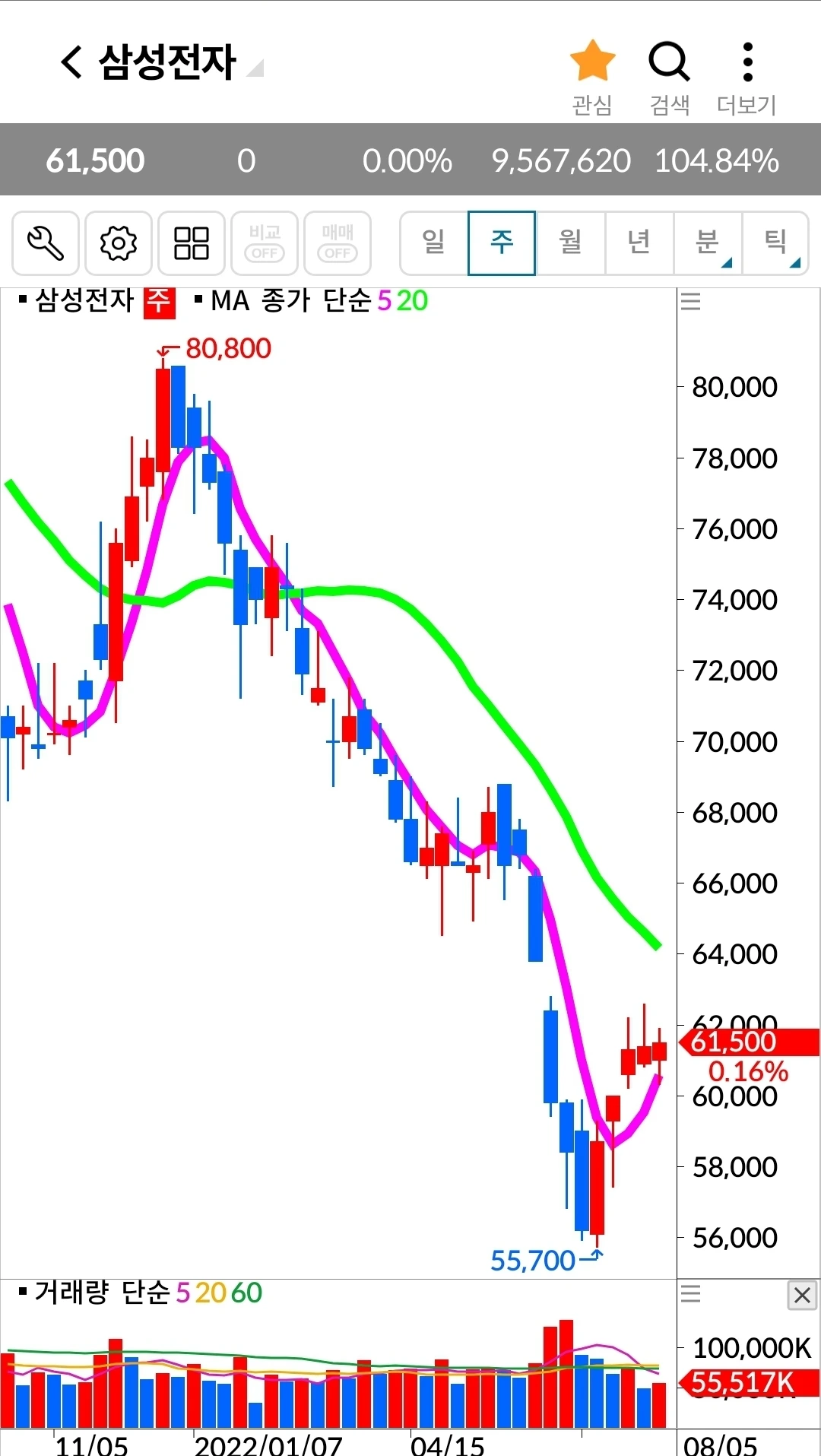 5일선이 살짝 아래로 꺾였다. 그래도 여전히 20일 선 위에 있으므로 그대로 매수 유지다. 파이팅!