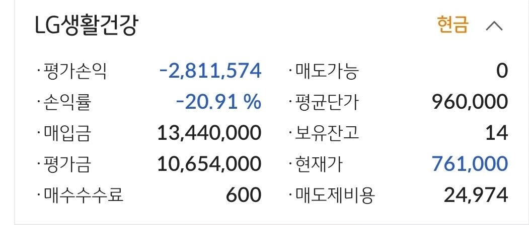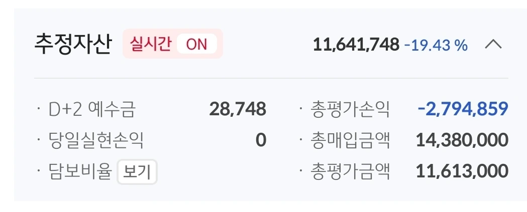 현물 계좌 추정자산. 1164만 원. 836만 원 손실 중.