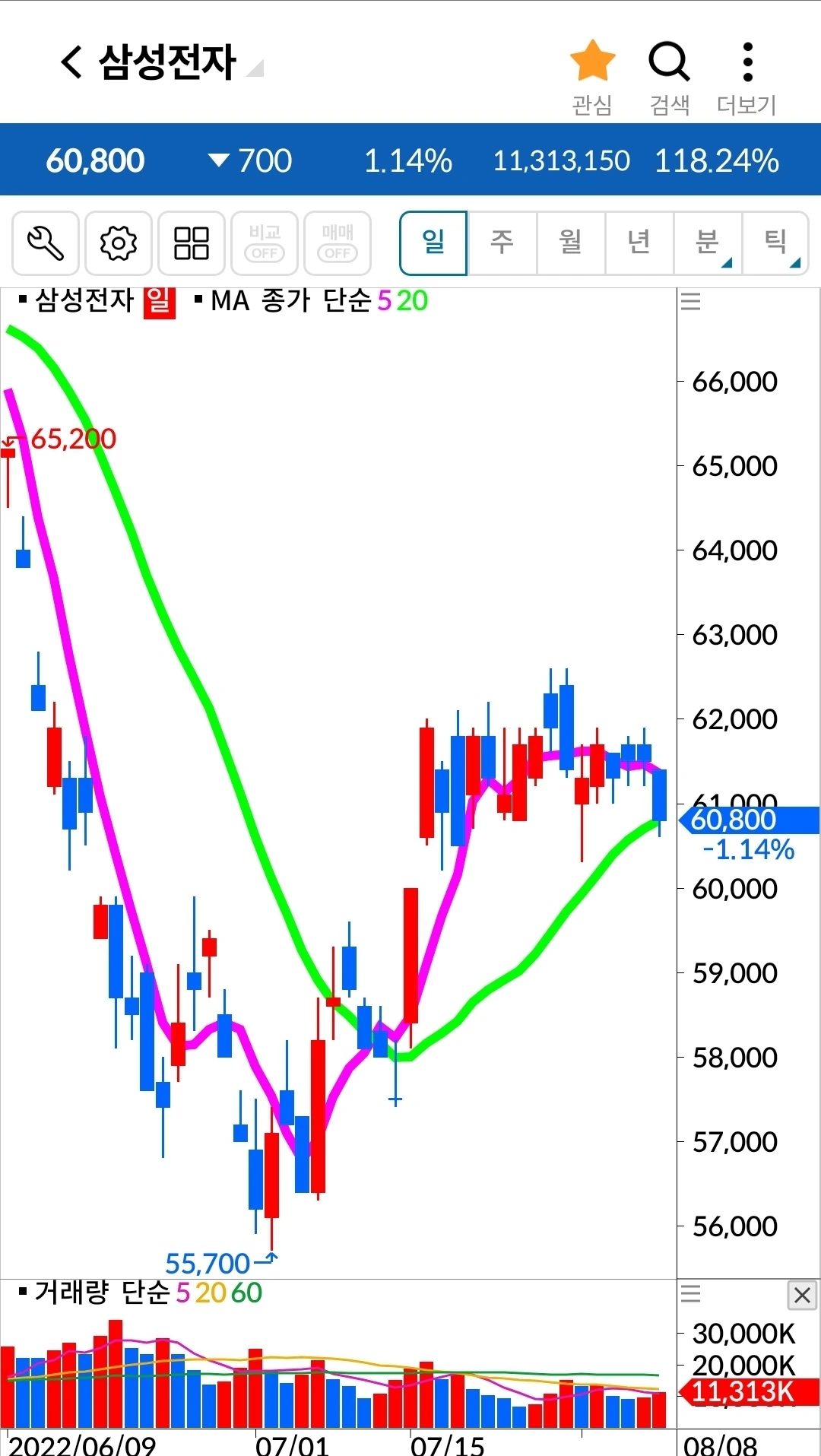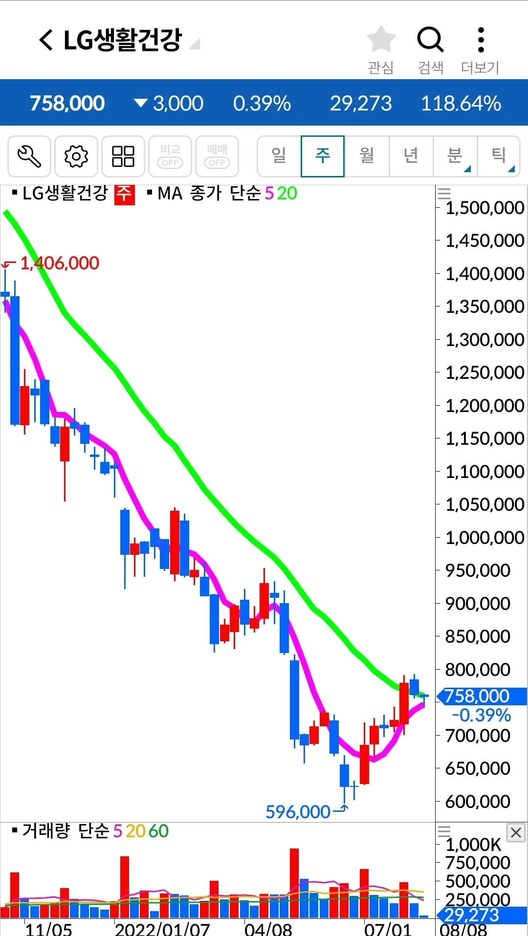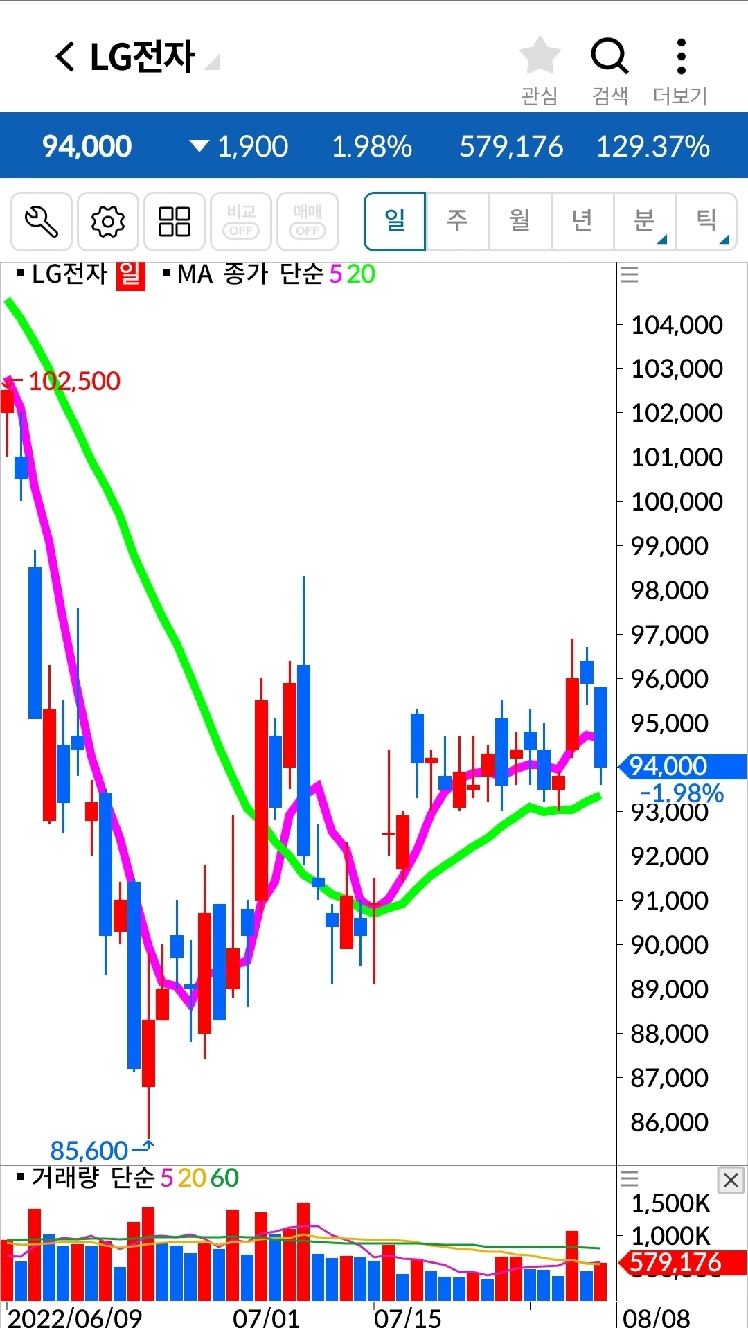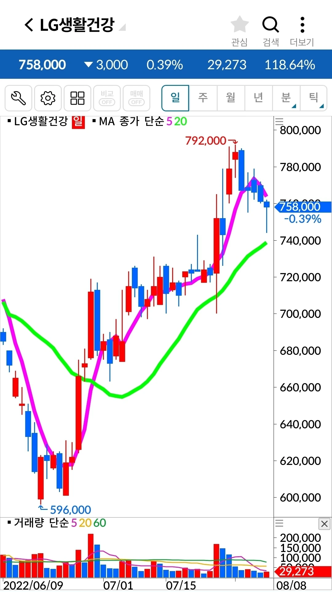 횡보 중 20일 선에 딱 닿았다. 위로 빵! 솟아오르면 좋겠다. 조만간 5일 선이 20일 선을 뚫고 내려오는가 아닌가 눈을 동그랗게 뜨고 지켜보아야 한다.