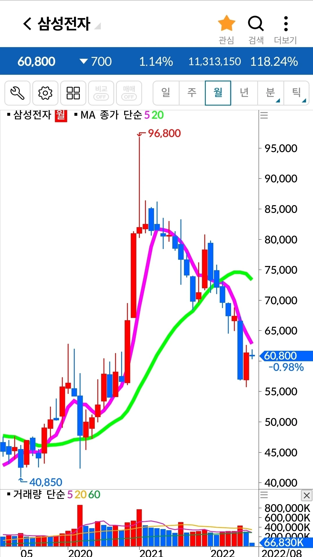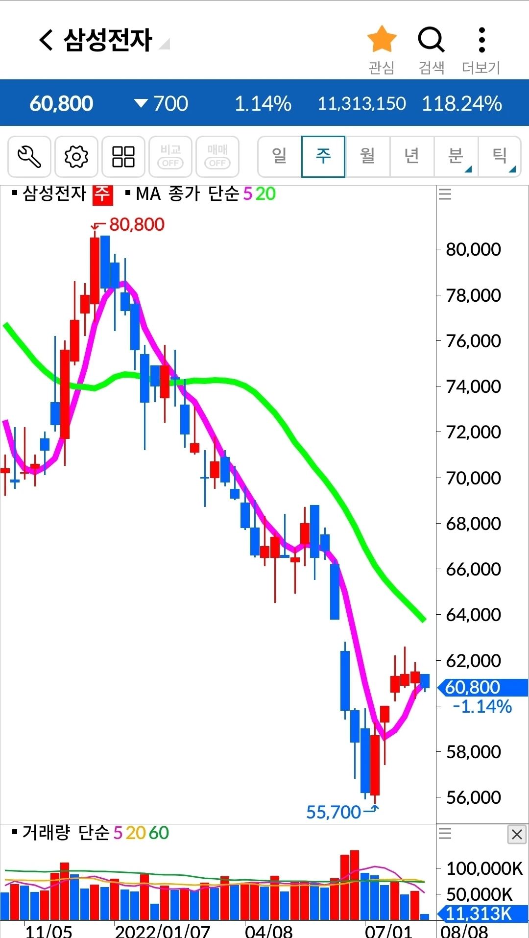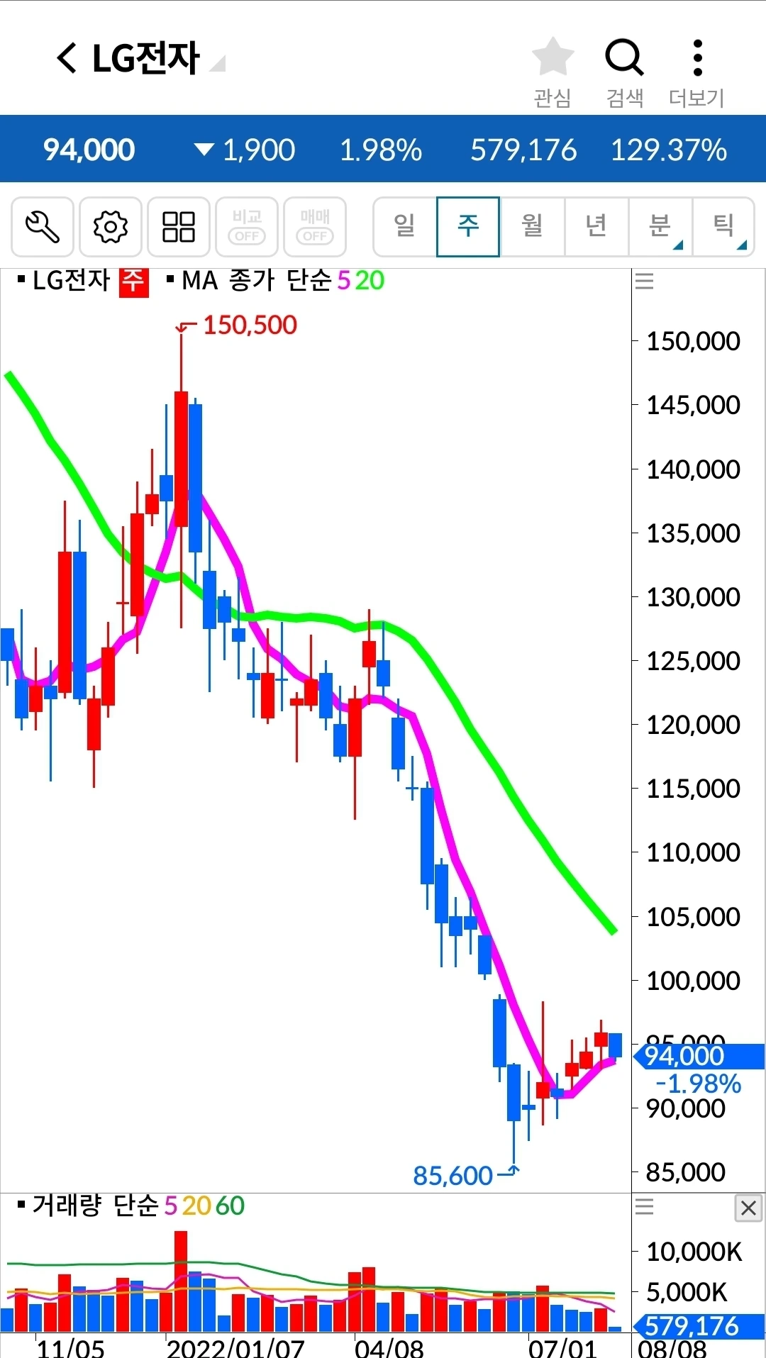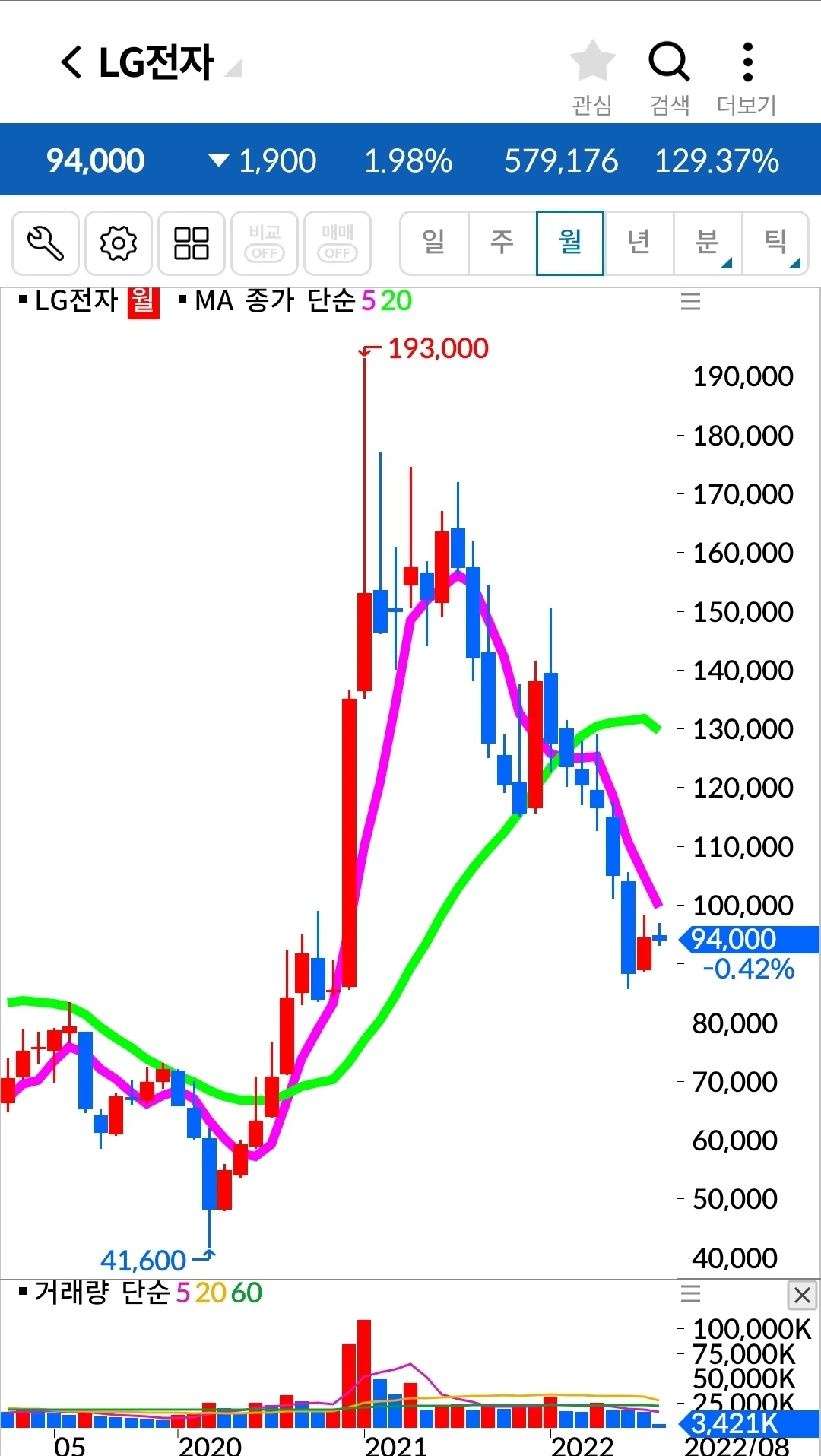횡보 중 20일 선에 딱 닿았다. 위로 빵! 솟아오르면 좋겠다. 조만간 5일 선이 20일 선을 뚫고 내려오는가 아닌가 눈을 동그랗게 뜨고 지켜보아야 한다.