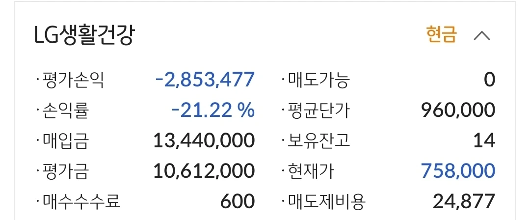 현물 계좌 총자산. 1158만 원. 842만 원 손실 중.