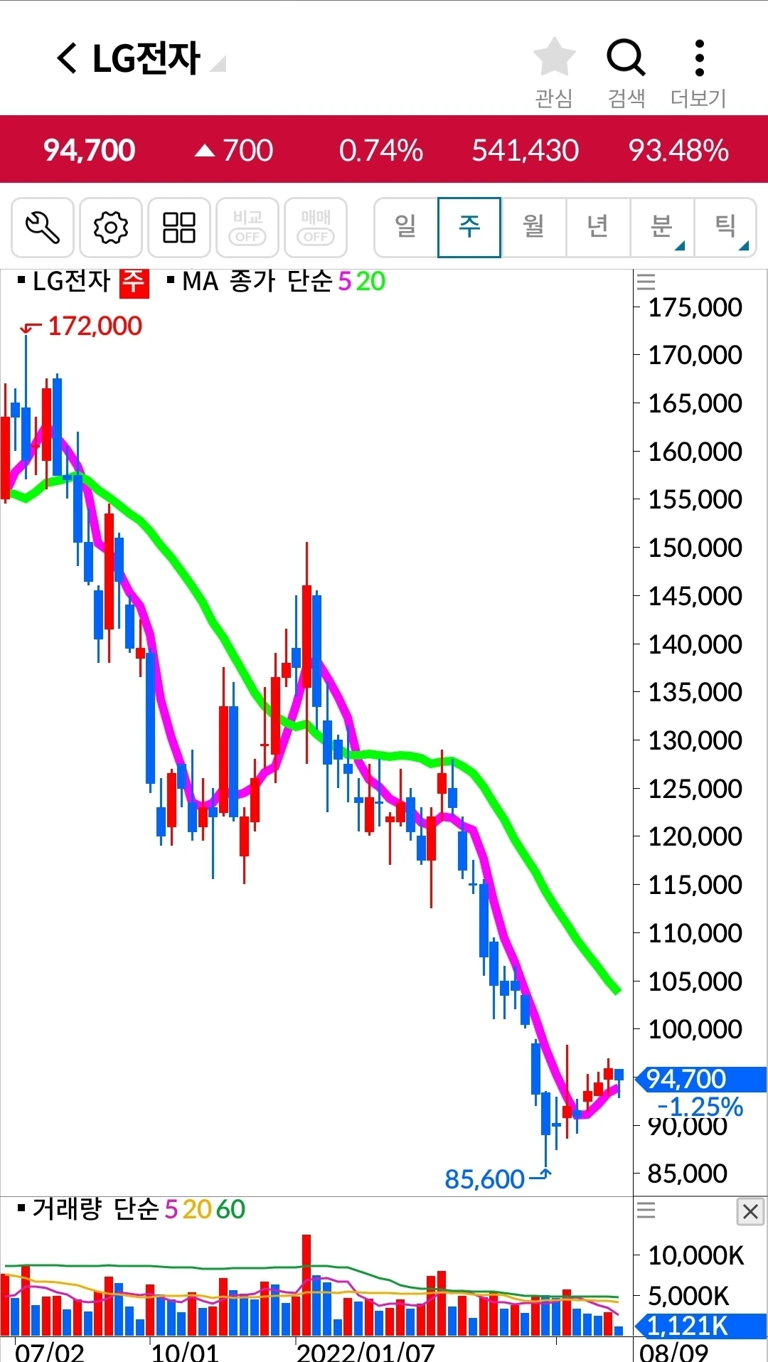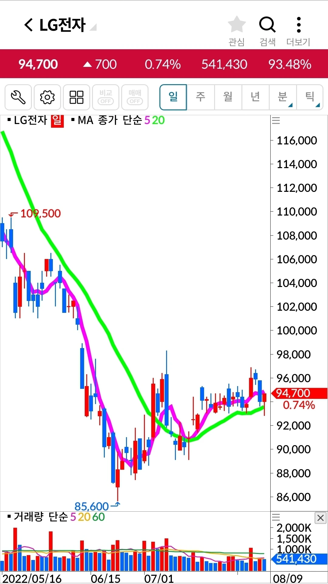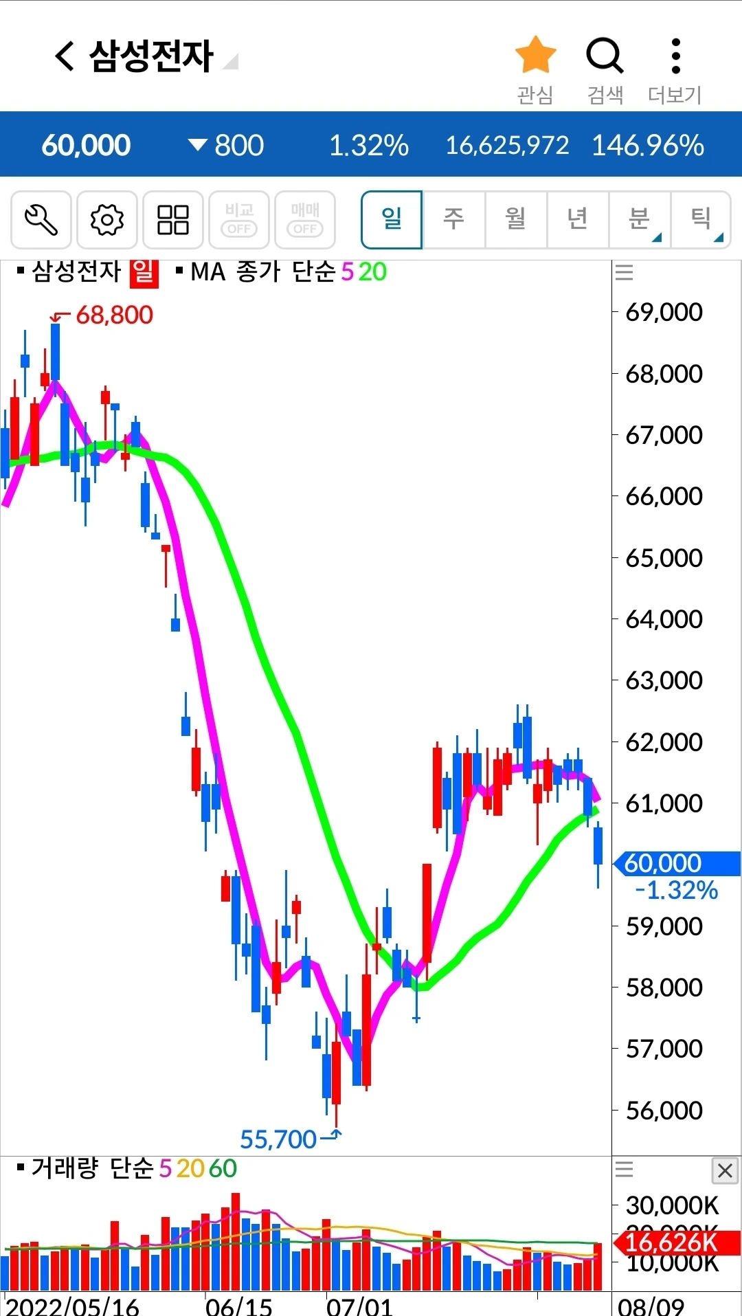오늘 또 가격 하락이 이어진다면 이 차트의 5일 선은 20일선을 아래로 뚫고 내려갈 것 같다. 난 수익 여부는 모른다. 5일 선이 20일선에 닿느냐? 내려가느냐? 만 신경 쓴다. 그것만 난 할 줄 안다. 바로 요거. '난 아무것도 몰라요~ 5일 선이 20일 선 아래로 내려가면 매도할 뿐야요~'