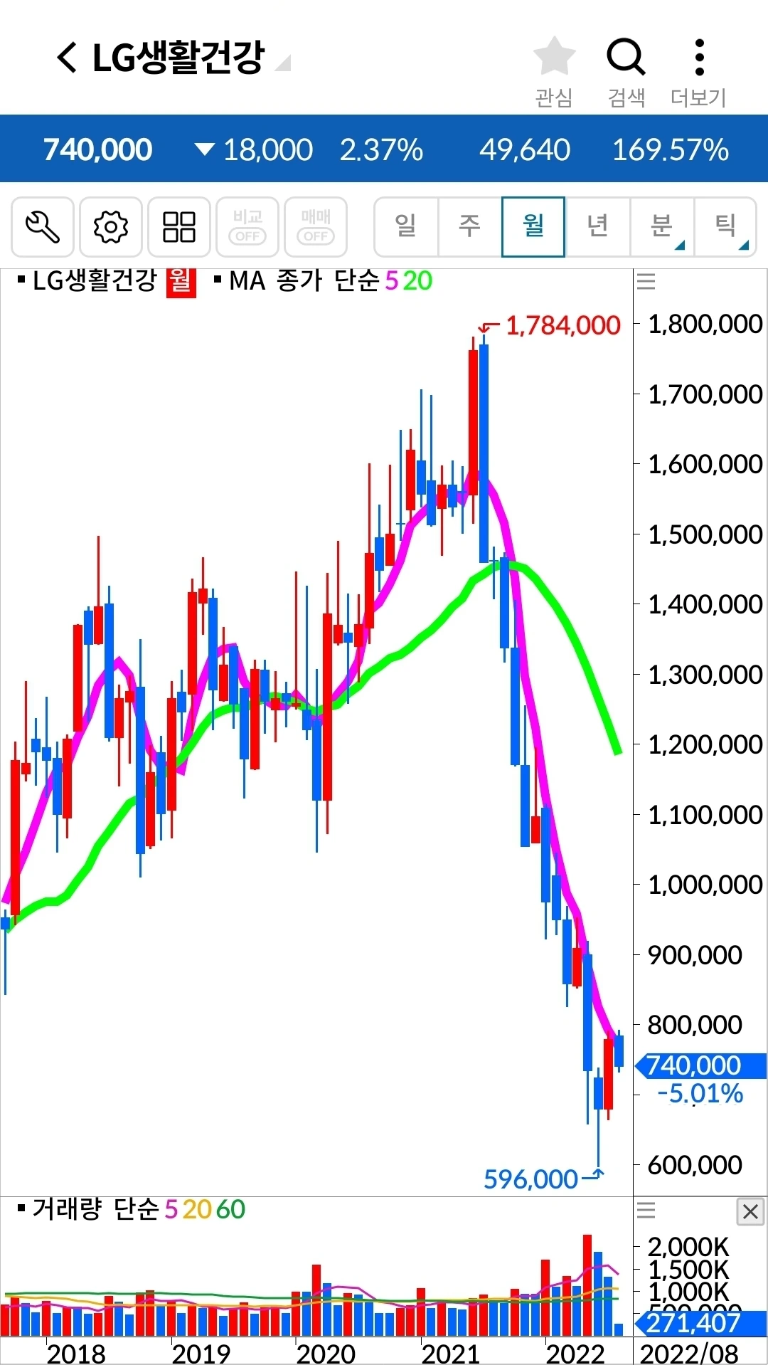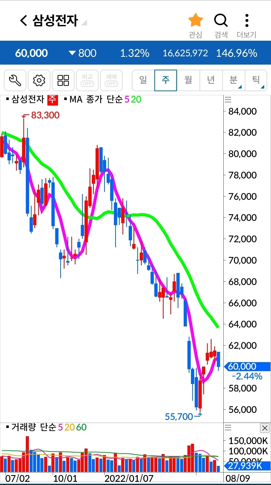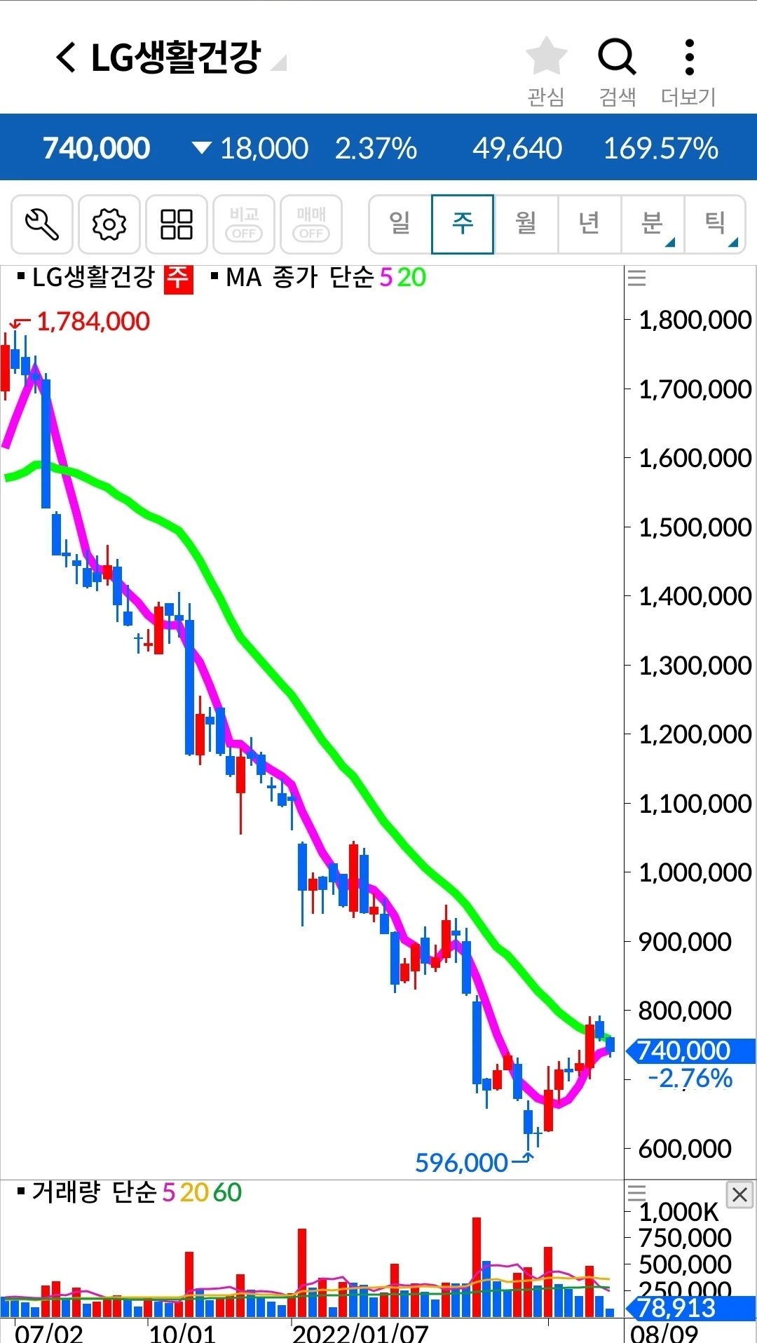 오늘 또 가격 하락이 이어진다면 이 차트의 5일 선은 20일선을 아래로 뚫고 내려갈 것 같다. 난 수익 여부는 모른다. 5일 선이 20일선에 닿느냐? 내려가느냐? 만 신경 쓴다. 그것만 난 할 줄 안다. 바로 요거. '난 아무것도 몰라요~ 5일 선이 20일 선 아래로 내려가면 매도할 뿐야요~'