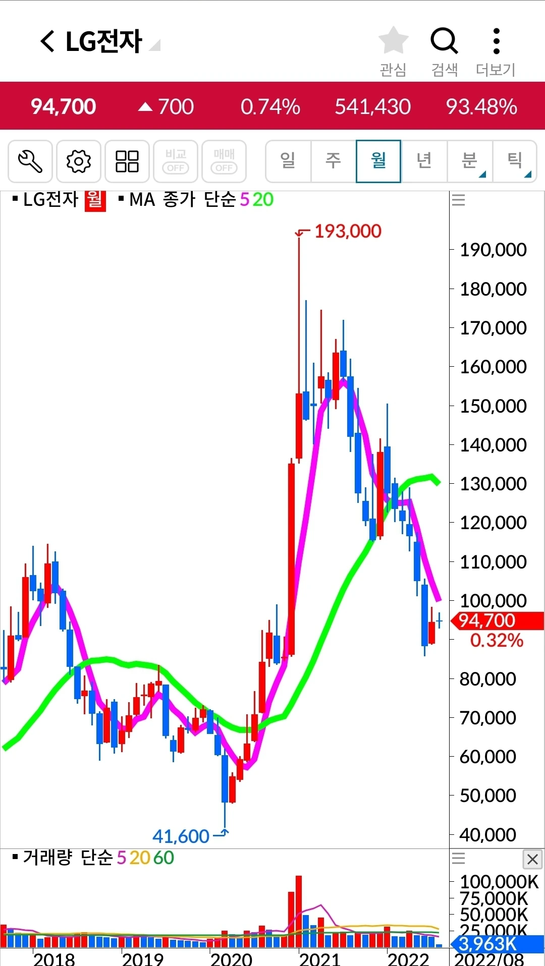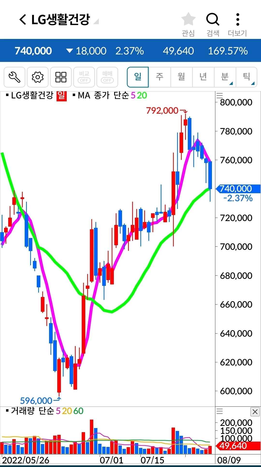 20일 선에 닿고 그래도 양봉이 나와 다행이다. 잘 지켜봐야 한다. 오늘 차트 모양을 보다가 만약 5일 선이 20일선을 뚫고 내려오면 난 무조건 종가에 탈출해야 한다. 파이팅!
