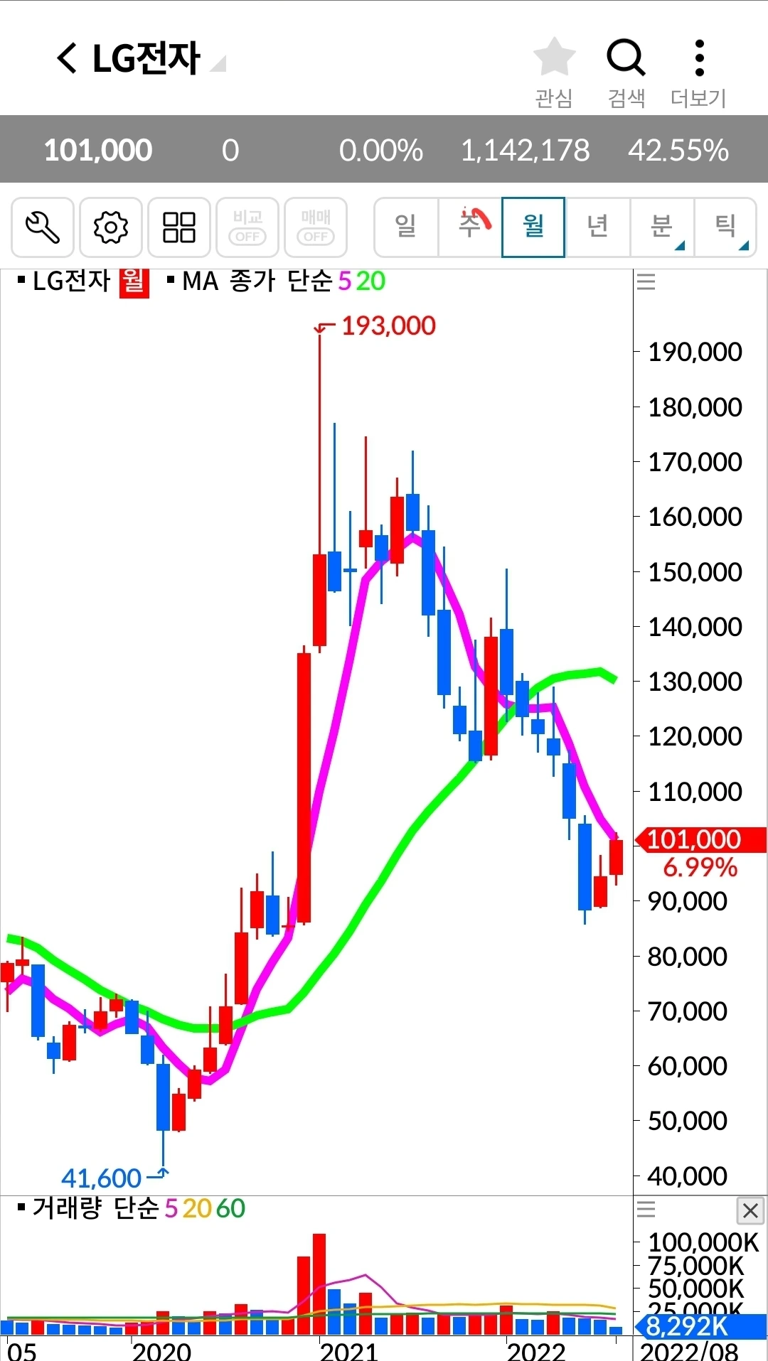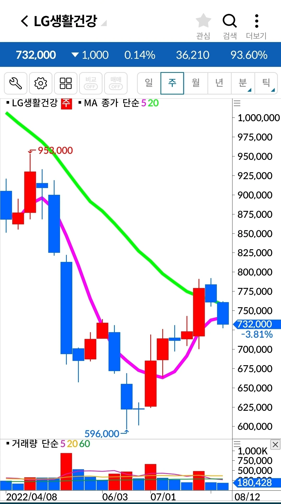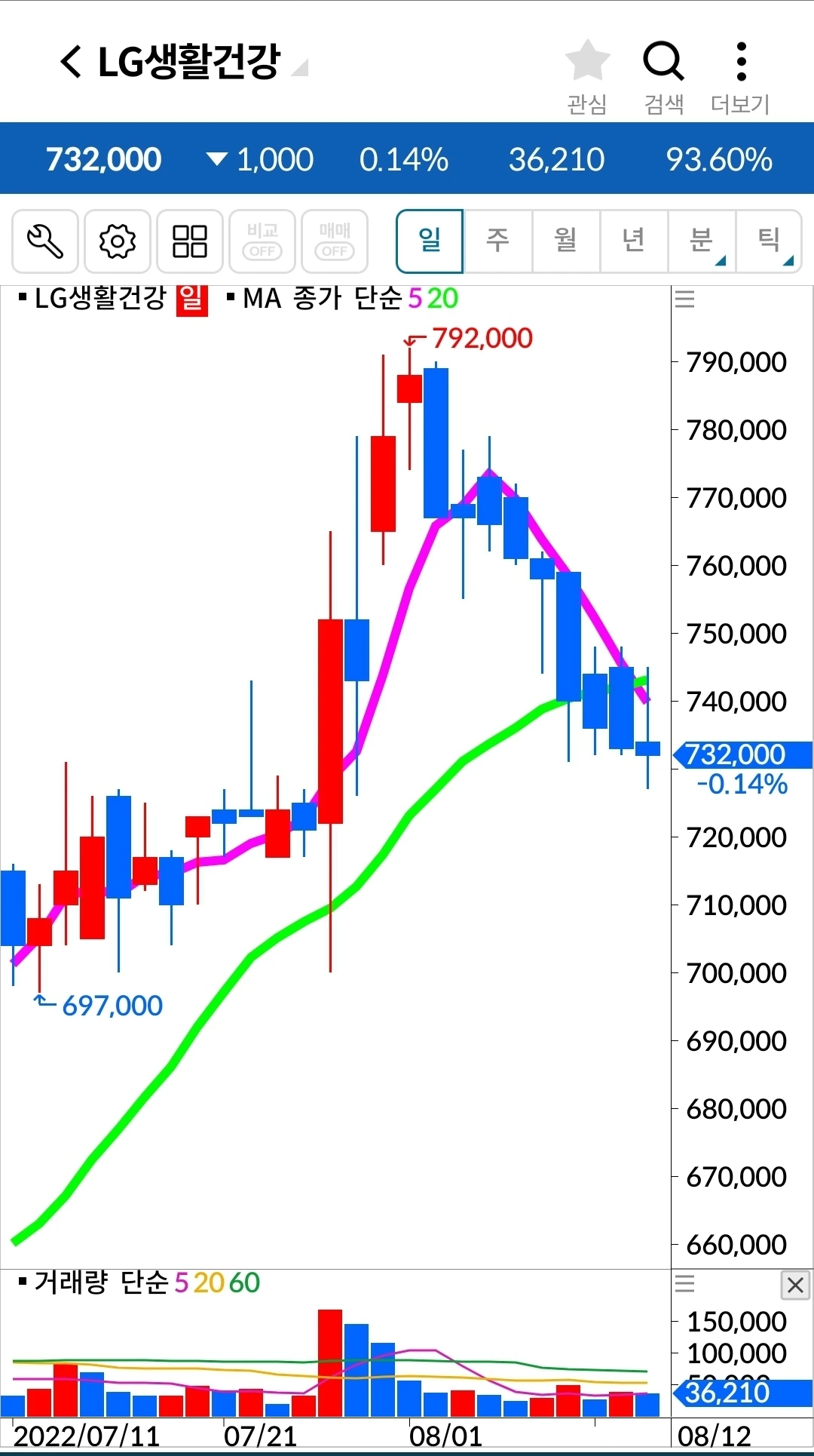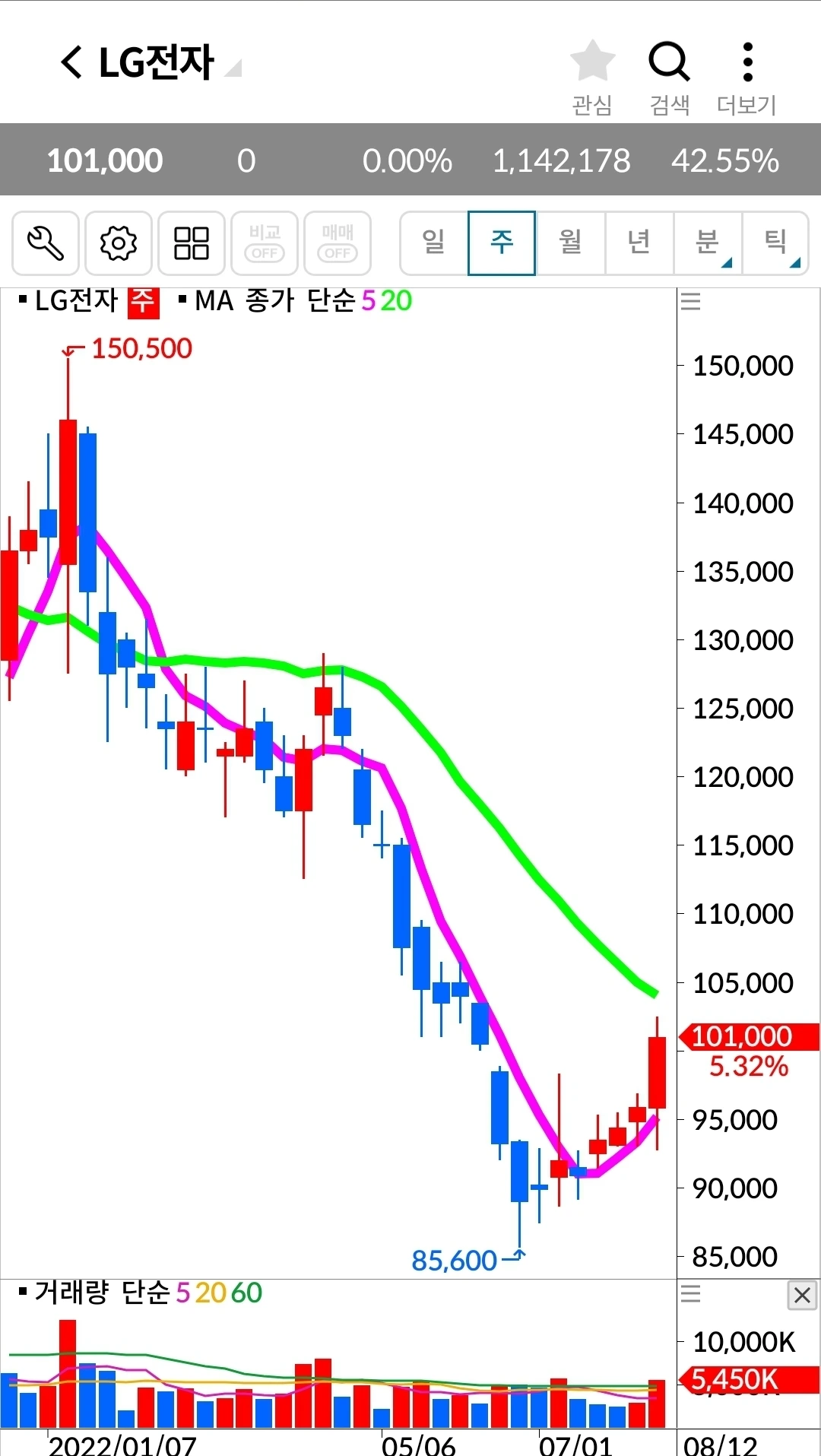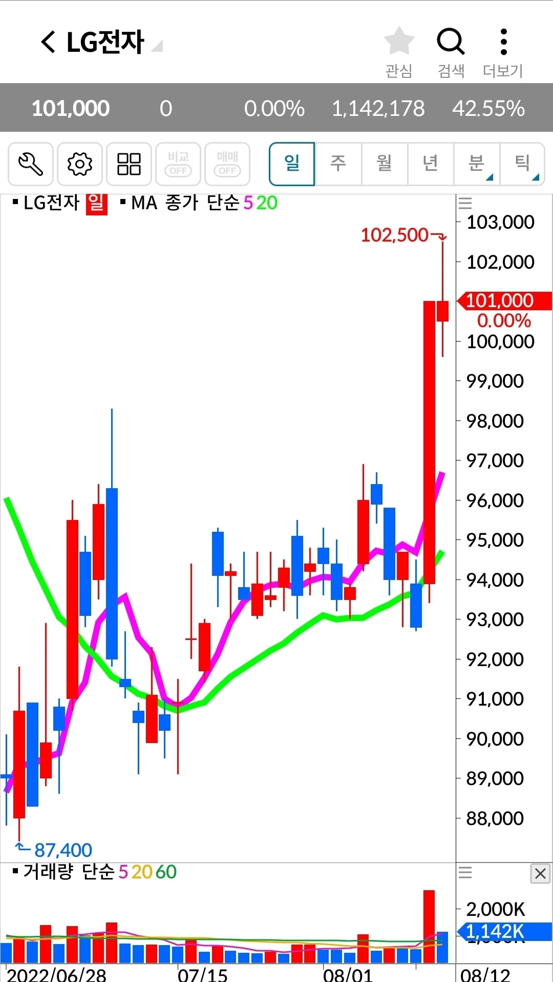 5일 선이 20일 선 위에 있고 기세가 등등하니 엘지전자에서 내가 할 일은 하나 없다. 난 요것만 할 줄 알면 된다. '난 아무것도 몰라요~ 5일선이 20일 선 아래로 내려가면 매도할 뿐야요~'