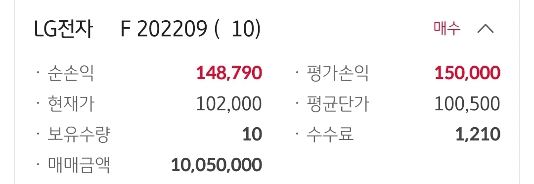 엘지전자 선물. 14만 원 수익 중.
